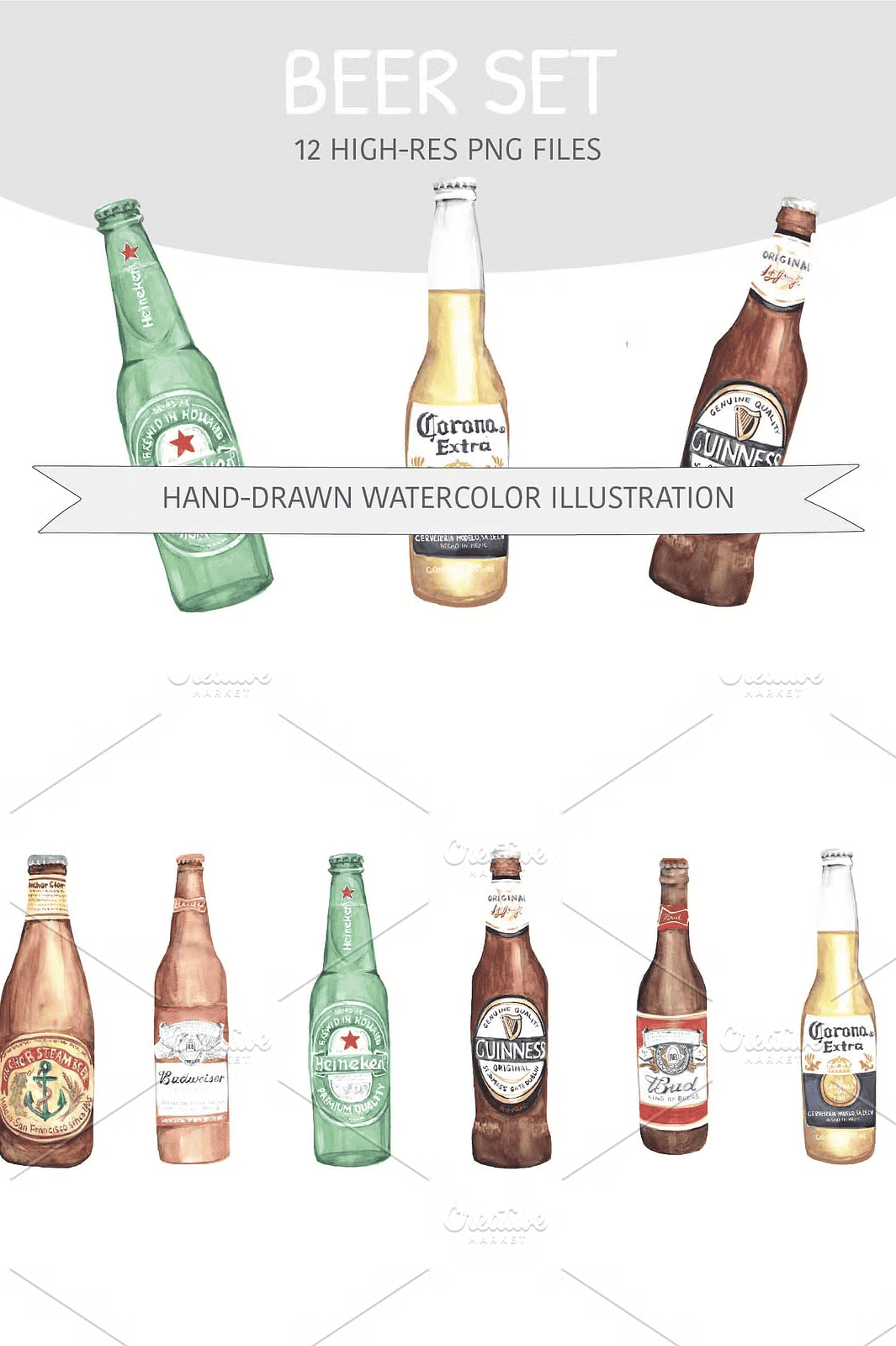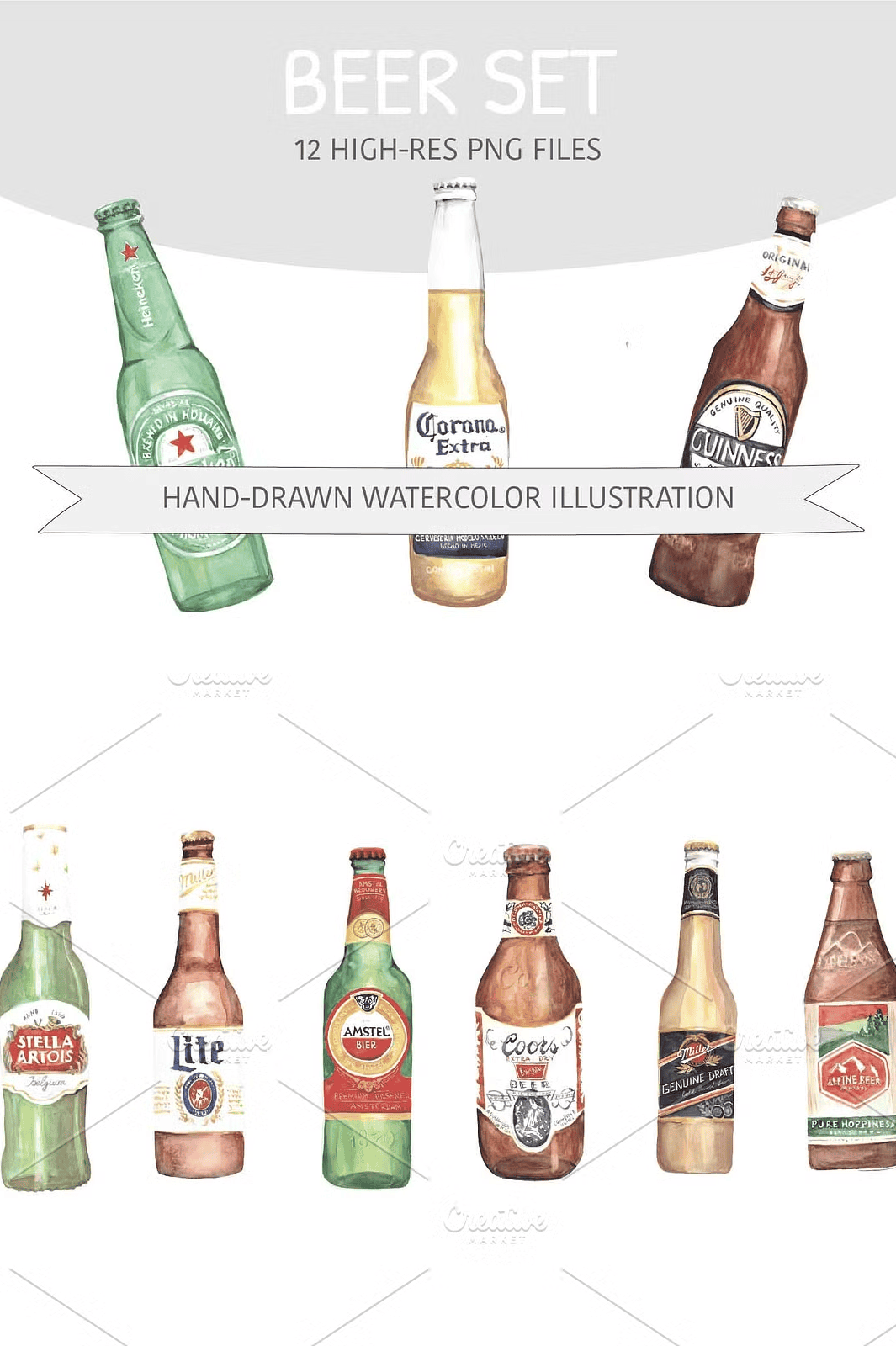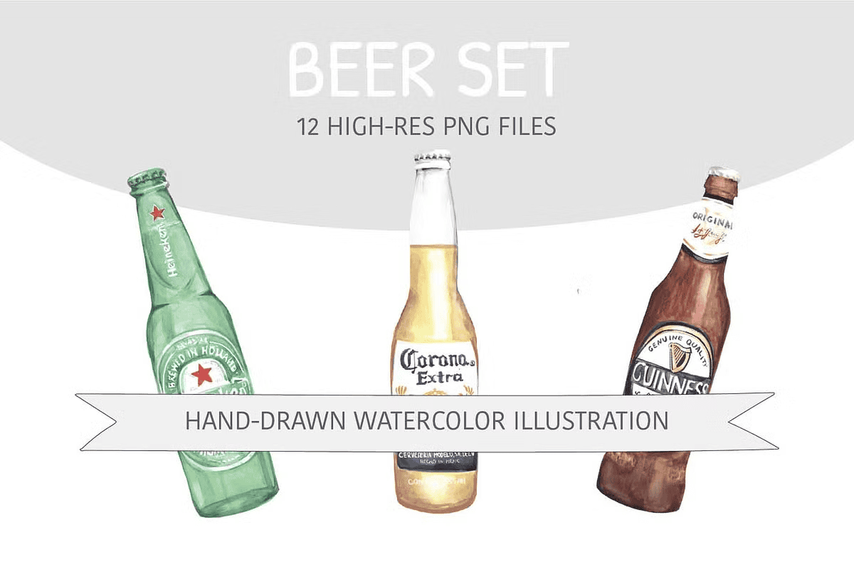 Ignite your design projects with the **Watercolor Beer Bottles Illustrations Set**—a bold and artistic collection of 12 hand-drawn, watercolor-style beer bottle designs. Each illustration captures the unique character of popular brews including Heineken, Guinness, Bud, Coors, and more, rendered with rich textures, natural brush strokes, and authentic fluid color blends. These are not generic stock images—they’re original, expressive artworks made for creative minds who value authenticity, detail, and storytelling.