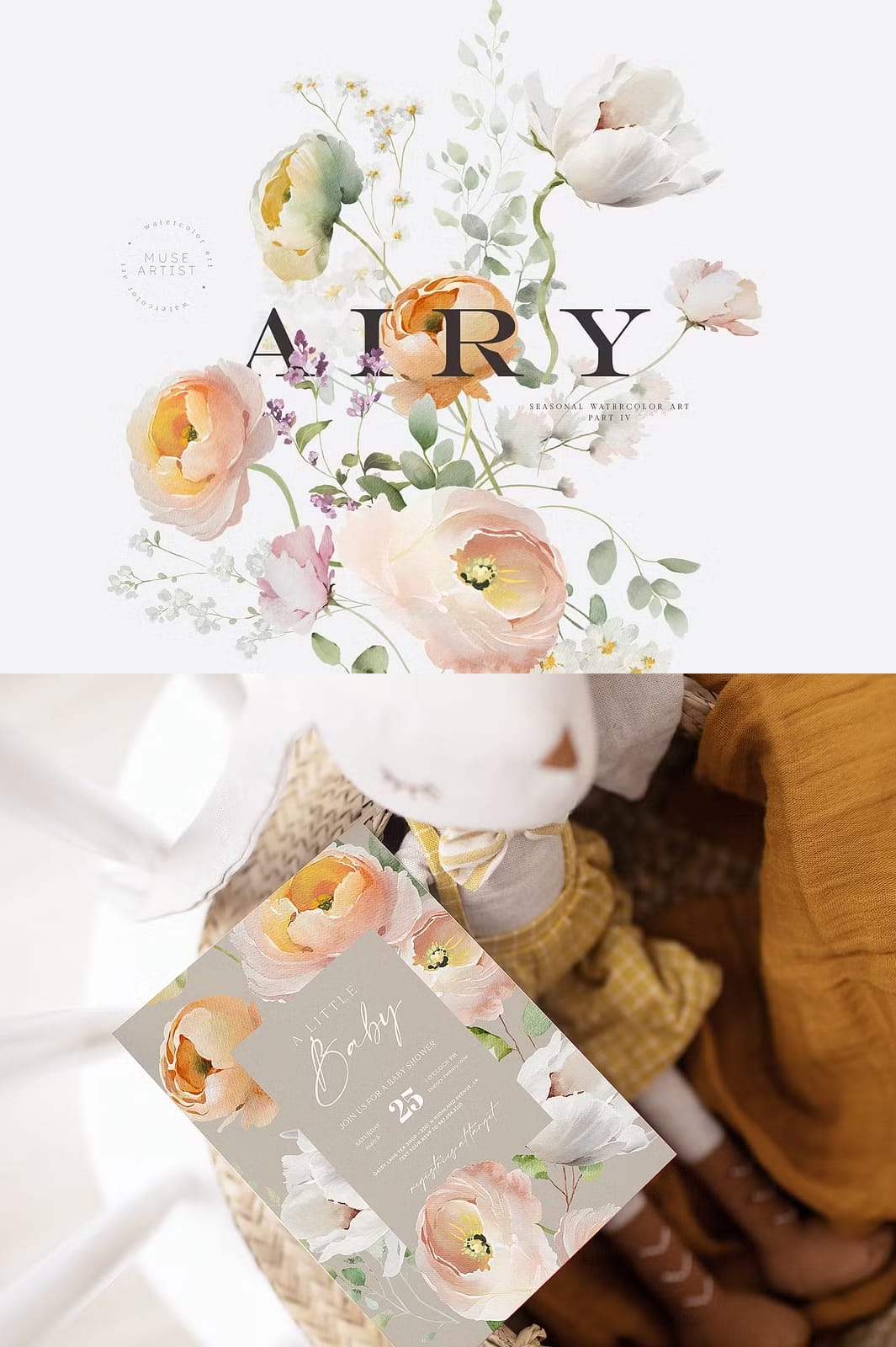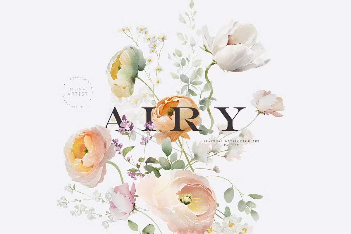 The Airy collection features a diverse range of watercolor florals, each meticulously designed to bring a touch of elegance to your work. Here’s what you can expect:
