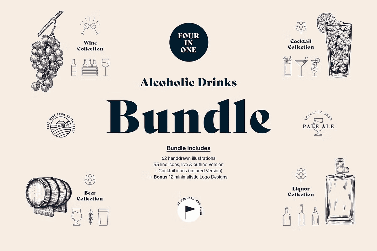 Supercharge your creative projects with the ultimate **Alcoholic Drinks Illustration Bundle**—a meticulously curated collection of 62 high-quality, hand-drawn vector illustrations designed to elevate any bar, restaurant, or lifestyle brand. This is more than just a bundle—it’s your full design arsenal for crafting captivating visuals that command attention and drive engagement.