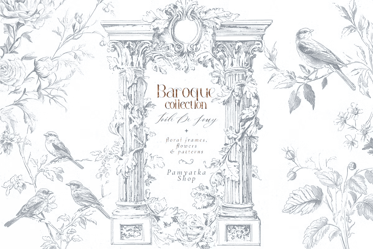 Feel the weight of history and the shimmer of luxury as you explore the **Baroque Collection** — a masterfully crafted digital illustration set inspired by the opulent facades, intricate moldings, and grandiose details of 17th-century Baroque architecture. Every line, curve, and flourish was carefully designed to capture the drama, richness, and theatrical beauty of a golden era where art and architecture rose as one.