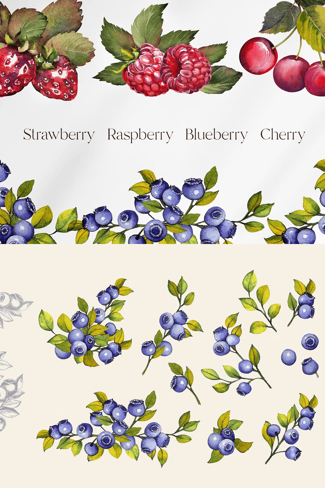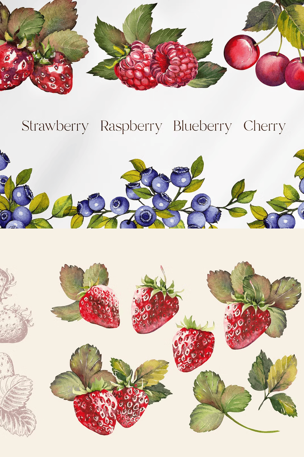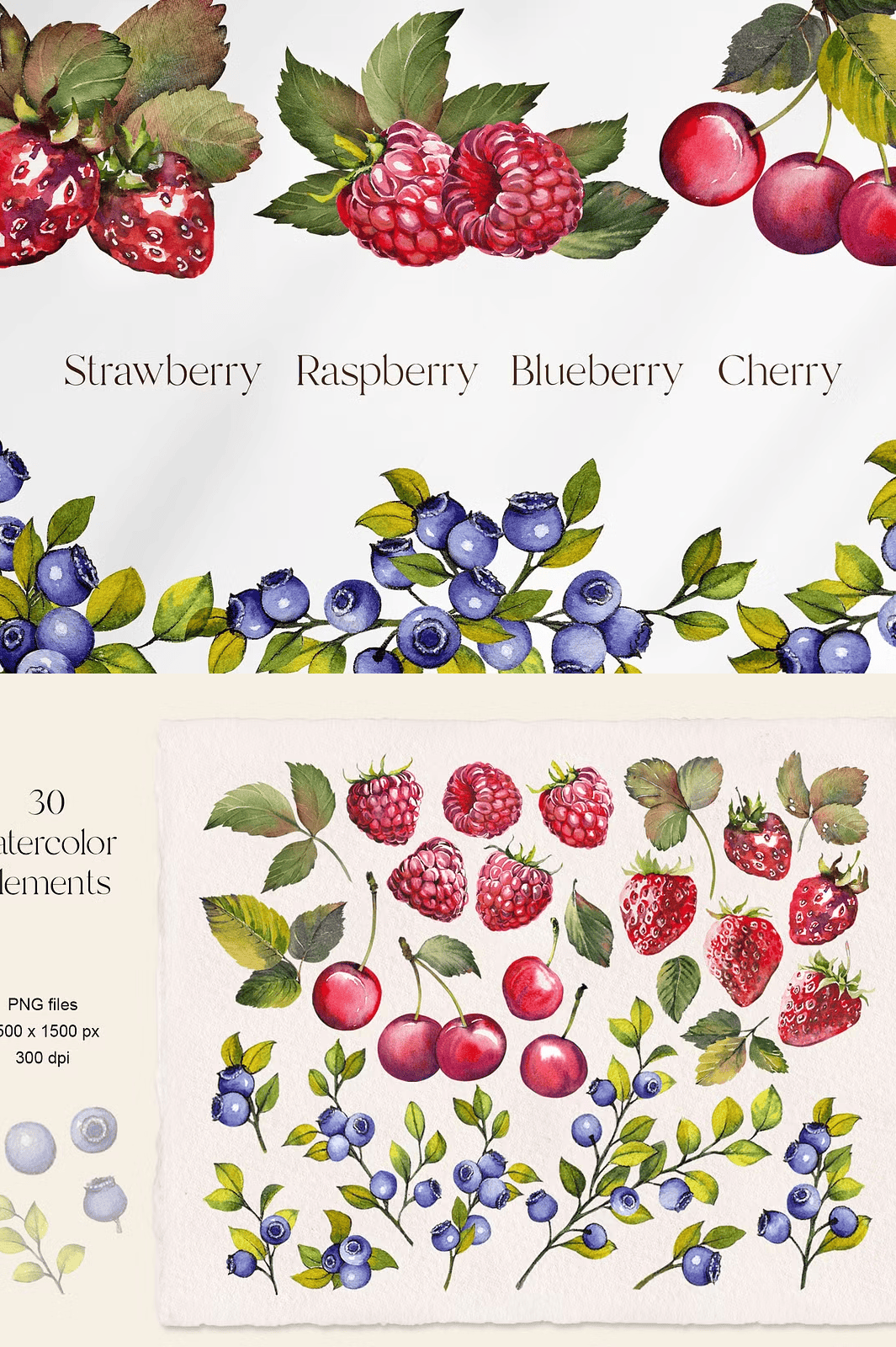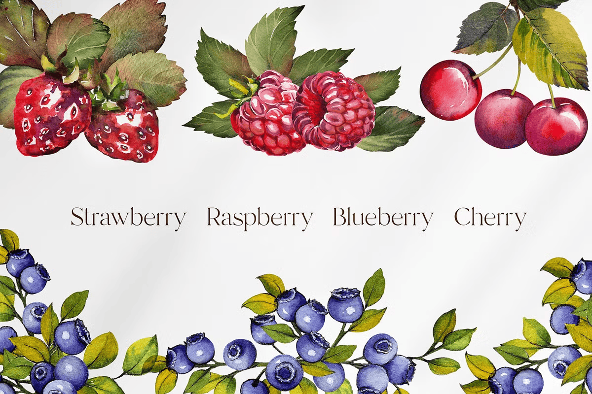 • 30 Watercolor Elements (PNG, 1500 x 1500 px): Each berry is painted with expressive brushstrokes, natural shading, and delicate highlight details—perfect for adding organic texture and warmth to any layout.