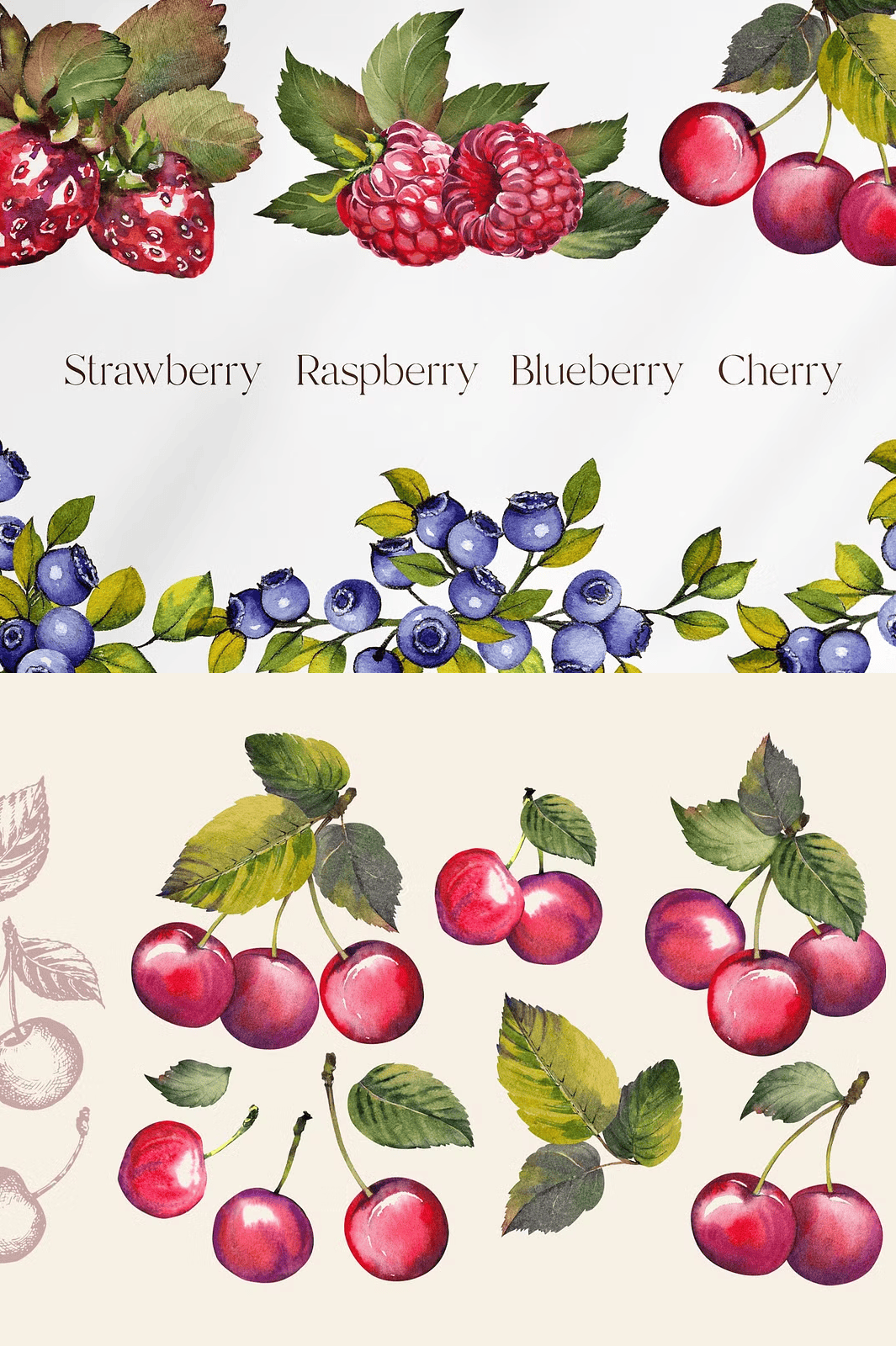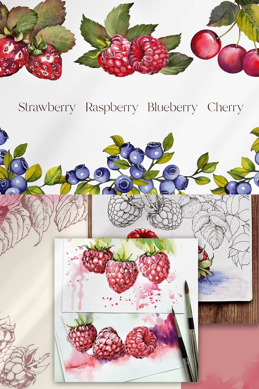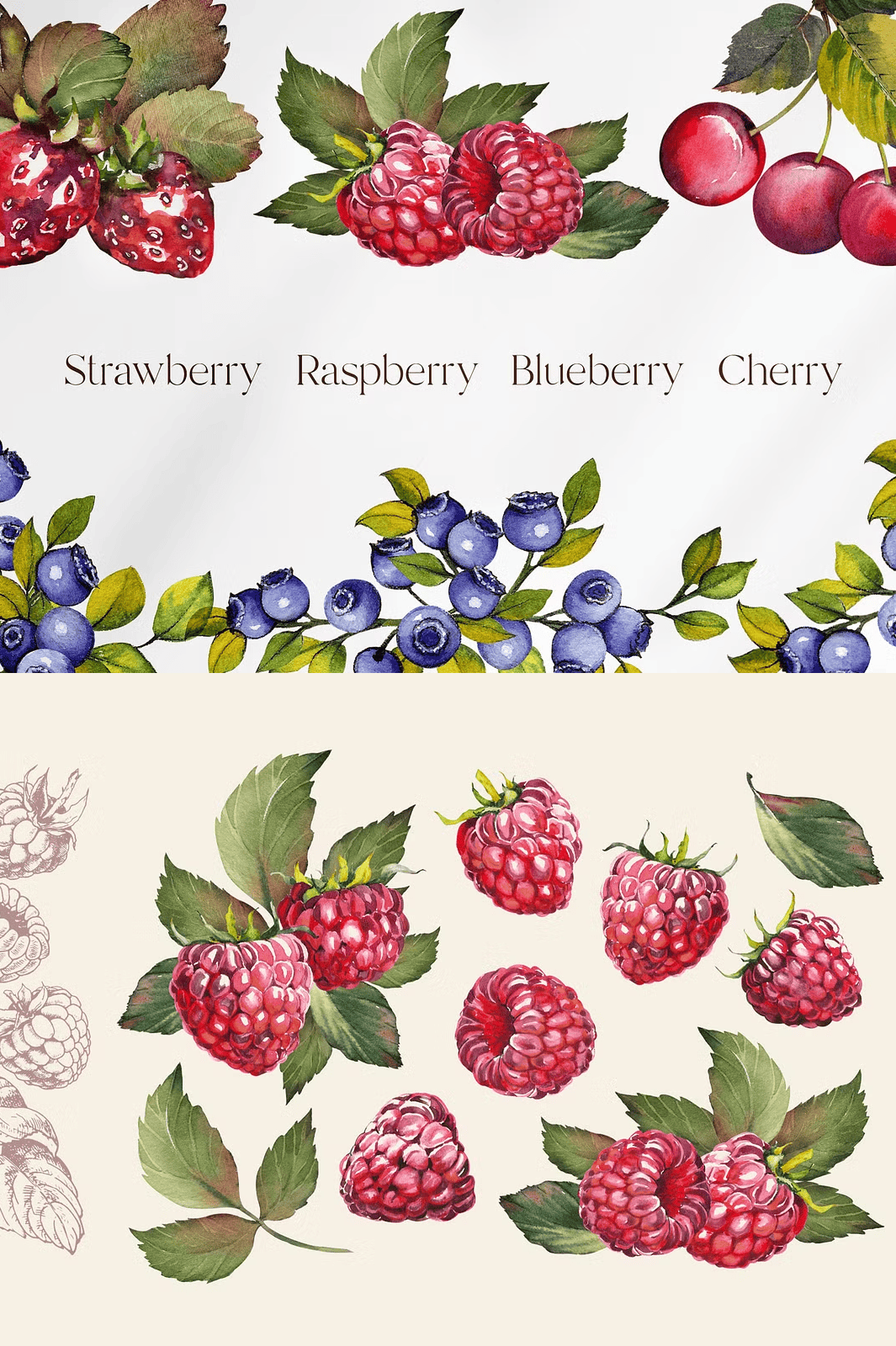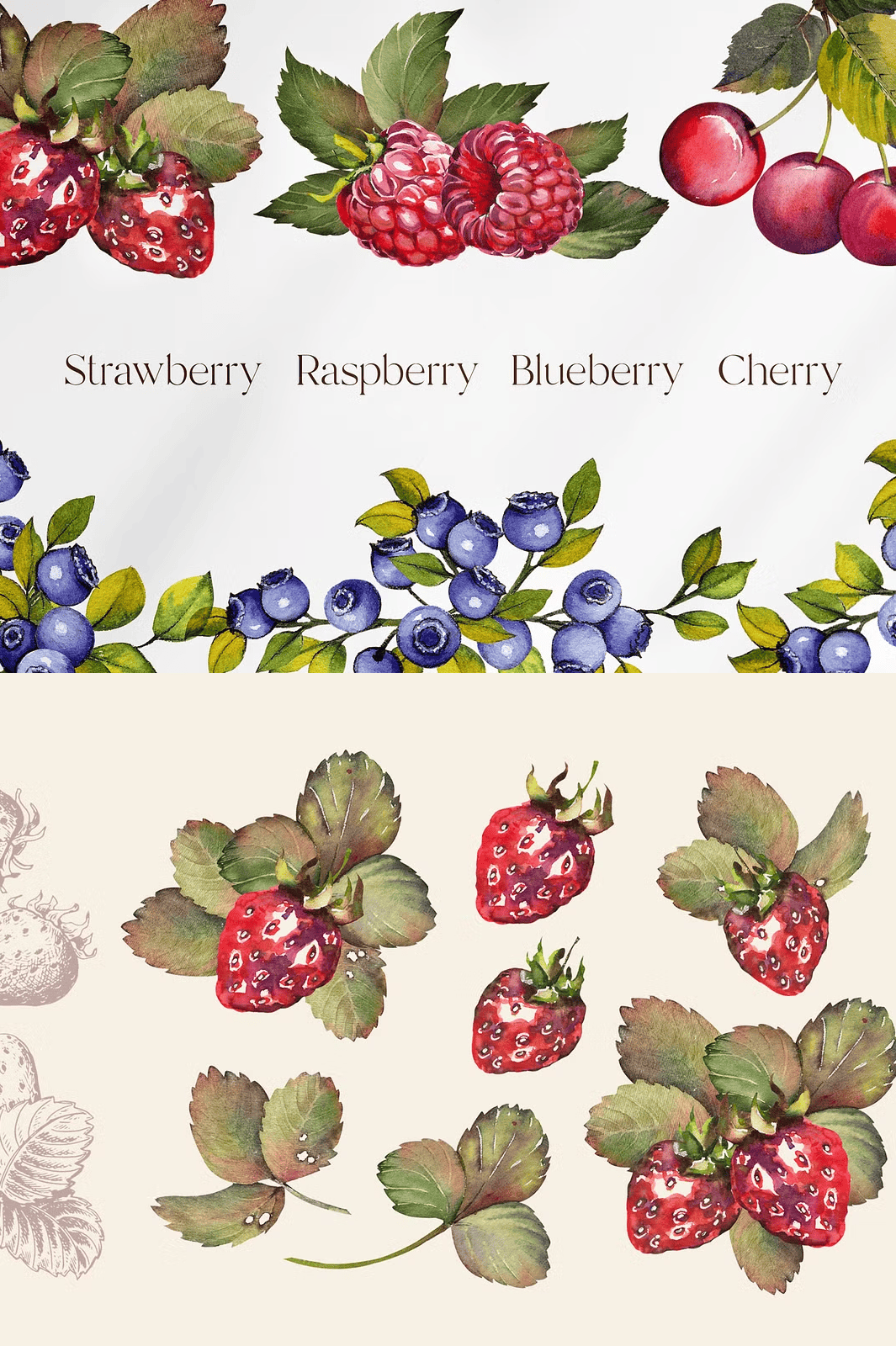 • 30 Watercolor Elements (PNG, 1500 x 1500 px): Each berry is painted with expressive brushstrokes, natural shading, and delicate highlight details—perfect for adding organic texture and warmth to any layout.