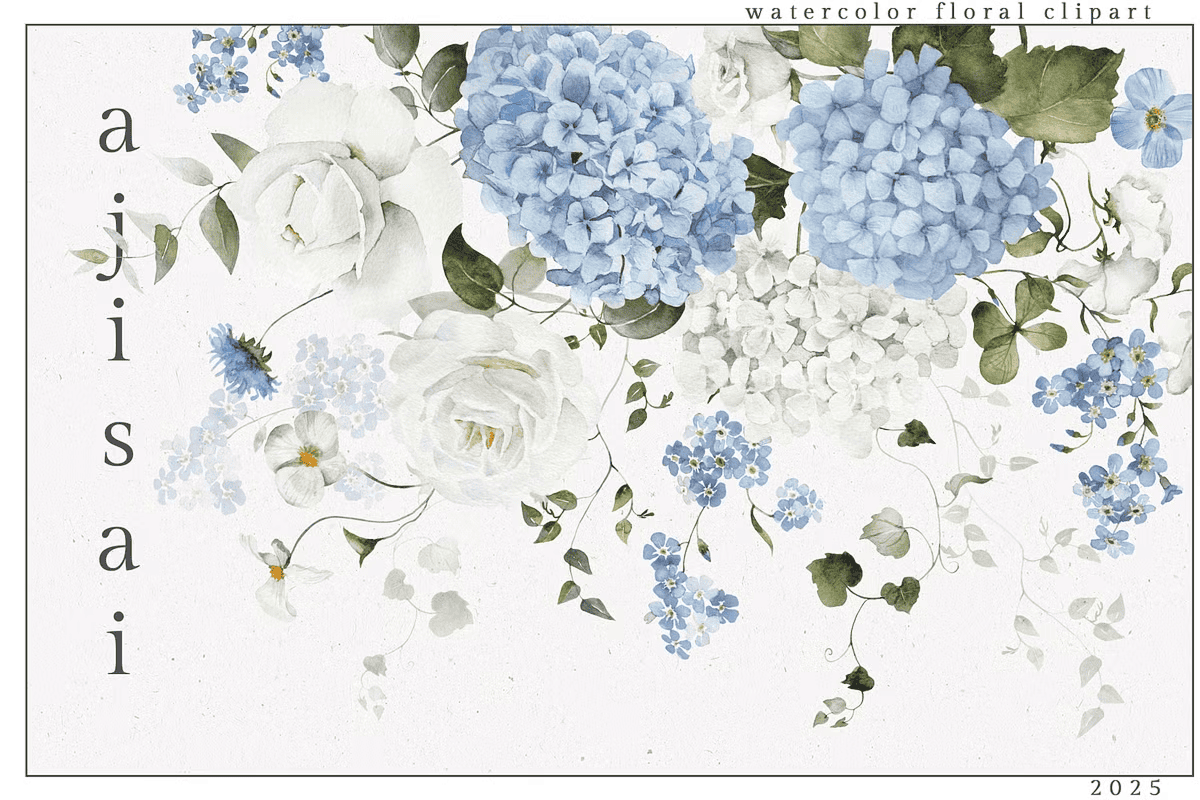 Step into a world of delicate floral artistry with the *Ajisai Watercolor Blue White Flowers Floral Design Set*. Inspired by the graceful Japanese hydrangea, this collection brings tranquil beauty to every creative endeavor. Each element is meticulously hand-drawn with professional precision, capturing the softness of watercolor washes and the subtle depth of brushstrokes. From lush bouquets to intricate borders, every design radiates purity, grace, and natural harmony—perfect for creators seeking authenticity and visual sophistication.