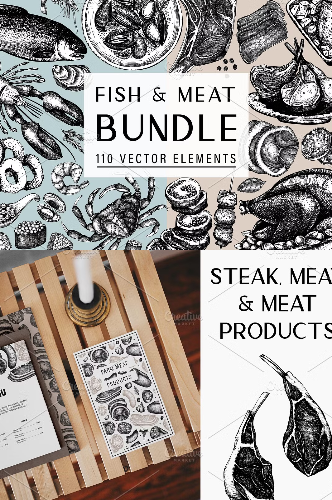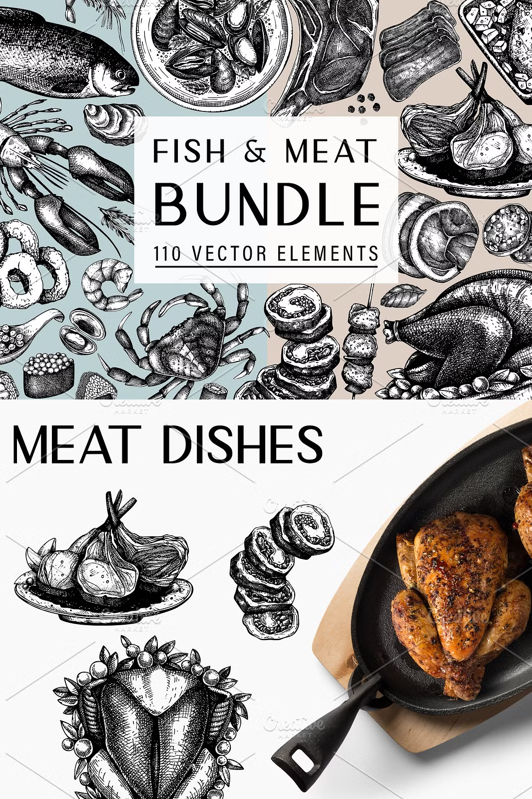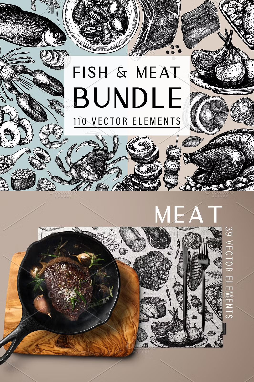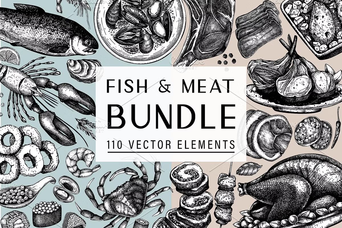 - βοΈ **100+ Hand-Drawn Vector Illustrations** β Includes cuts of meat, fish, seafood, and culinary accents.