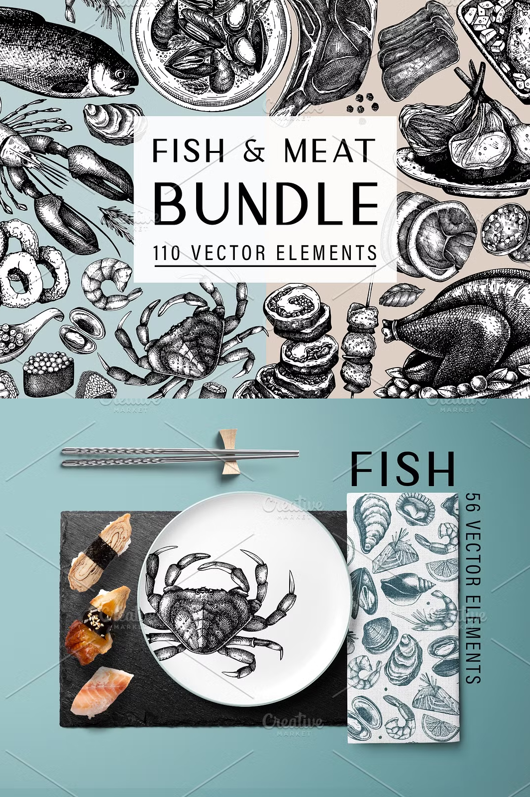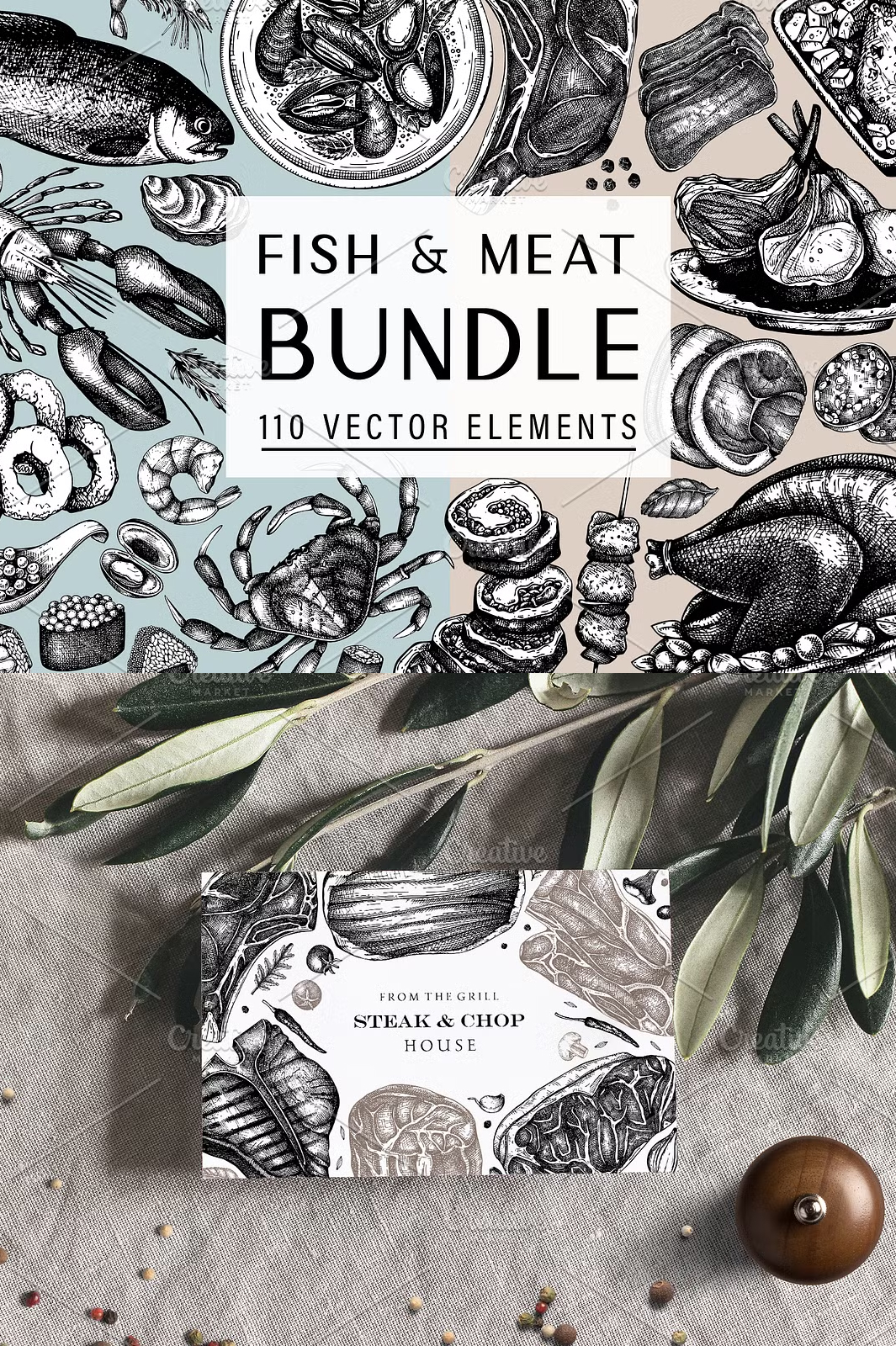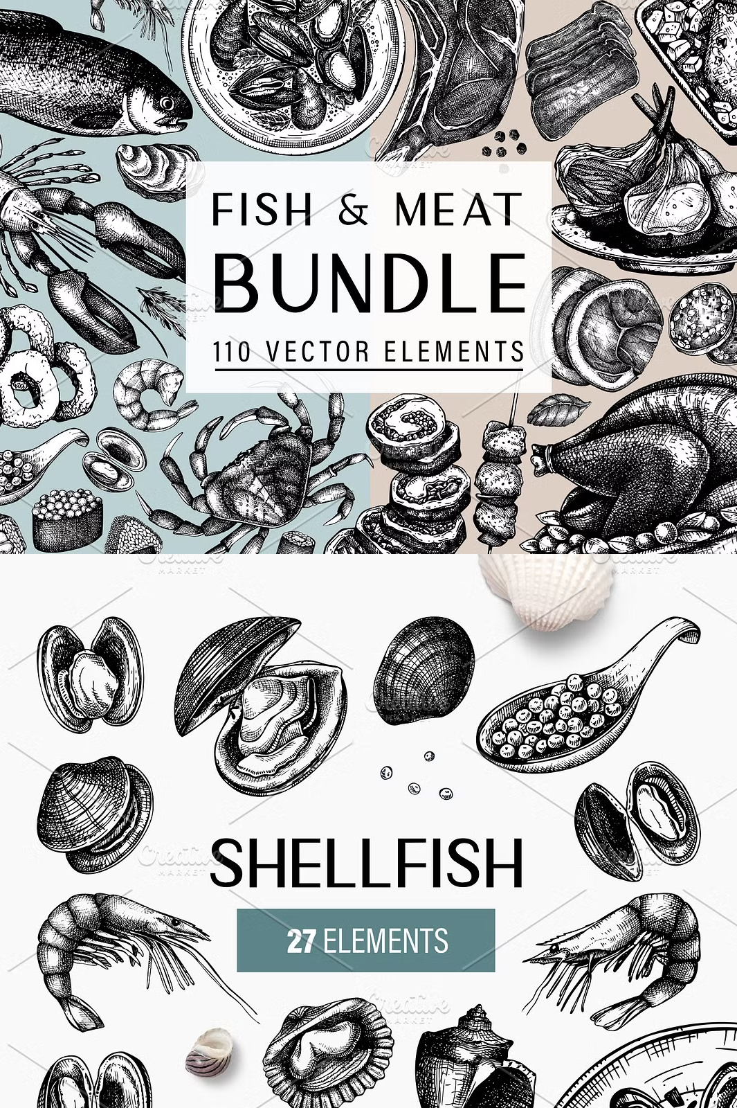 - βοΈ **100+ Hand-Drawn Vector Illustrations** β Includes cuts of meat, fish, seafood, and culinary accents.