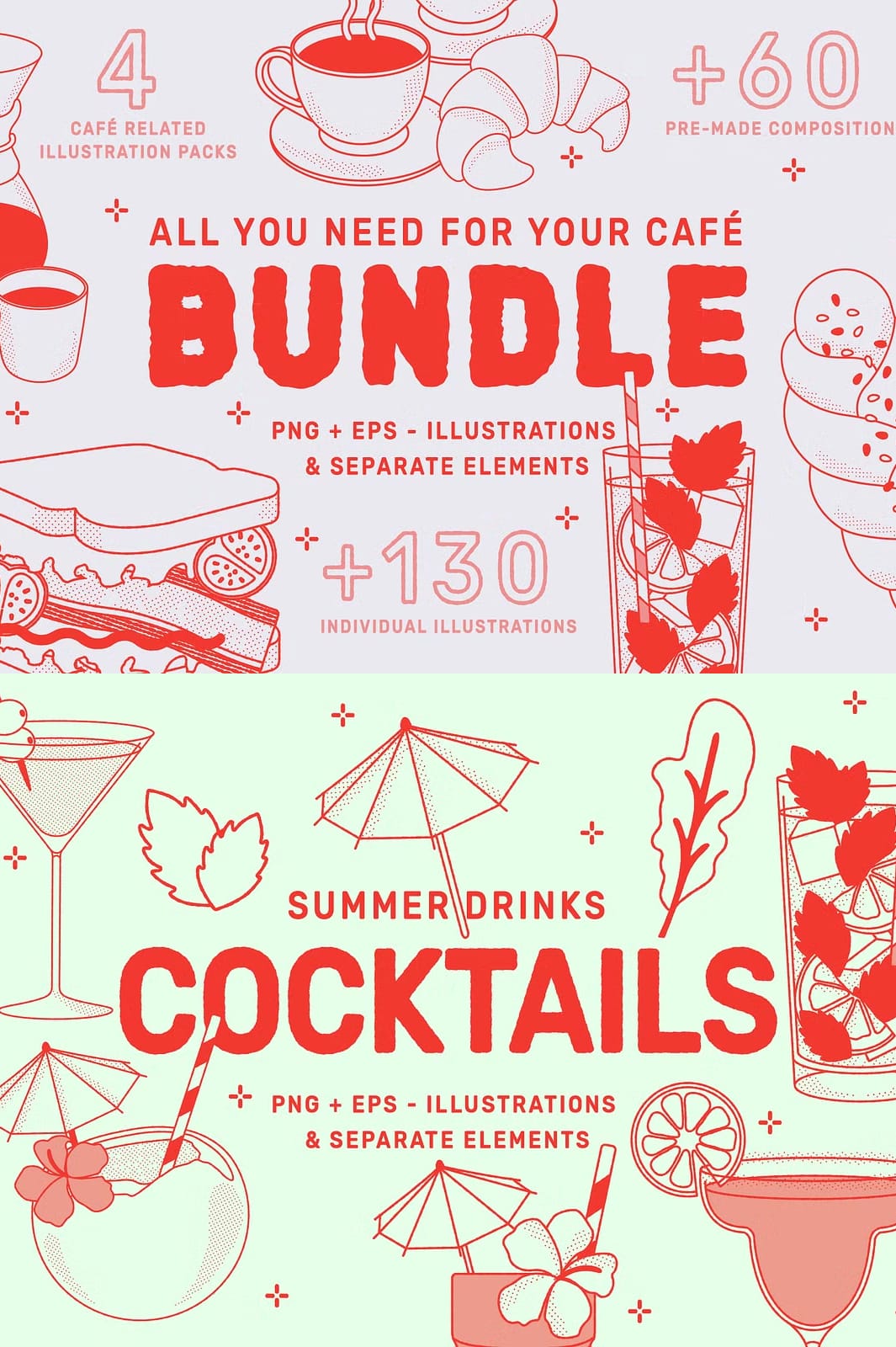 This bundle includes more than 130 separate and finely detailed object illustrations representing the best elements of café culture and cuisine. Whether you need sandwiches, baked goods, coffee cups, or summer cocktails, each image is ready to enhance your branding or creative projects with authenticity and style.