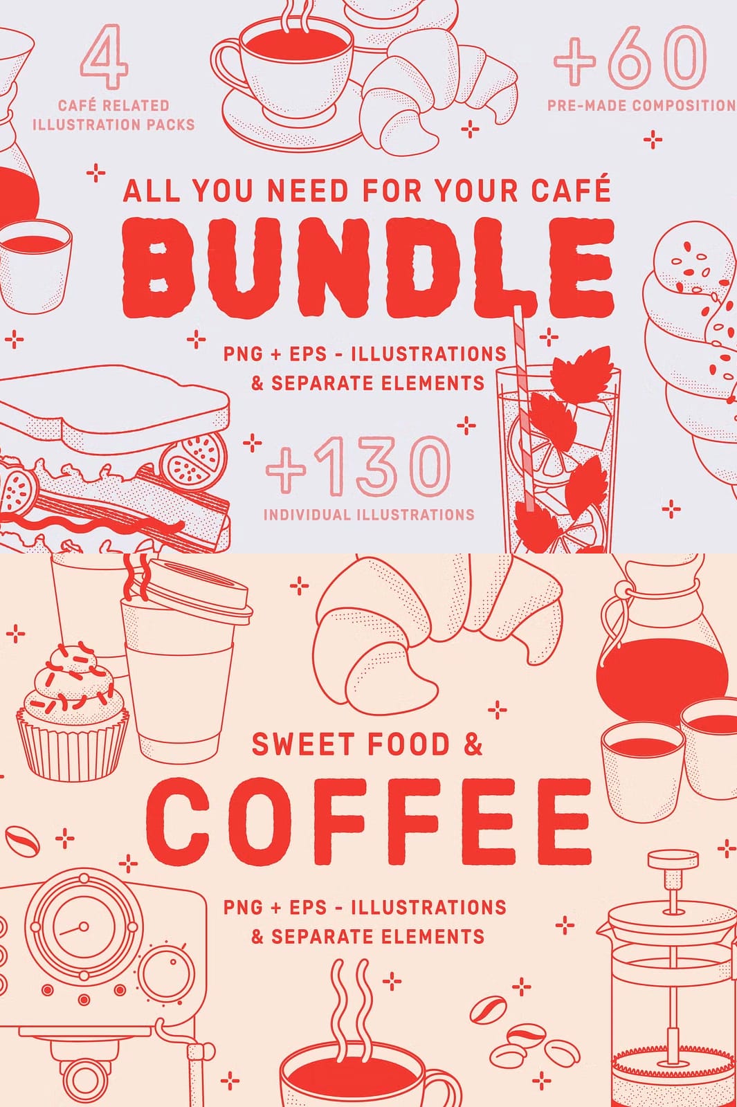 Are you planning to open a café, or perhaps you have a passion for exploring the most unique cafés and reviewing their coffee offerings? Or maybe you simply need high-quality café-themed illustrations for your creative projects? Look no further! This comprehensive bundle provides everything you need to bring your food and beverage concepts to life with vibrant, hand-crafted designs.
