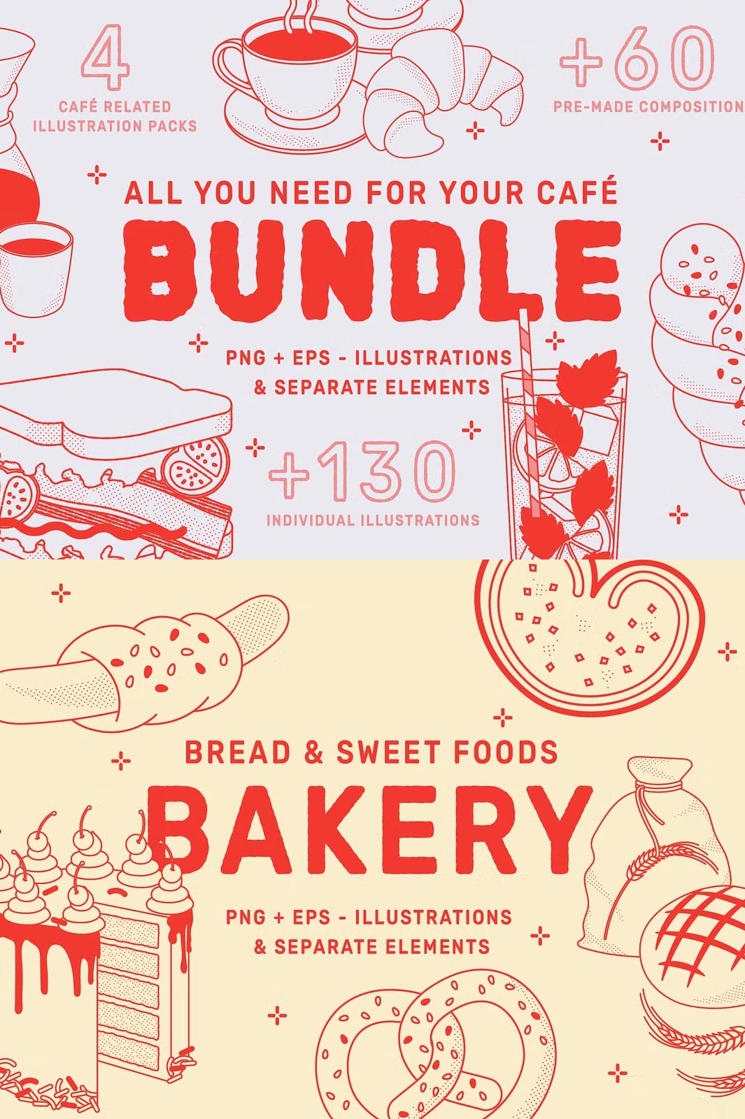 Save time and effort with over 60 pre-designed compositions crafted by professional illustrators. These compositions are perfect for creating eye-catching menu templates, promotional materials, and branding elements that encapsulate the spirit of hospitality and gourmet food.