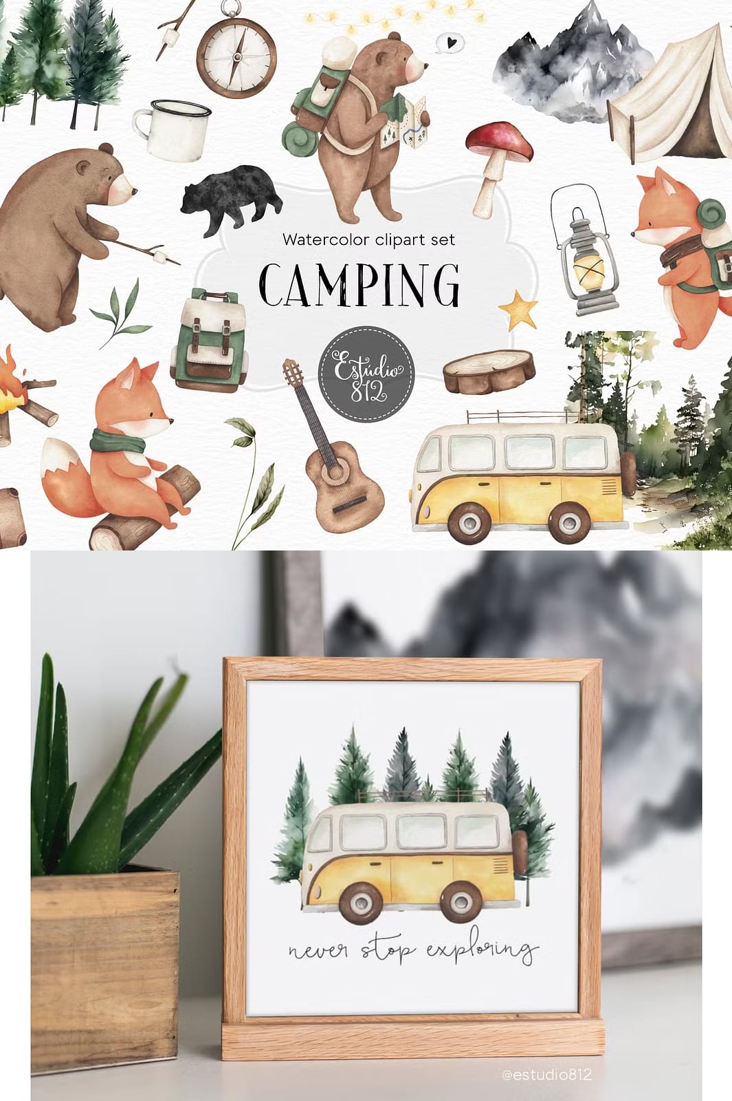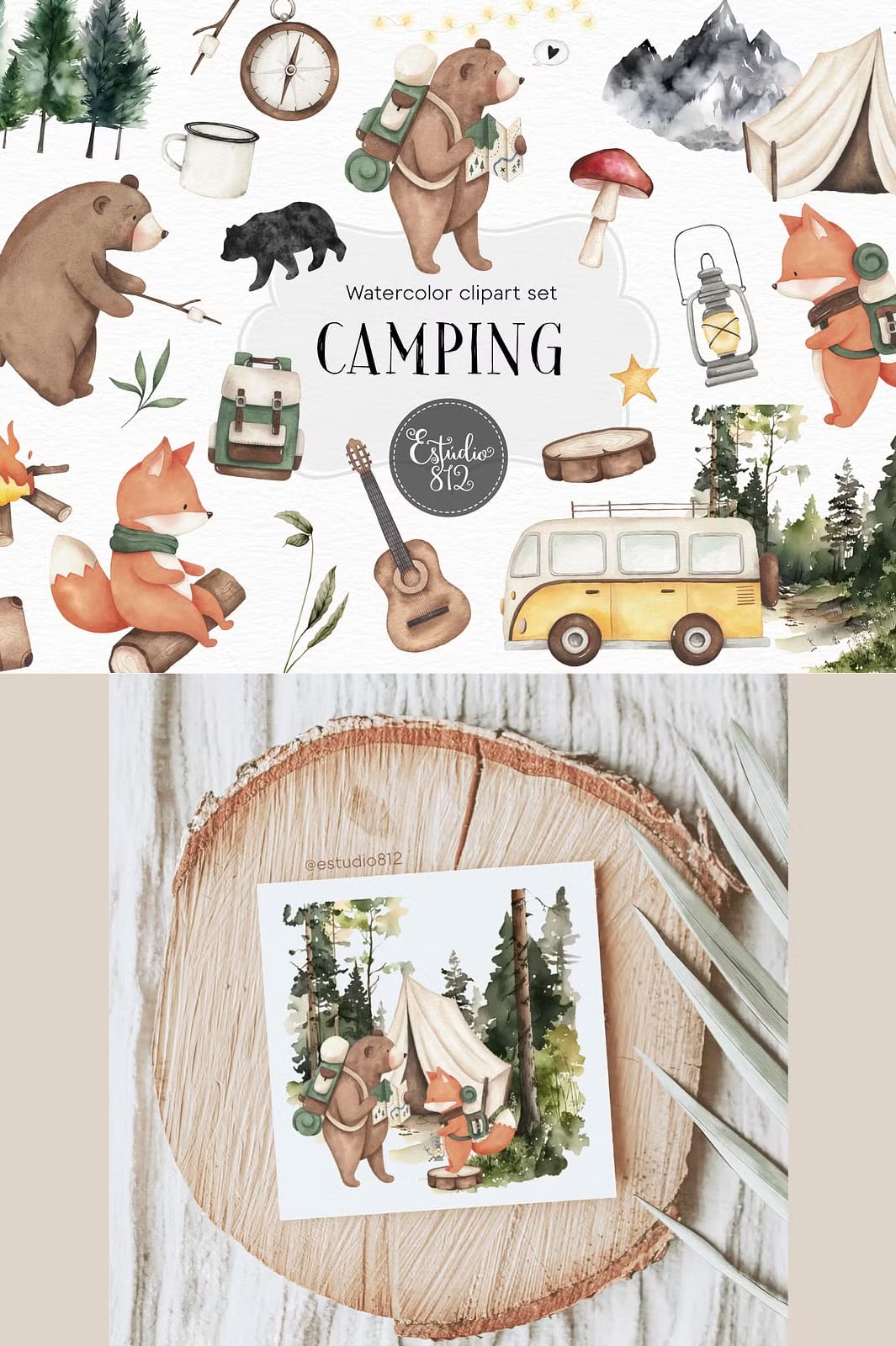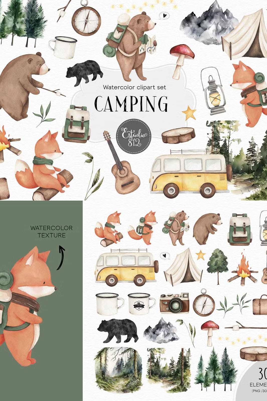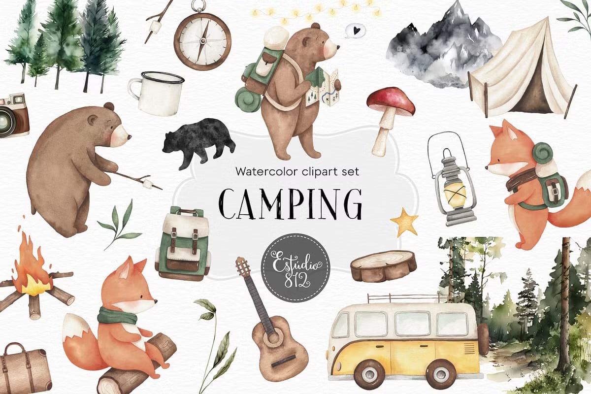 The Camping Watercolor Set offers a versatile collection of 30 beautifully hand-painted watercolor illustrations perfect for anyone seeking a nature-inspired creative boost. Every element is crafted with care at 300 dpi resolution, supplied as PNG files with transparent backgrounds to facilitate effortless integration into your designs. This set is a wonderful resource for enhancing invitations, scrapbooks, cards, posters, and countless other visual projects with a charming camping theme.
