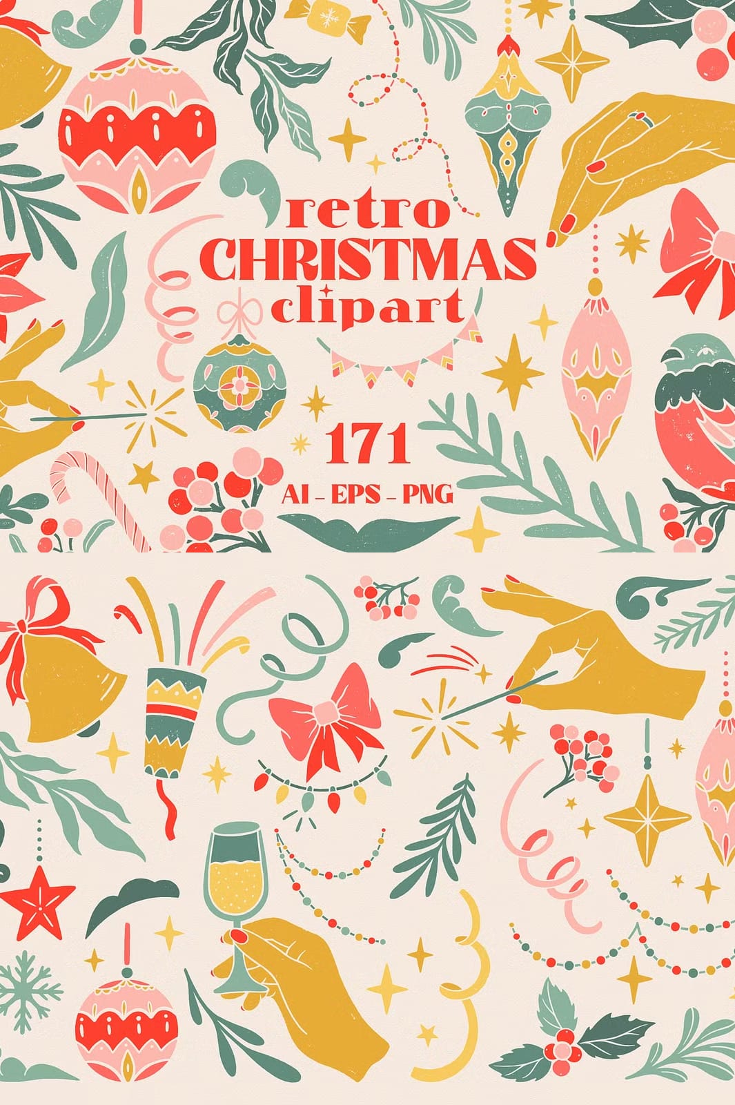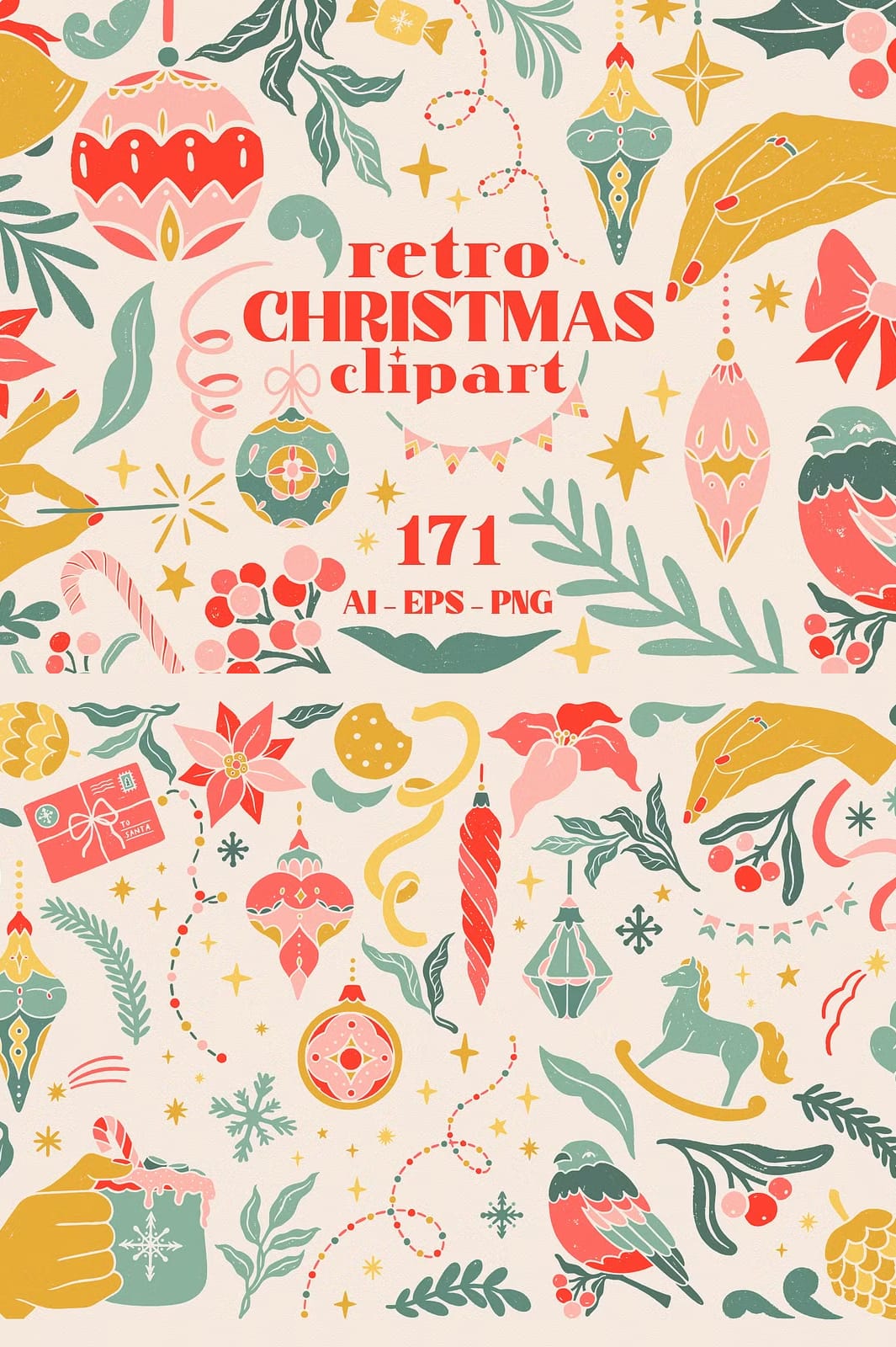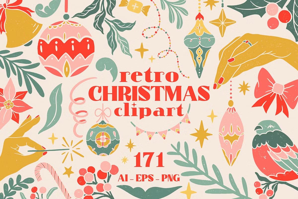 The Christmas Retro Collection offers an impressive assortment of over 170 meticulously hand-drawn Christmas and festive elements, each imbued with organic linocut textures. Designed to ignite creativity and bring a nostalgic vintage charm to your holiday projects, this versatile collection provides everything you need to make your stickers, packaging, posters, and greeting cards stand out. Every detail is carefully crafted with originality, ensuring your designs radiate warmth and festive spirit.