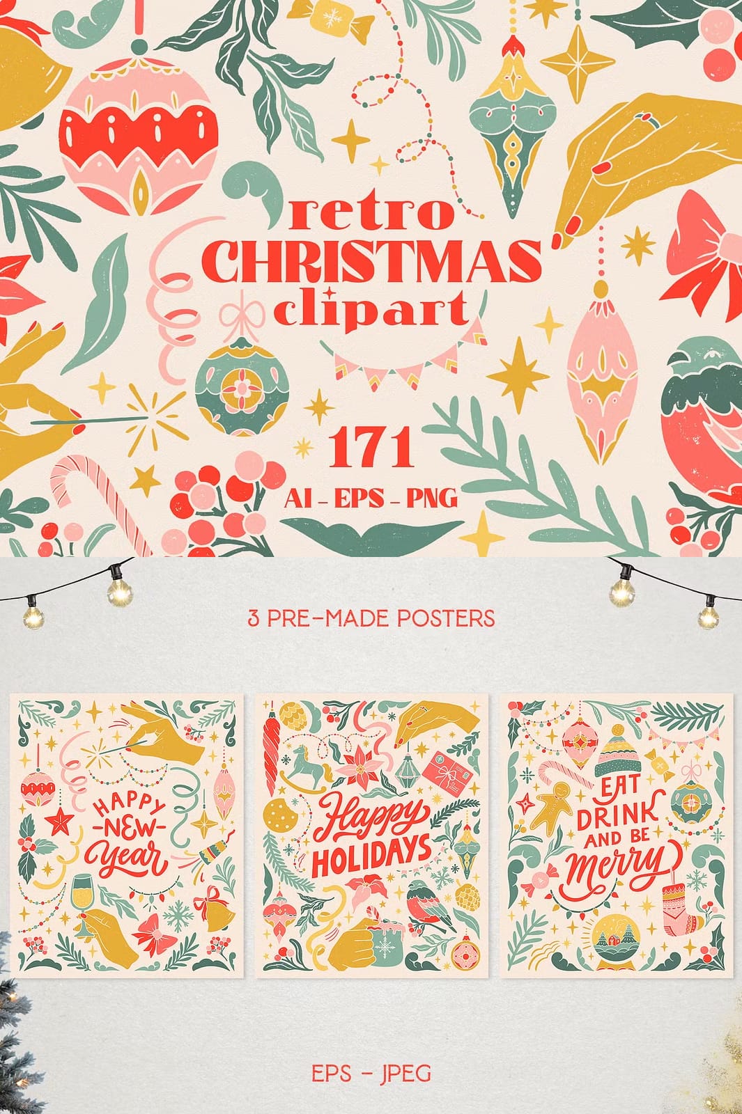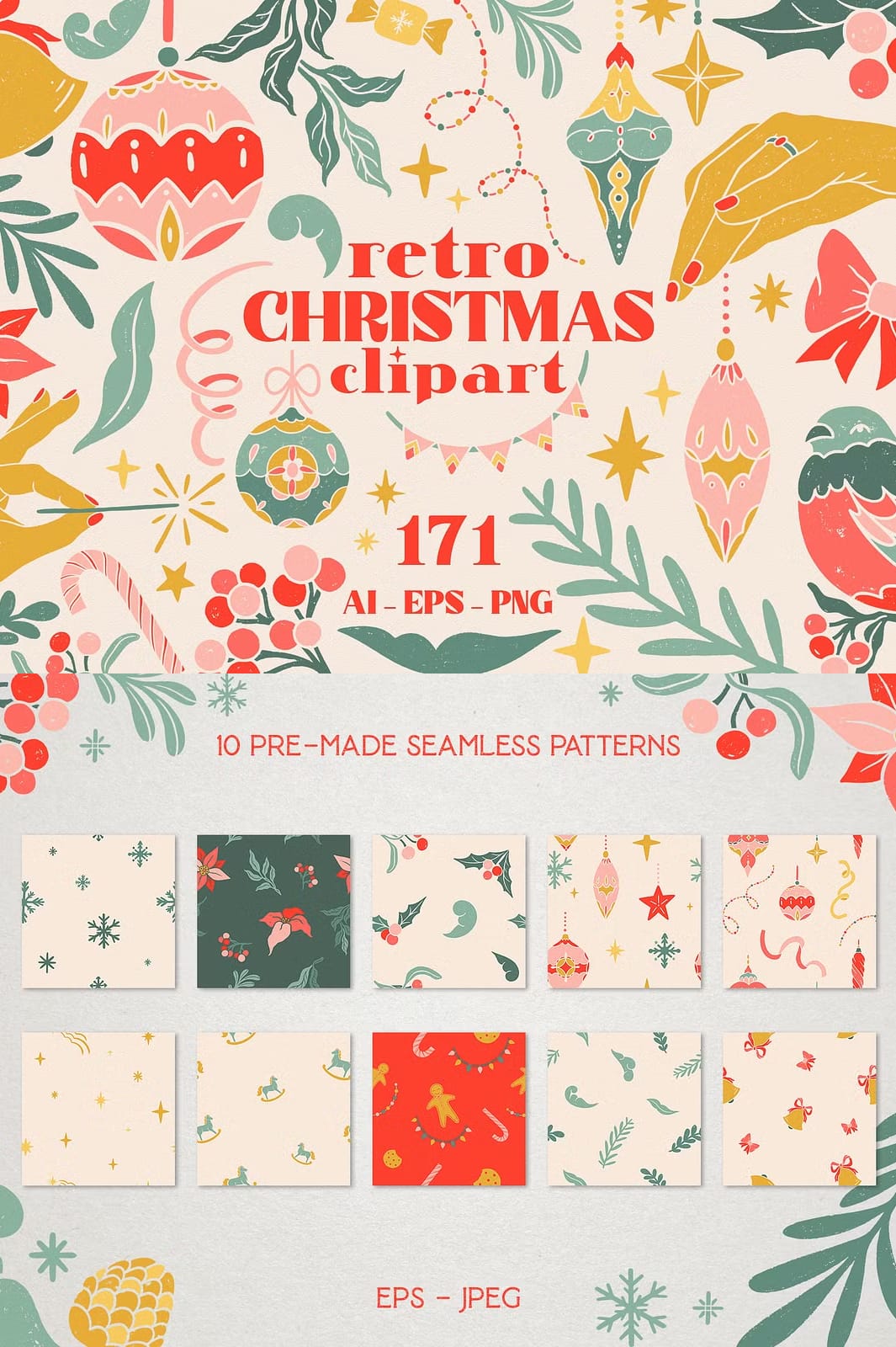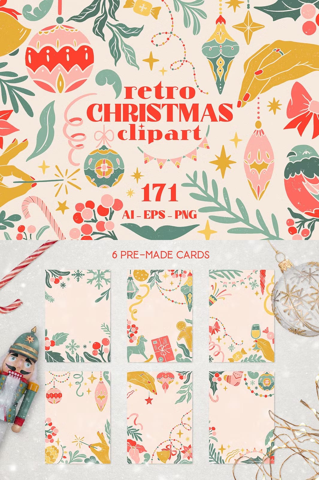 The Christmas Retro Collection offers an impressive assortment of over 170 meticulously hand-drawn Christmas and festive elements, each imbued with organic linocut textures. Designed to ignite creativity and bring a nostalgic vintage charm to your holiday projects, this versatile collection provides everything you need to make your stickers, packaging, posters, and greeting cards stand out. Every detail is carefully crafted with originality, ensuring your designs radiate warmth and festive spirit.