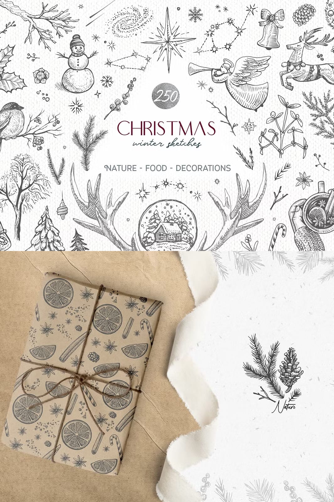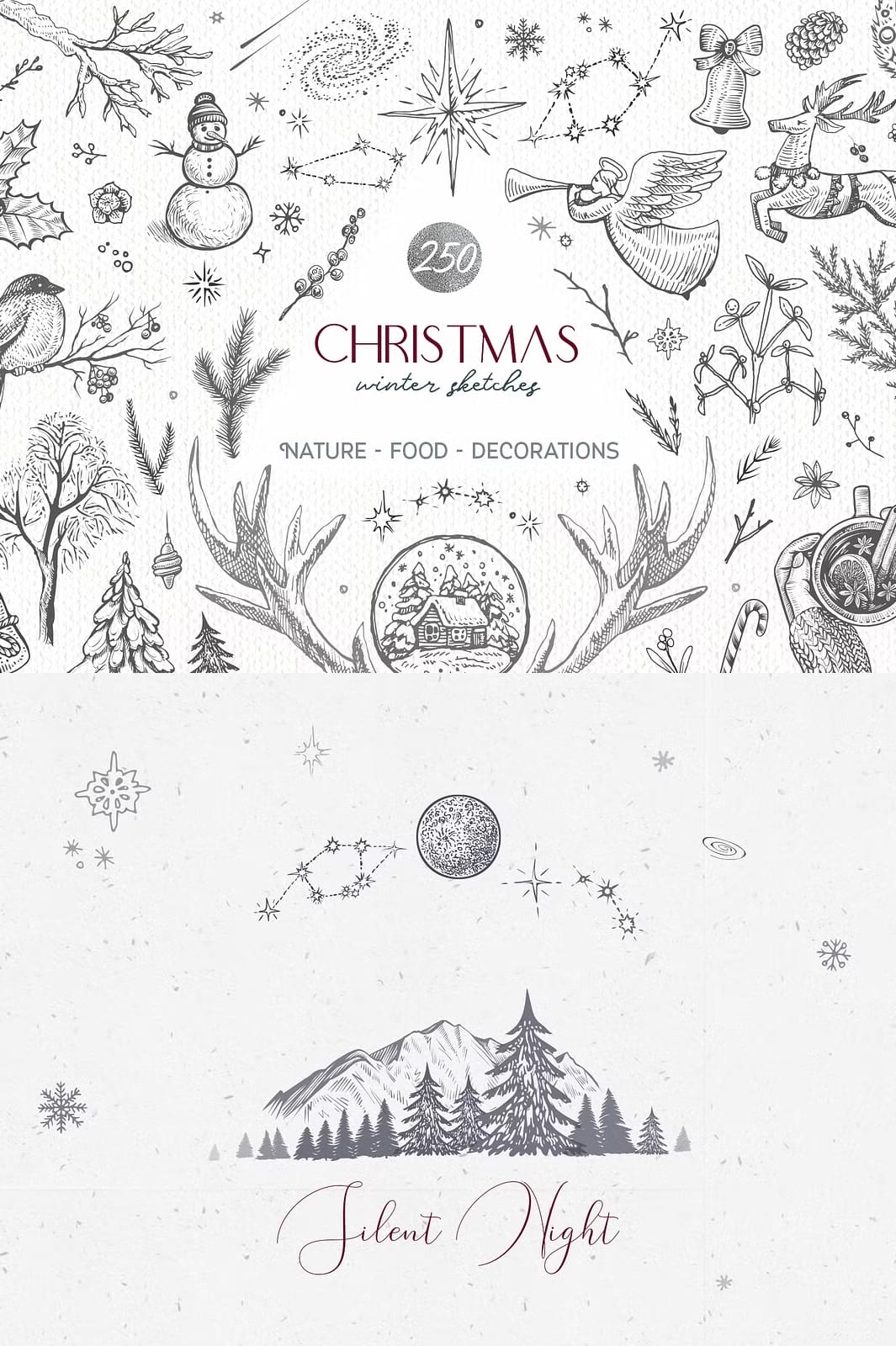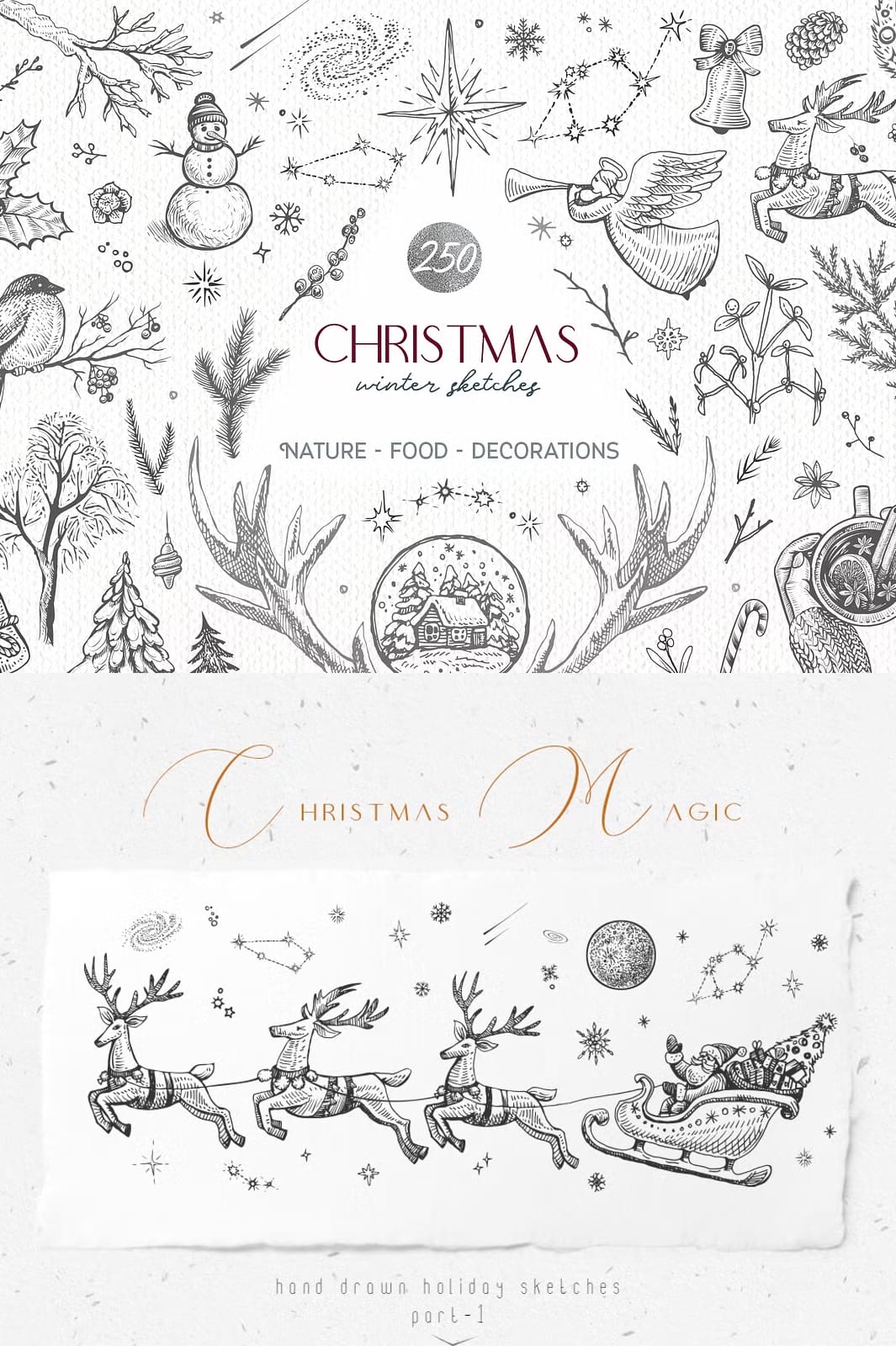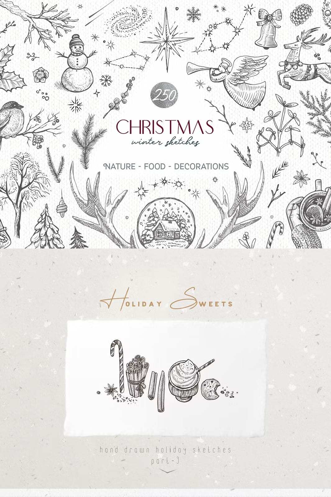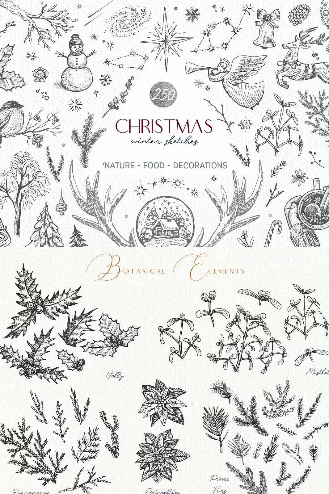Capture the magic of winter holidays with this comprehensive Christmas and Winter Sketches Bundle. This extensive collection combines 250+ high-quality vector and raster illustrations featuring festive decorations, charming animals, botanical sketches, and traditional holiday food elements. Whether you’re designing greeting cards, social media posts, or product packaging, this bundle provides everything you need to create stunning seasonal designs.