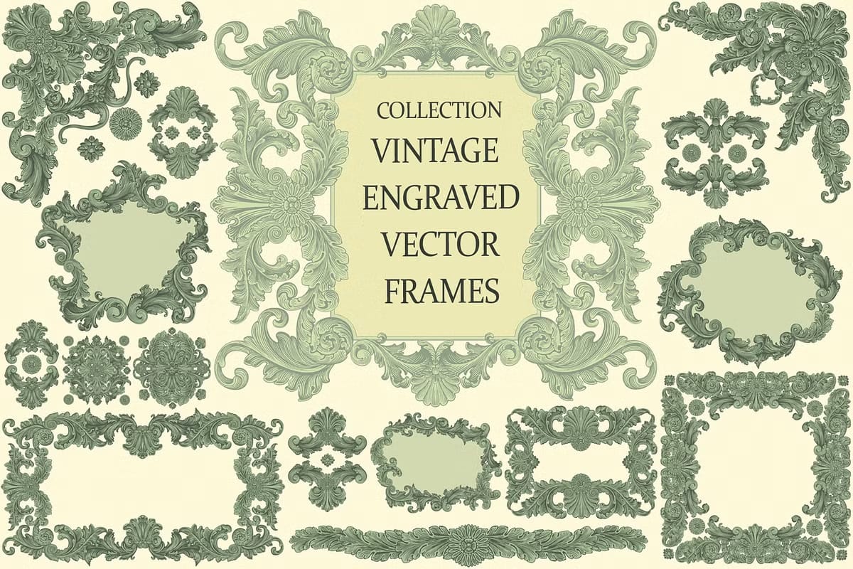 This collection’s hallmark is its authentic vector engraving style that captures the sophisticated look of vintage artwork with stunning detail. The ornate frames and complementary decorative pieces enrich your designs with a timeless, classical appeal that resonates with audiences seeking elegance and refinement. Use these elements to create captivating booklets, eye-catching advertising campaigns, stylish menus, and memorable packaging that stand out from the ordinary.