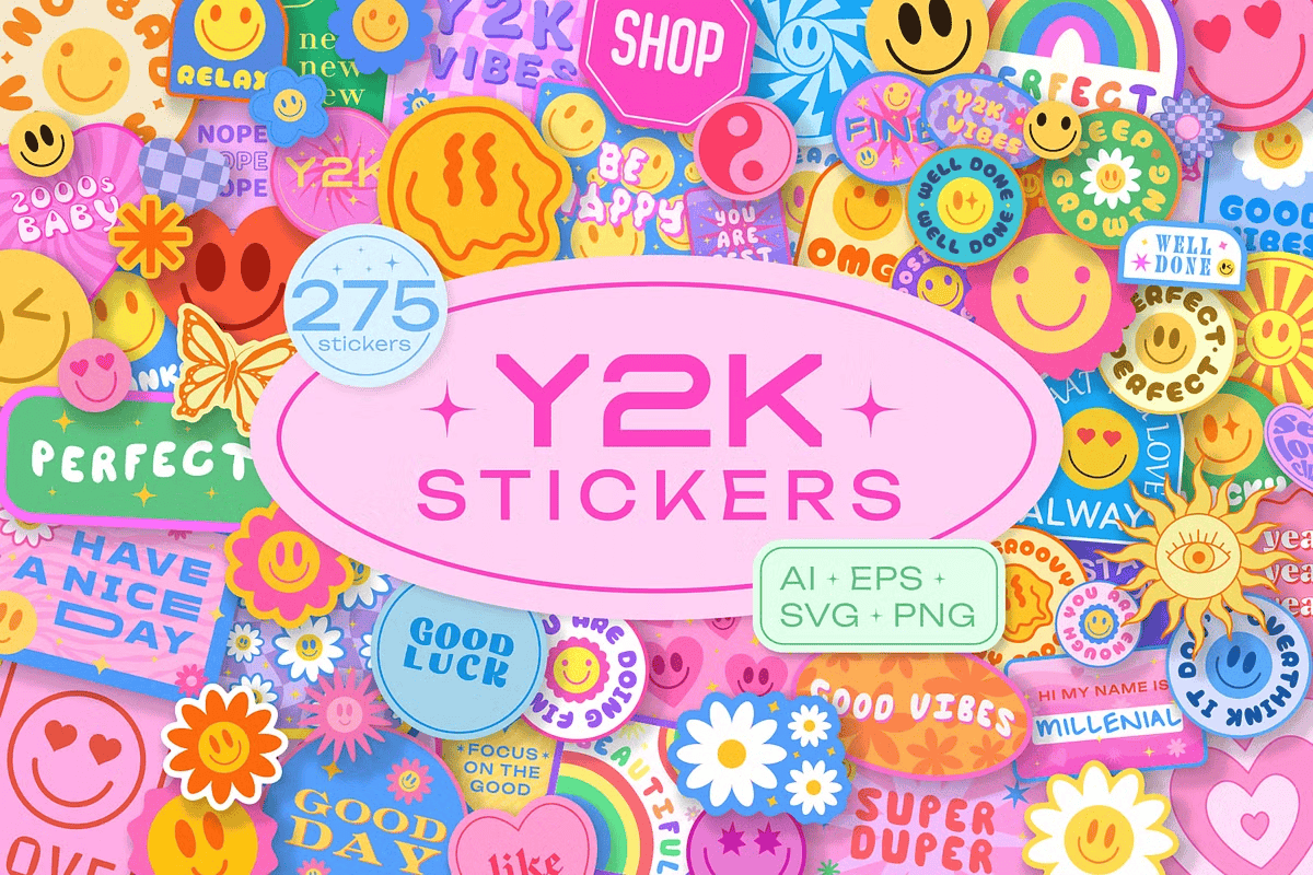 Step into a world defined by glittery gradients, geometric shapes, and unfiltered digital joy with the Y2K Stickers Pack — a dynamic collection of 275 handcrafted vector stickers that capture the wild, experimental spirit of the early 2000s. From pixelated patterns to chrome finishes and nostalgic icons, every sticker has been carefully designed to inject instant energy into your creative projects. Whether you’re building digital art, designing merchandise, or crafting social media content, this pack gives you the tools to stand out in a sea of minimalism.