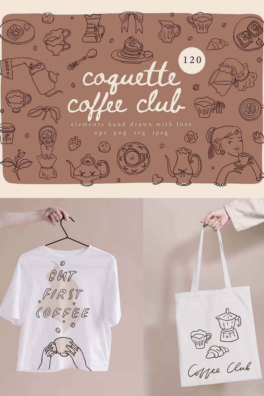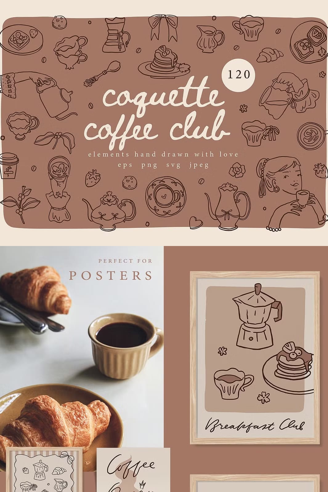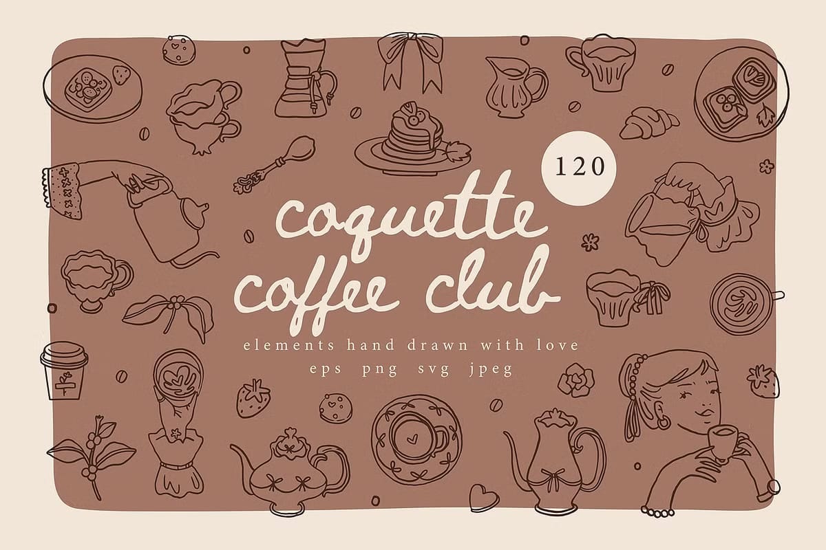 Transform your creative projects with the enchanting **Coquette Coffee Club**, a thoughtfully curated set of over 100 hand-drawn vector elements in a stunning monochrome coquette style. Celebrate the art of coffee with this delightful bundle designed for creatives who love charm, nostalgia, and a touch of playful sophistication. Whether you’re crafting social media content, designing posters, or building digital scrapbooks, this collection brings a unique blend of vintage charm and modern flair right to your fingertips.