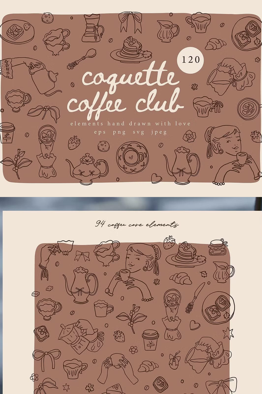 - 94 Hand-Drawn Coffee Elements: From coffee beans and mugs to pastries and saucers—each piece is meticulously crafted for maximum creative flexibility.