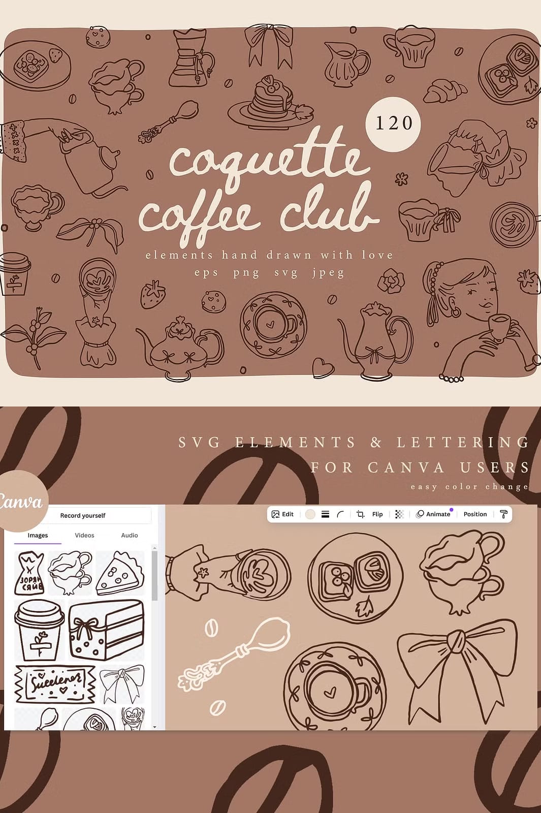 This collection goes beyond basic coffee graphics—each element is lovingly hand-drawn to capture the delicate balance between elegance and whimsy. Features include stylish coffee cards, adorable café accents, whimsical lettering, and beautifully crafted poster designs. The signature **Mocha Mousse color palette** adds a soft, warm tone that’s instantly recognizable and ideal for seasonal branding, Etsy shops, branding kits, wedding stationery, and holiday promotions. With SVG files included, you can easily edit colors in Canva, Adobe Illustrator, or Photoshop to match your personal brand or project theme.