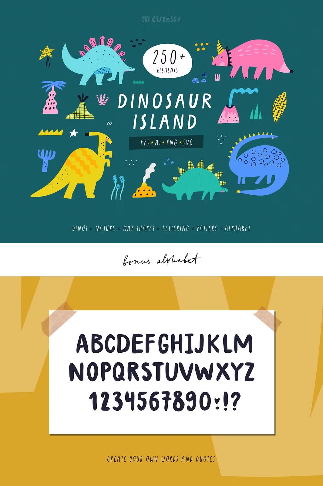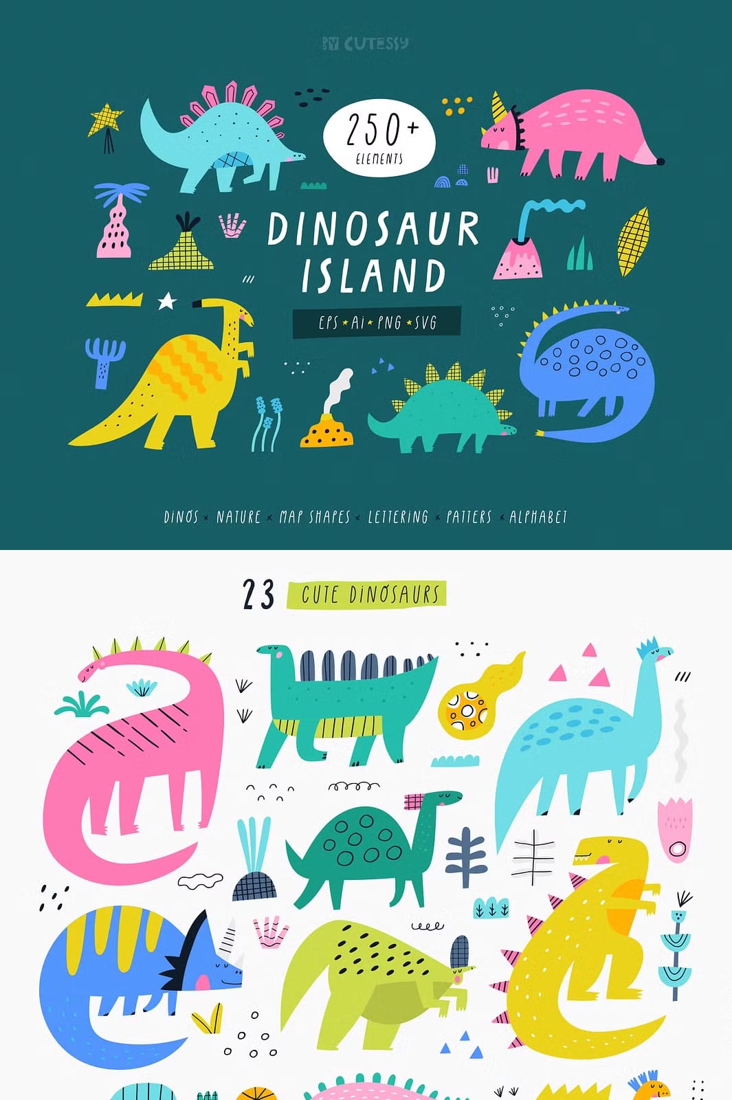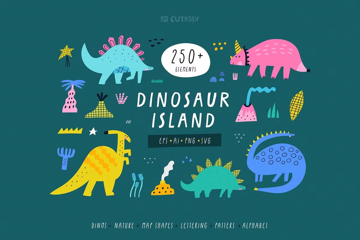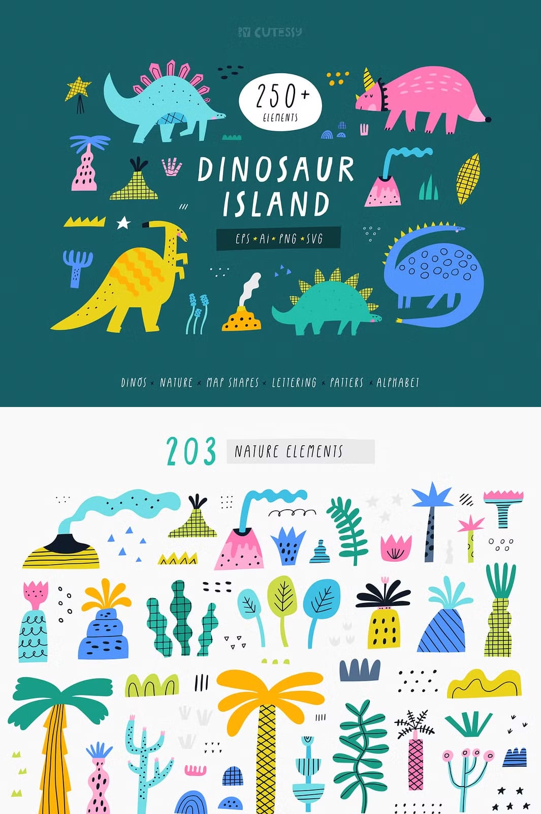 Within the Dinosaur Island collection, you will find 226 clipart elements that include 203 nature-inspired illustrations and 23 unique dinosaur designs. Although dinosaurs are the stars, the supporting nature elements such as plants, rocks, and water features enrich the settings for your designs. Additionally, the 10 map shapes offer creative backgrounds for story-telling or educational materials. The 12 lettering quotes add charm and inspiration to complete your thematic designs, while 6 seamless patterns provide decorative options for backgrounds, apparel, and packaging.