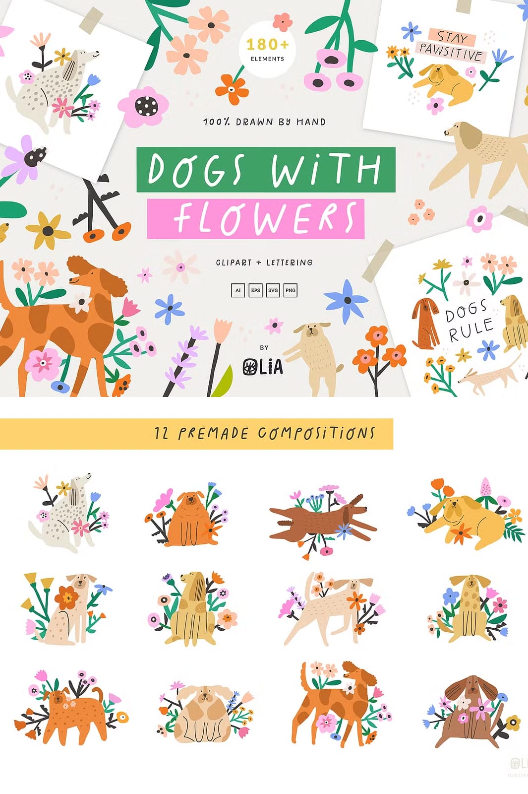 Whether you are a professional designer or a creative hobbyist, this collection offers a rich variety of charming elements to bring your ideas to life. Download the Dogs with Flowers Hand-Drawn Clipart Collection now and start crafting beautiful, unique designs that stand out.