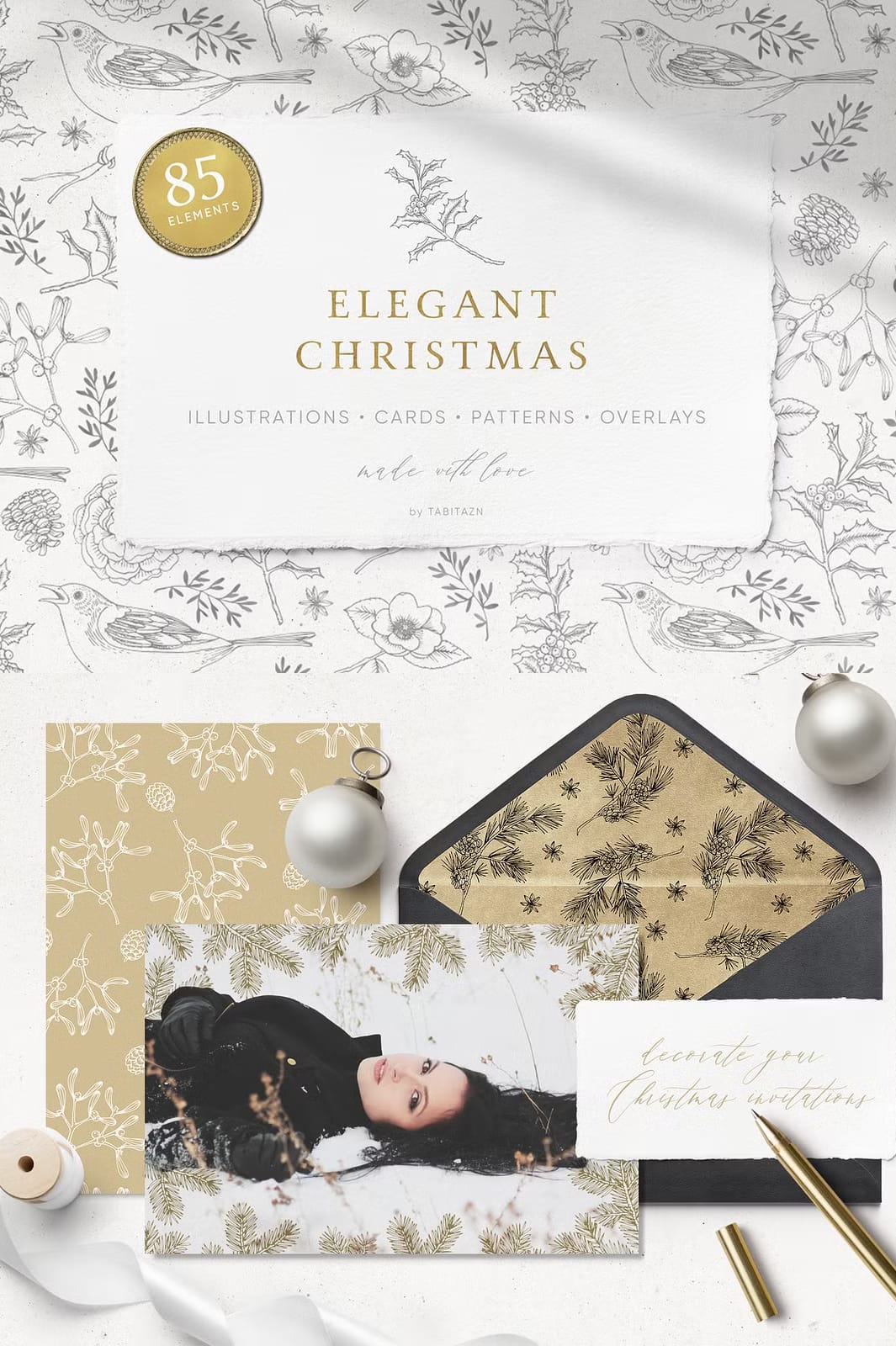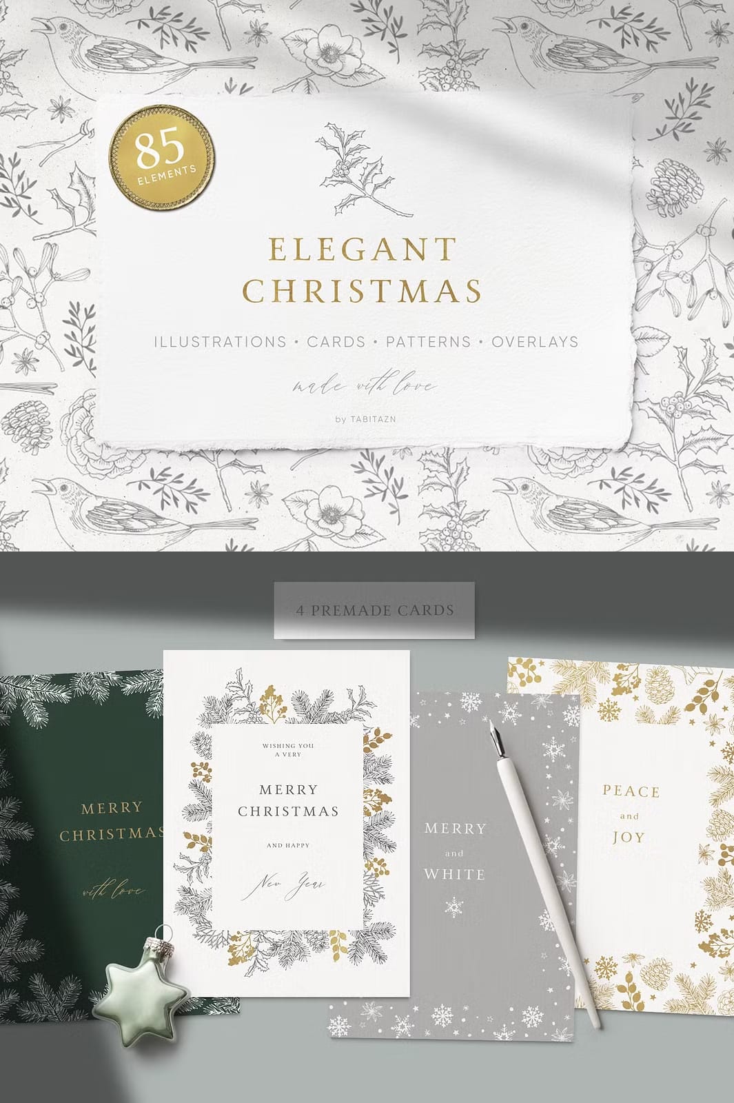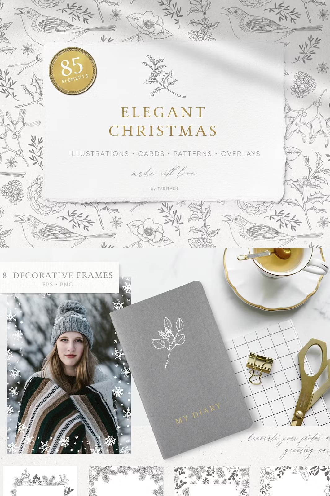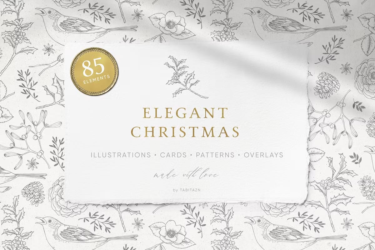 The Elegant Christmas Set features a stunning palette of gold and white that beautifully reflects the festive spirit. Each element in this collection has been thoughtfully crafted to create an atmosphere that is both calming and celebratory. The vintage look adds a touch of sophistication, making it perfect for various applications.