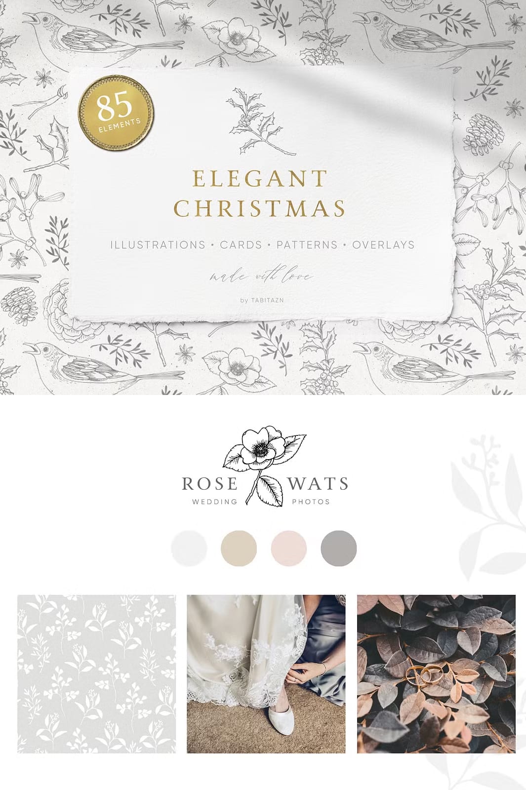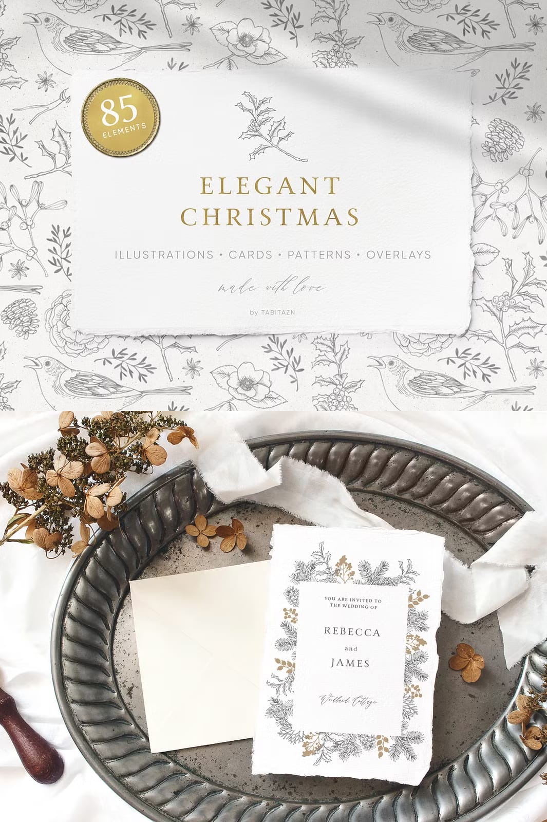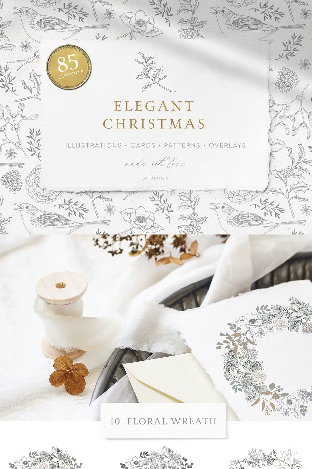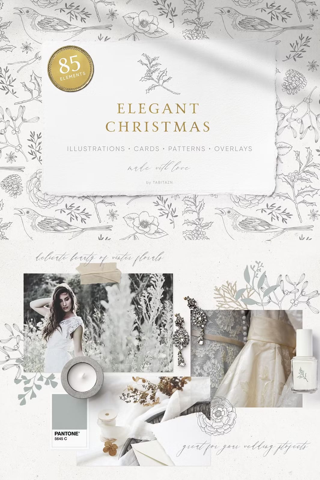 The Elegant Christmas Set features a stunning palette of gold and white that beautifully reflects the festive spirit. Each element in this collection has been thoughtfully crafted to create an atmosphere that is both calming and celebratory. The vintage look adds a touch of sophistication, making it perfect for various applications.