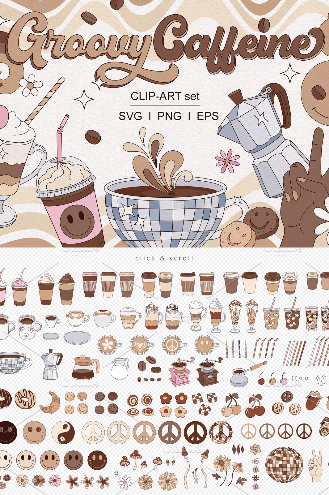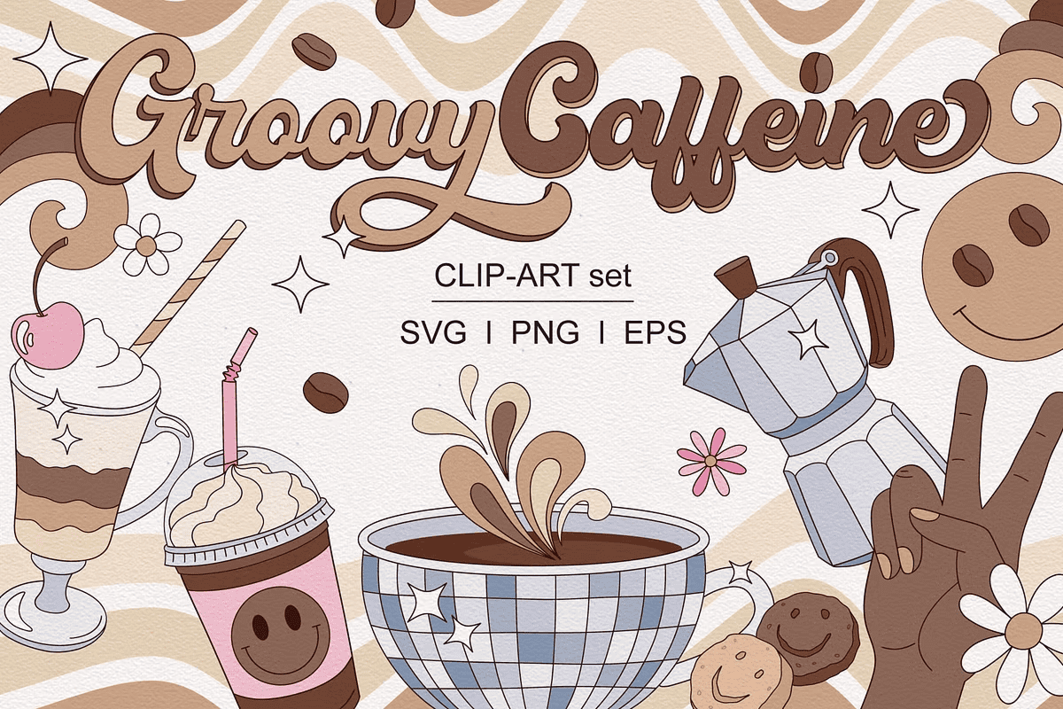 Unleash the spirit of the 70s with this dynamic **Groovy Hippie Caffeine Cappuccino Coffee Drink Clipart Set**, where retro vibe meets artistic soul. This vibrant bundle is crafted for creators who love bold, playful, and imaginative visuals. From steamy cappuccino cups to whimsical coffee grinders and smiling cookie swirls, each element captures the joyful essence of hippie culture, infused with a modern creative edge. Whether you’re designing a planner, crafting greeting cards, or creating custom apparel, this set adds instant personality and charm to any project.