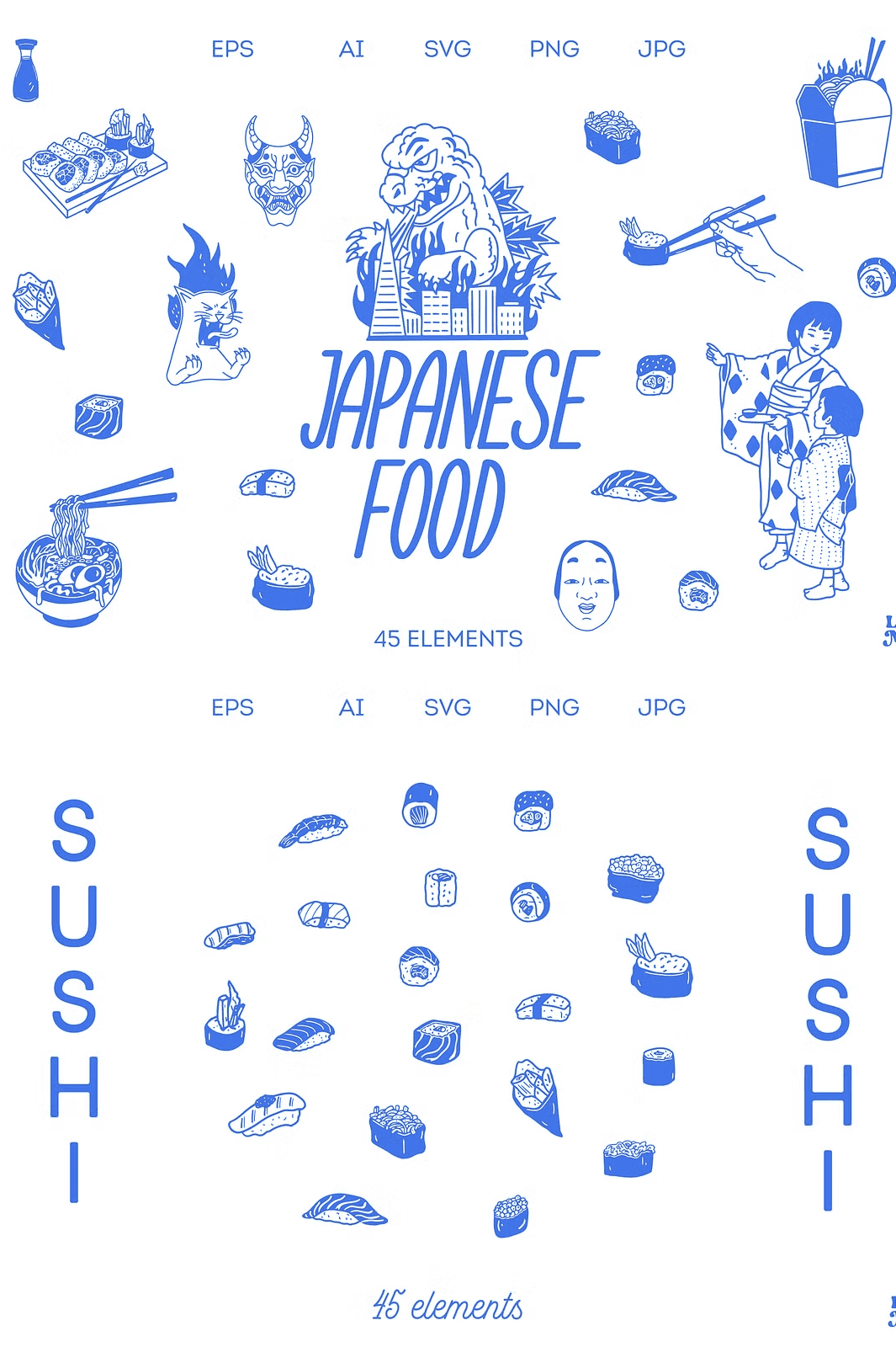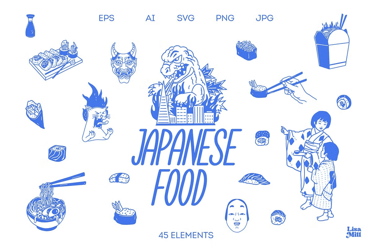 - 45 Isolated Hand-Drawn Elements – Featuring sushi rolls, ramen bowls, matcha tea, wasabi, cherry blossoms, koinobori, and more. Every element is clean, detailed, and ready for immediate use in digital or print projects.