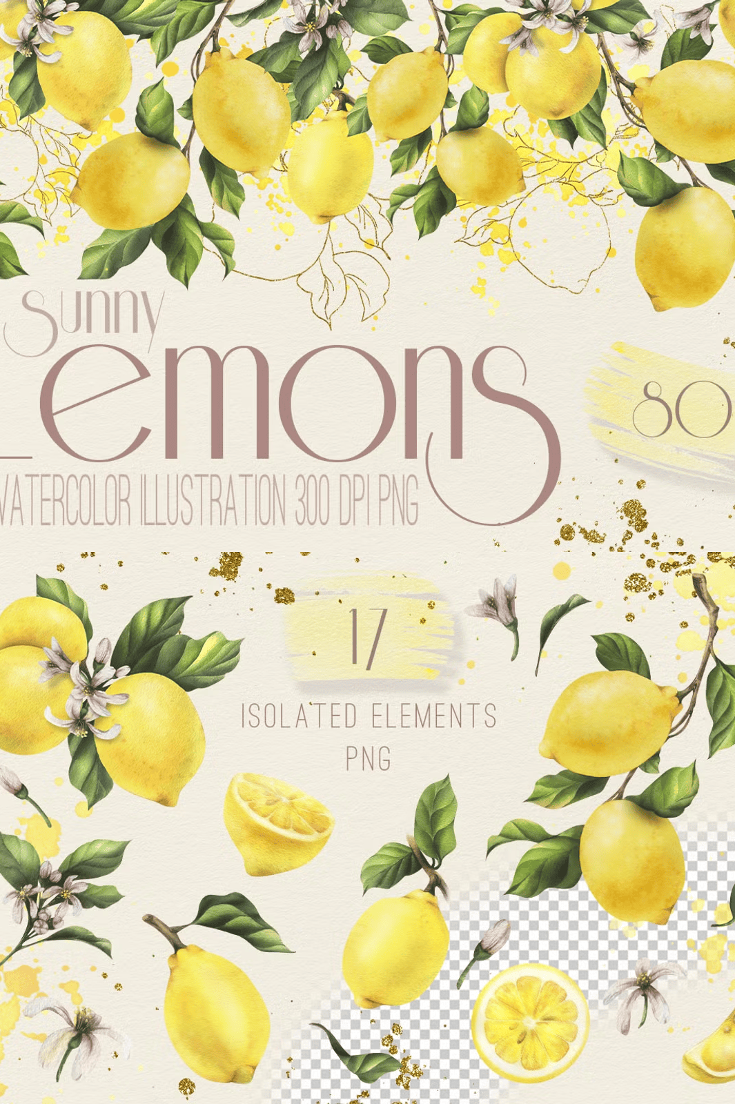 - 17 Isolated Watercolor Elements: Standalone lemon illustrations, leaves, and blossoms with transparent PNG backgrounds—perfect for layering into custom designs.