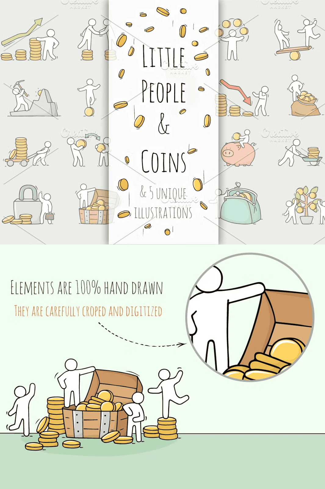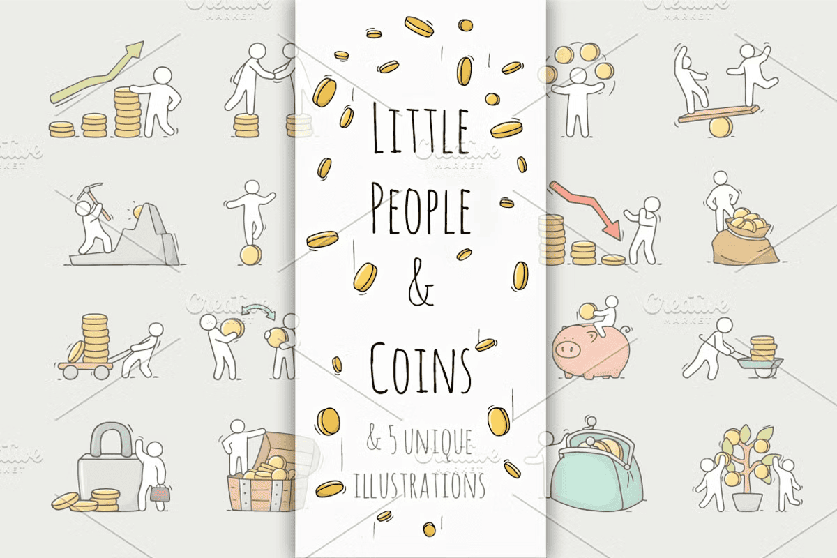 Transform your designs with a burst of friendly charm and strategic visual storytelling. This **hand-crafted collection of adorable little people with coins** brings warmth, personality, and clear communication to finance-related projects. Ideal for web designers, marketers, and presenters, these doodle-style illustrations instantly elevate presentations, digital branding, app interfaces, and business communications. Move beyond sterile stock graphics—let these happy, expressive characters convey financial concepts with heart and humor.