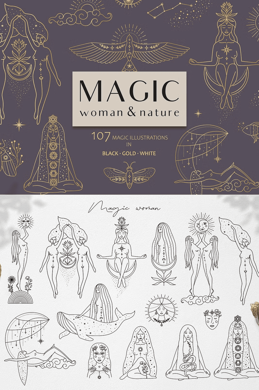 – **14 Magic Women in Gold** – Radiant and luxurious, perfect for jewelry logos, wellness brands, or high-end print materials.