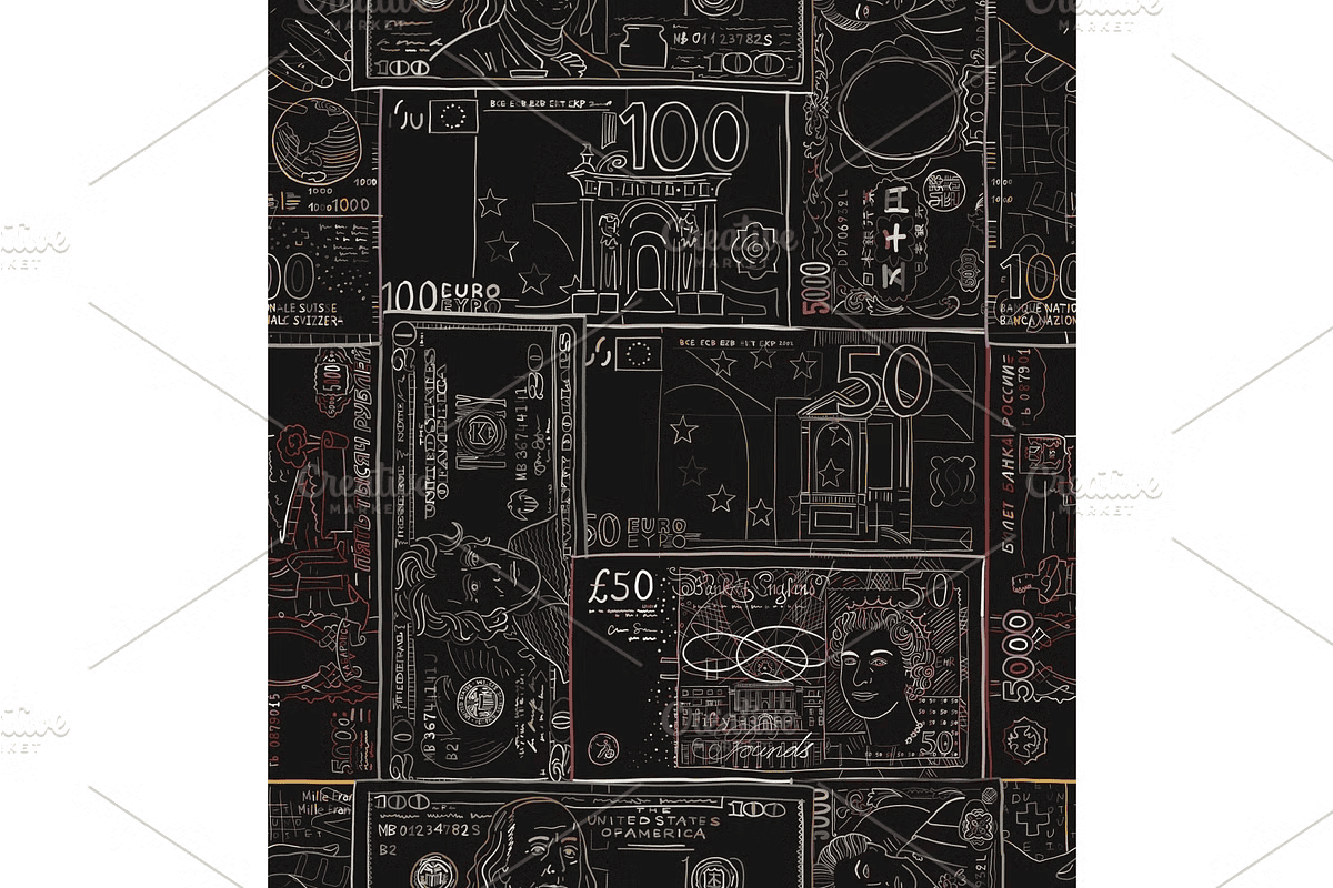 Transform your creative projects with this stunning, hand-drawn seamless pattern featuring real-world banknotes from six major global currencies: US Dollar, Euro, British Pound Sterling, Japanese Yen, Russian Ruble, and Swiss Franc. Each banknote is meticulously illustrated in a clean, artistic sketch style, blending financial authenticity with creative flair. This vector illustration isn’t just decorative—it’s a dynamic design element that instantly adds sophistication, global appeal, and thematic depth to your next project.