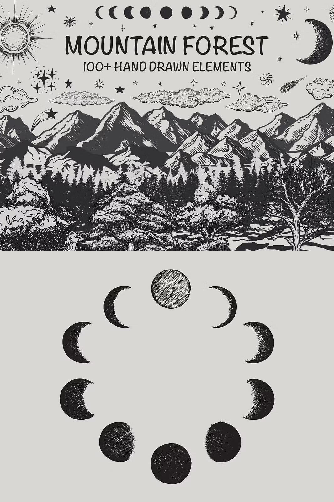 Unleash your creativity with this extensive Mountain Forest Hand-Drawn Elements collection, featuring 131 uniquely crafted components. This kit captures the essence of nature with detailed illustrations of mountains, trees, land, moon phases, sun, clouds, stars, and comets. Designed to infuse a sense of tranquility and natural beauty into your projects, this collection is ideal for a wide array of creative uses. Whether you are designing logos, branding materials, art prints, packaging, badges, web and social media graphics, posters, wall art, cards, scrapbooking projects, tattoo designs, surface pattern designs, or wallpaper, this set delivers exceptional versatility and charm.