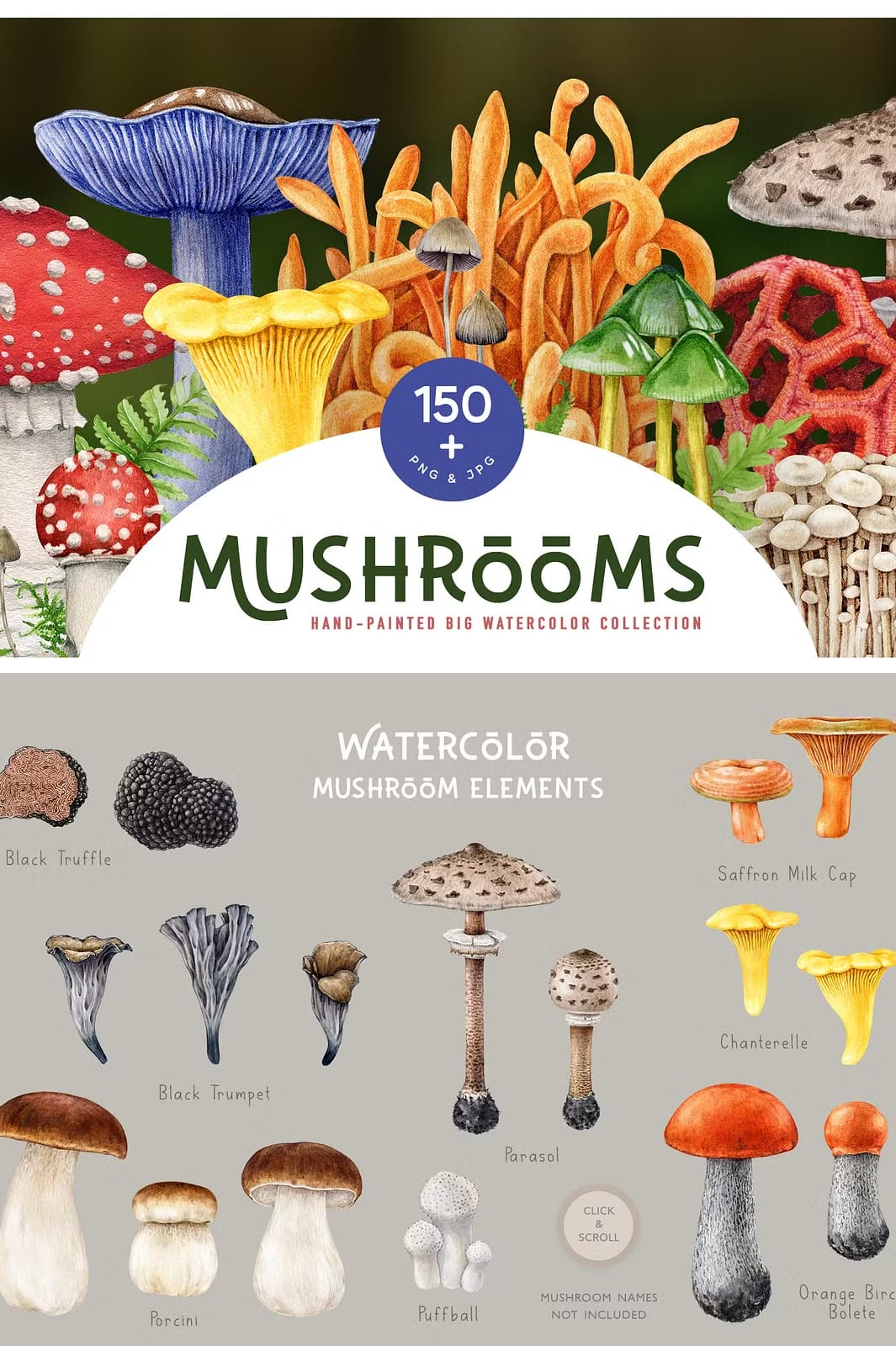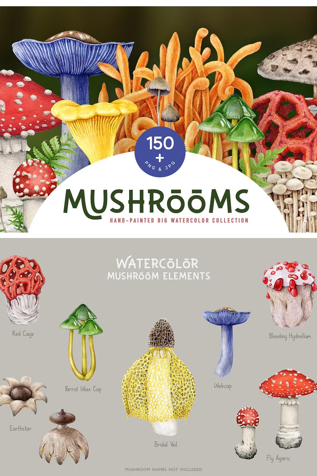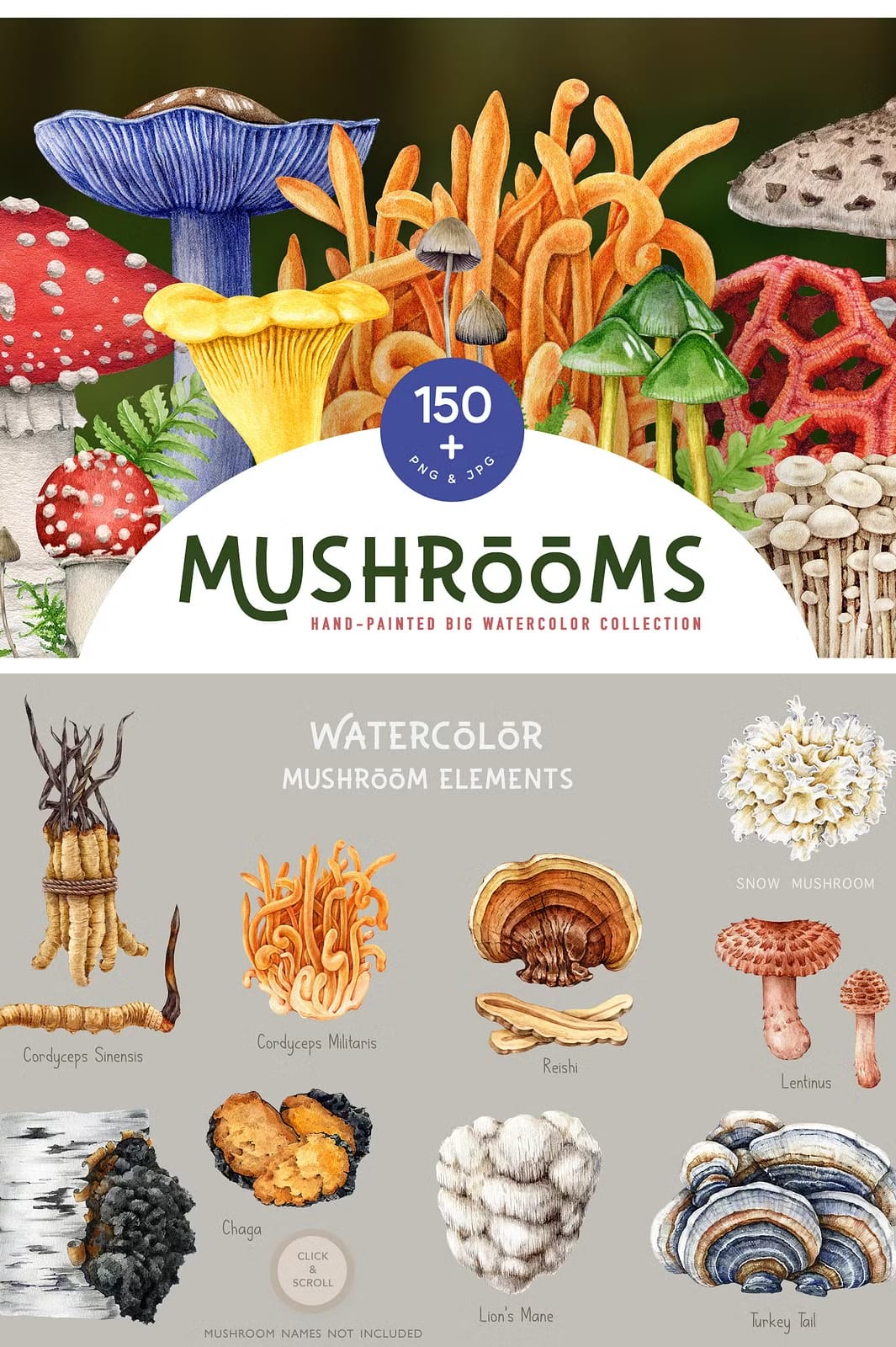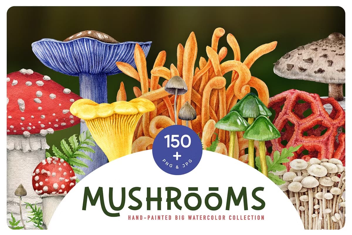 Unleash your creativity with the Mushrooms Big Watercolor Collection, a stunning set of 71 hand-painted, realistic watercolor mushroom illustrations. This exclusive collection showcases 40 types of medicinal, edible, and exotic mushrooms from around the globe, designed to inspire and elevate a wide range of creative projects. Whether you are working on educational materials, food packaging, scientific presentations, or artistic endeavors, this collection offers premium-quality visuals to enrich your work.