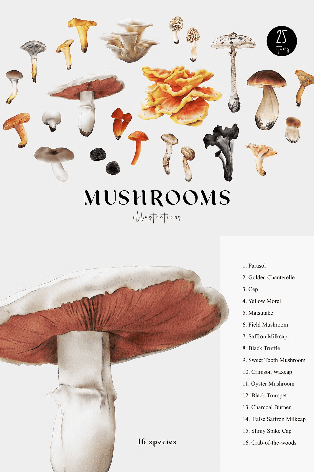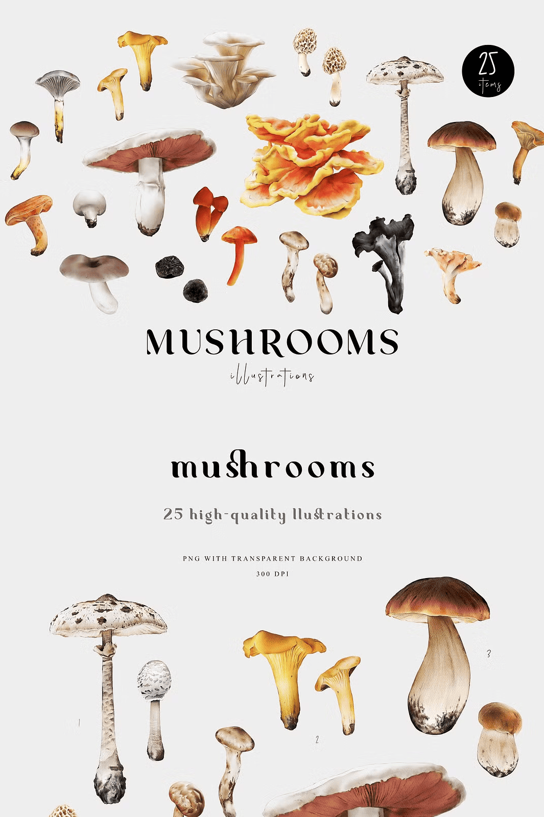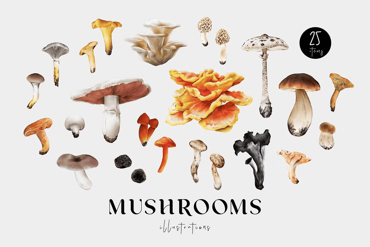 Step into a world of organic elegance and earthy wonder with this meticulously crafted **Mushrooms Illustration Fungi Set**. Each of the 25 hand-painted watercolor illustrations captures the unique character, texture, and natural beauty of real-world fungi—from the elegant Parasol to the elusive Black Truffle. From educational materials to high-end design projects, this collection brings life and authenticity to every creative piece.