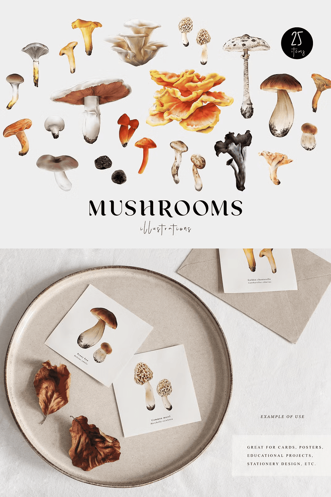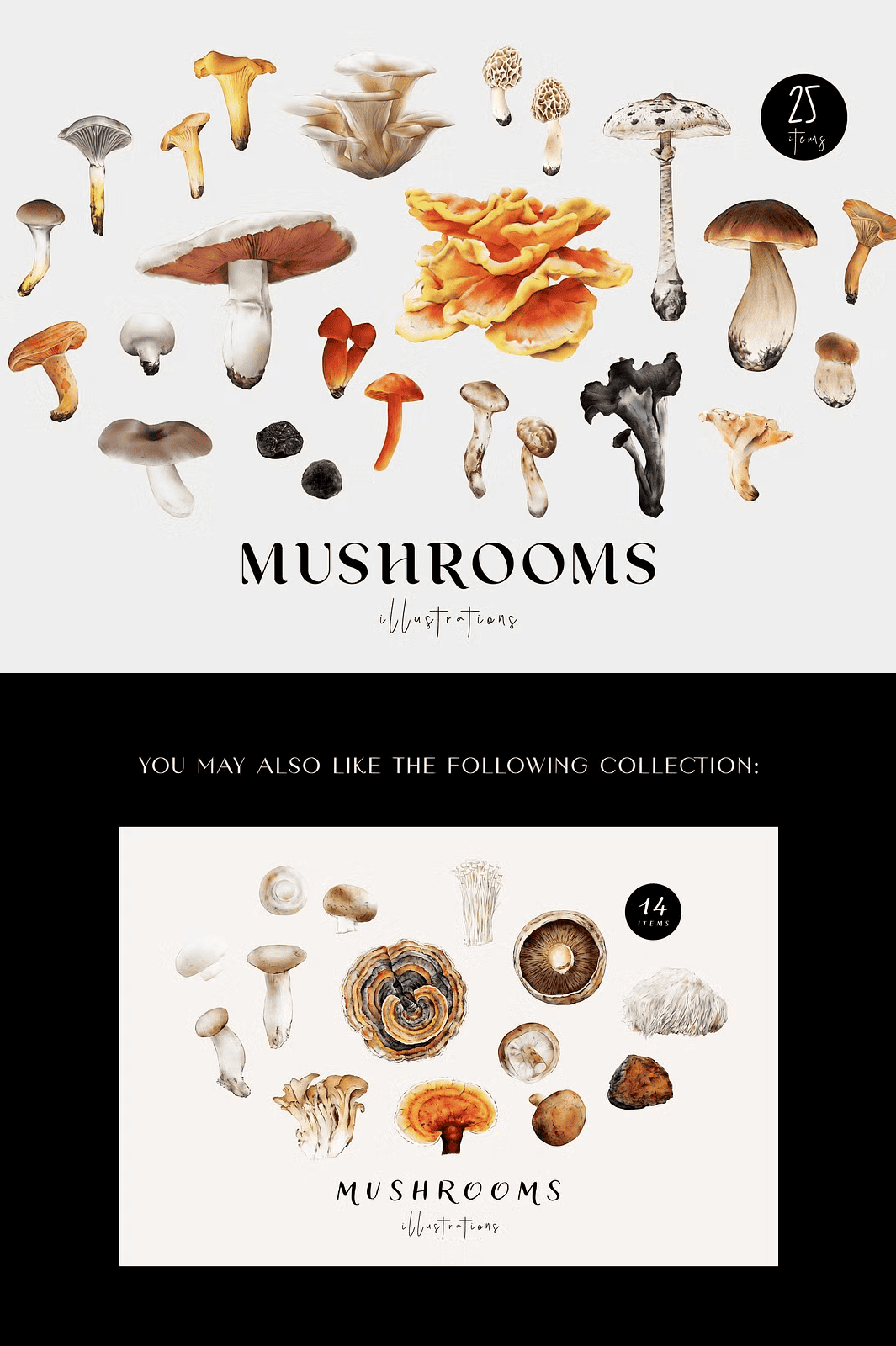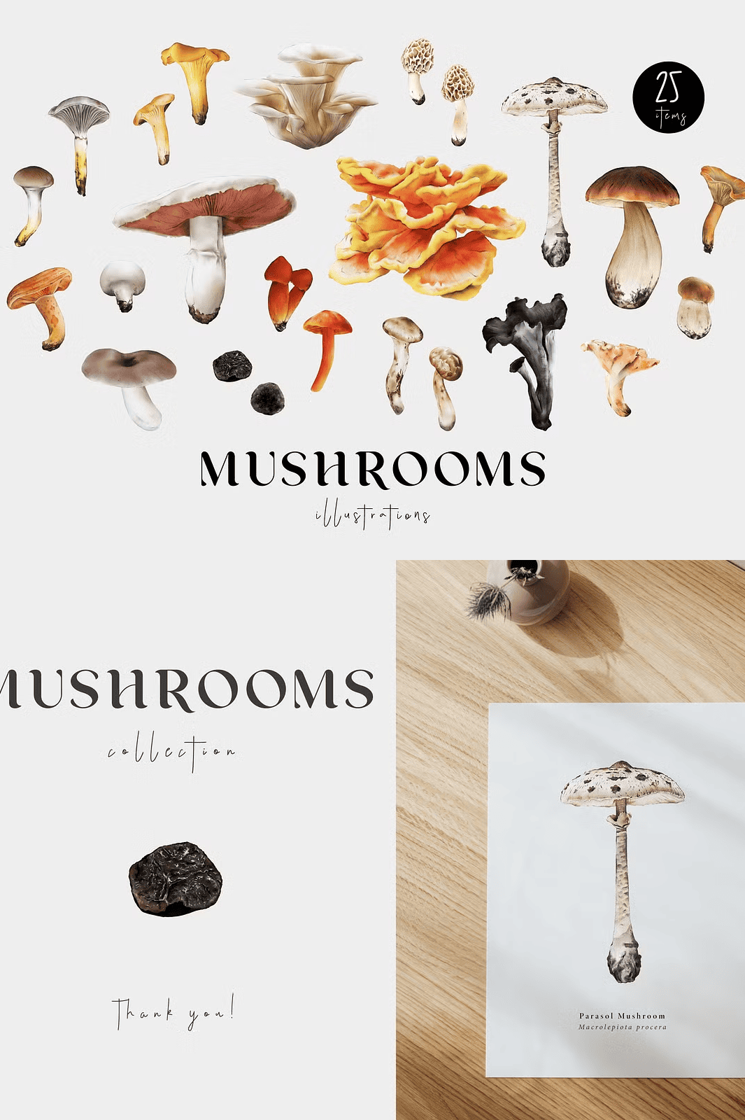 Step into a world of organic elegance and earthy wonder with this meticulously crafted **Mushrooms Illustration Fungi Set**. Each of the 25 hand-painted watercolor illustrations captures the unique character, texture, and natural beauty of real-world fungi—from the elegant Parasol to the elusive Black Truffle. From educational materials to high-end design projects, this collection brings life and authenticity to every creative piece.