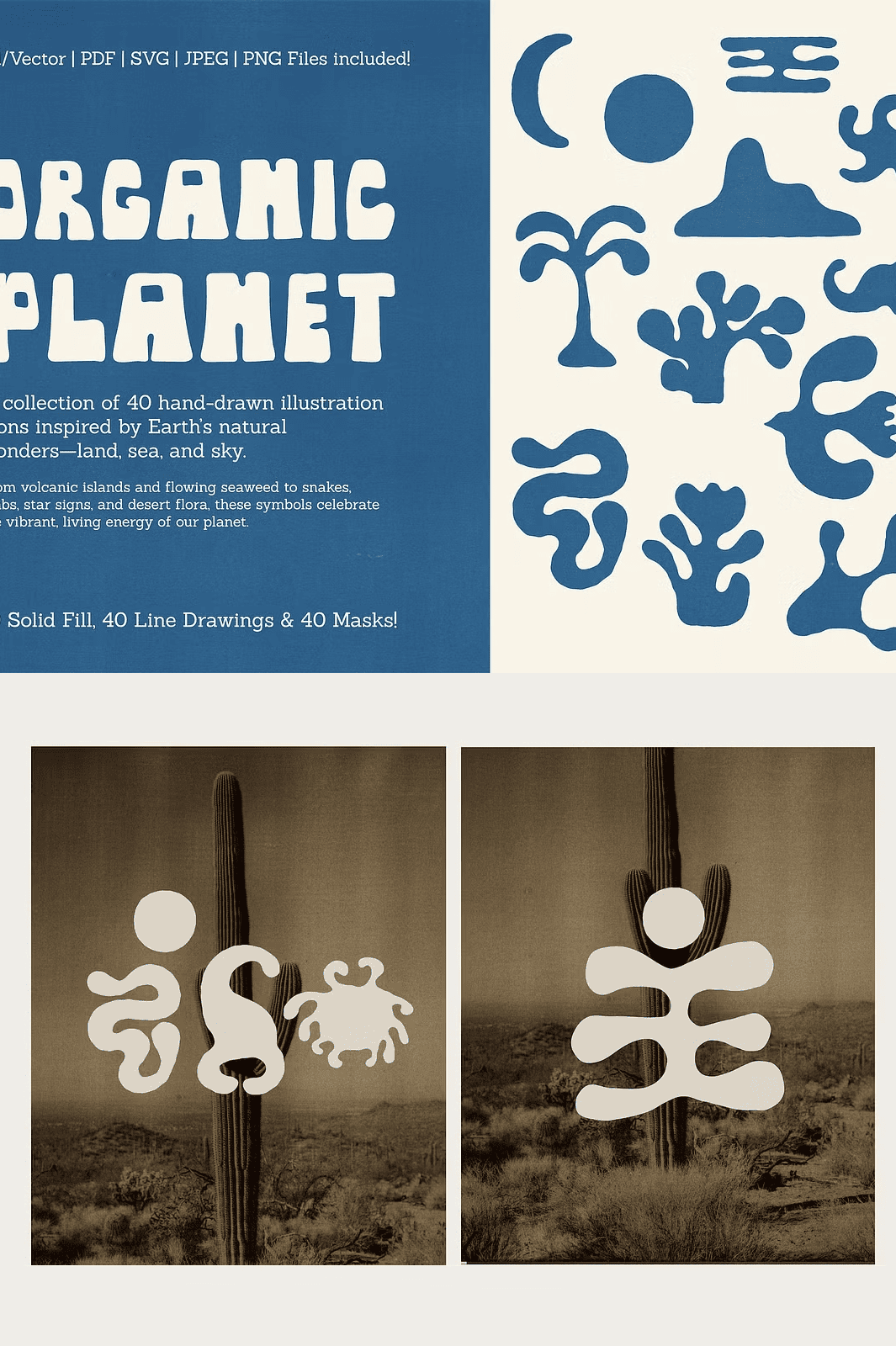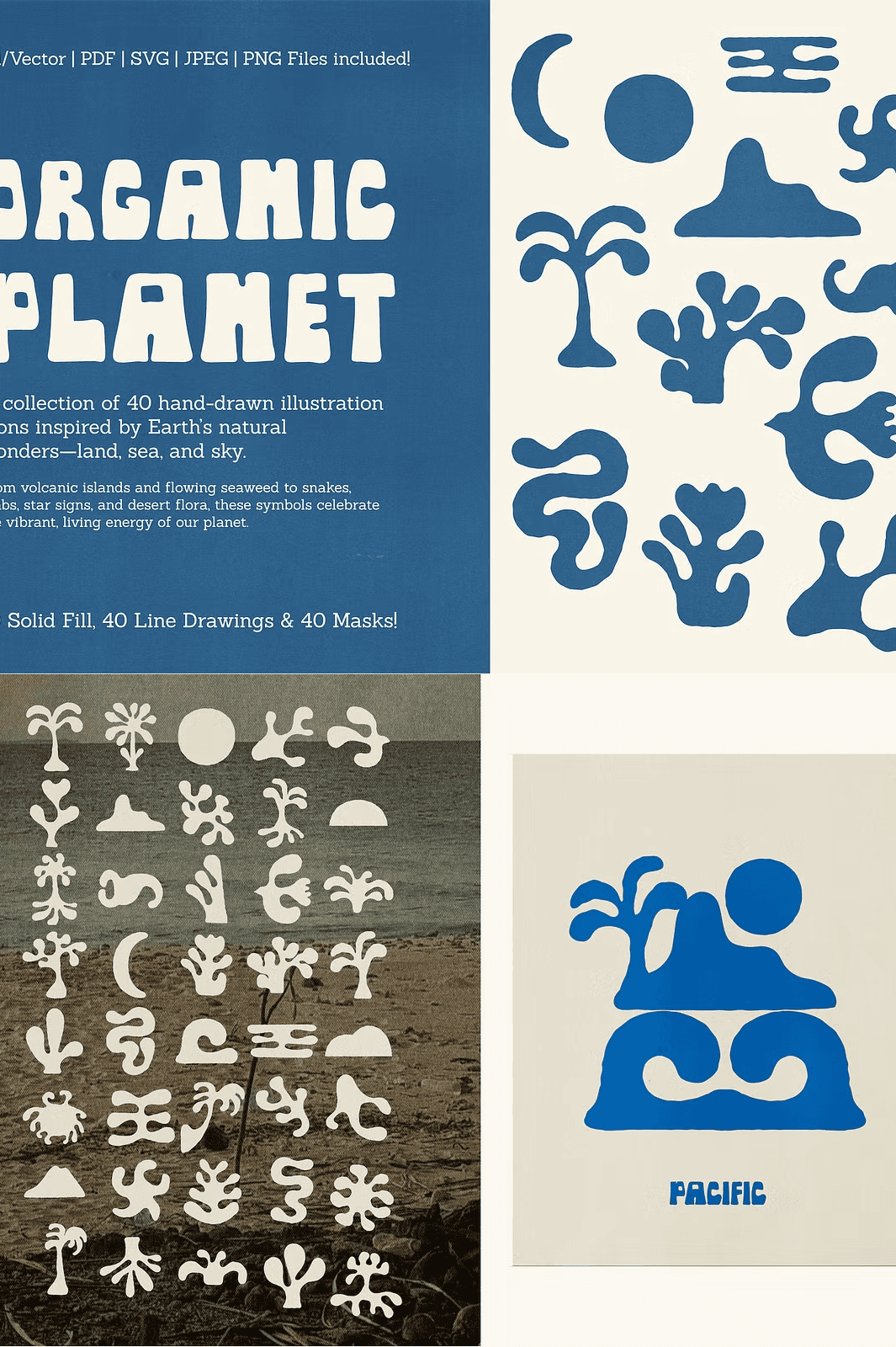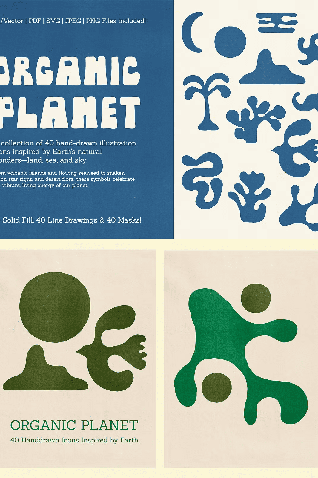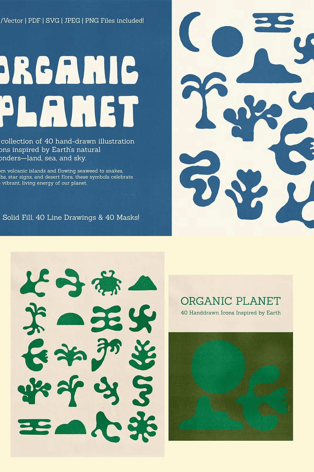 Unlock the untamed spirit of nature with *Organic Planet*, a hand-curated collection of 40 unique, earth-inspired illustrations that bring the wild, organic energy of our planet to life. From twisting vines and jagged volcanic islands to delicate seabirds and sinuous serpents, each icon captures the essence of natural formation—imperfect, alive, and deeply authentic. Designed with rough-cut edges and intentional imperfections, these artworks echo the soul of analogue printing, handmade sketching, and the natural world’s raw unpredictability. This is not just a set of icons—it’s a toolkit for designers who crave authenticity, texture, and storytelling.