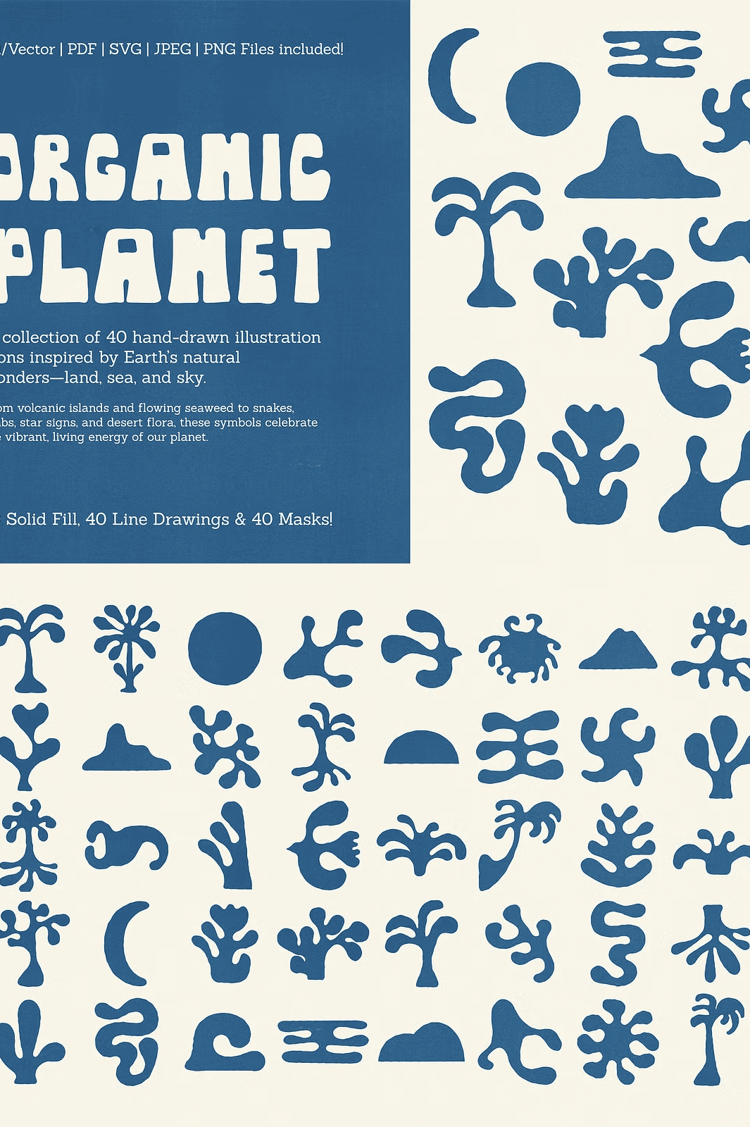 - 40 Solid Forms: Rich, filled illustrations ready for bold visual impact—ideal for logos, backgrounds, and standout branding elements.