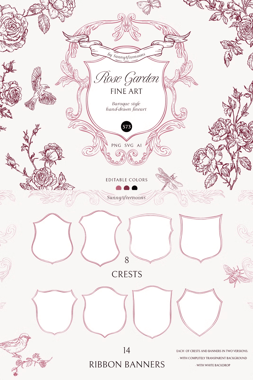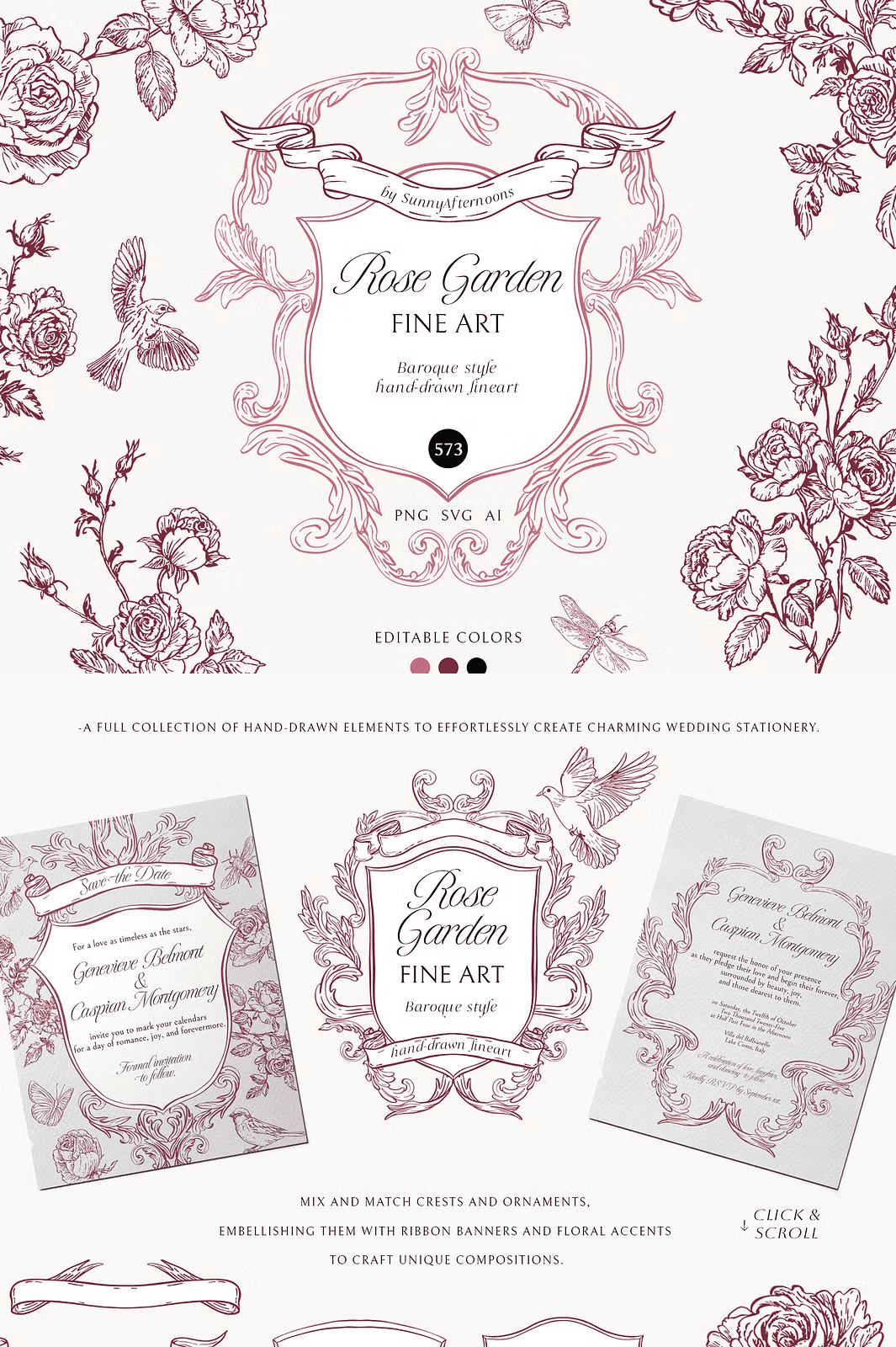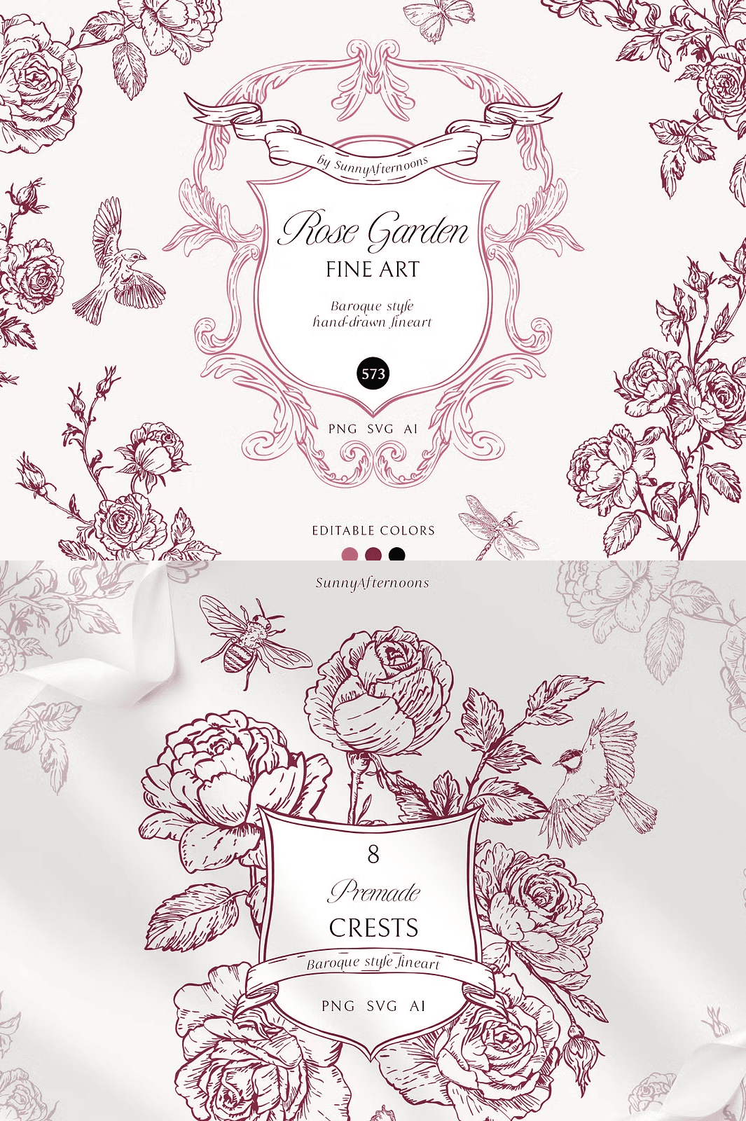 Each vector is supplied in three complementary palettes: soft blush pink, rich burgundy, and classic black. Switching between colors is a single click in Illustrator, Inkscape, or even web‑based tools like Canva (choose the SVG option). Because the assets are true vectors, you can enlarge a delicate banner to billboard size or shrink a petite crest to a business card without losing crispness.
