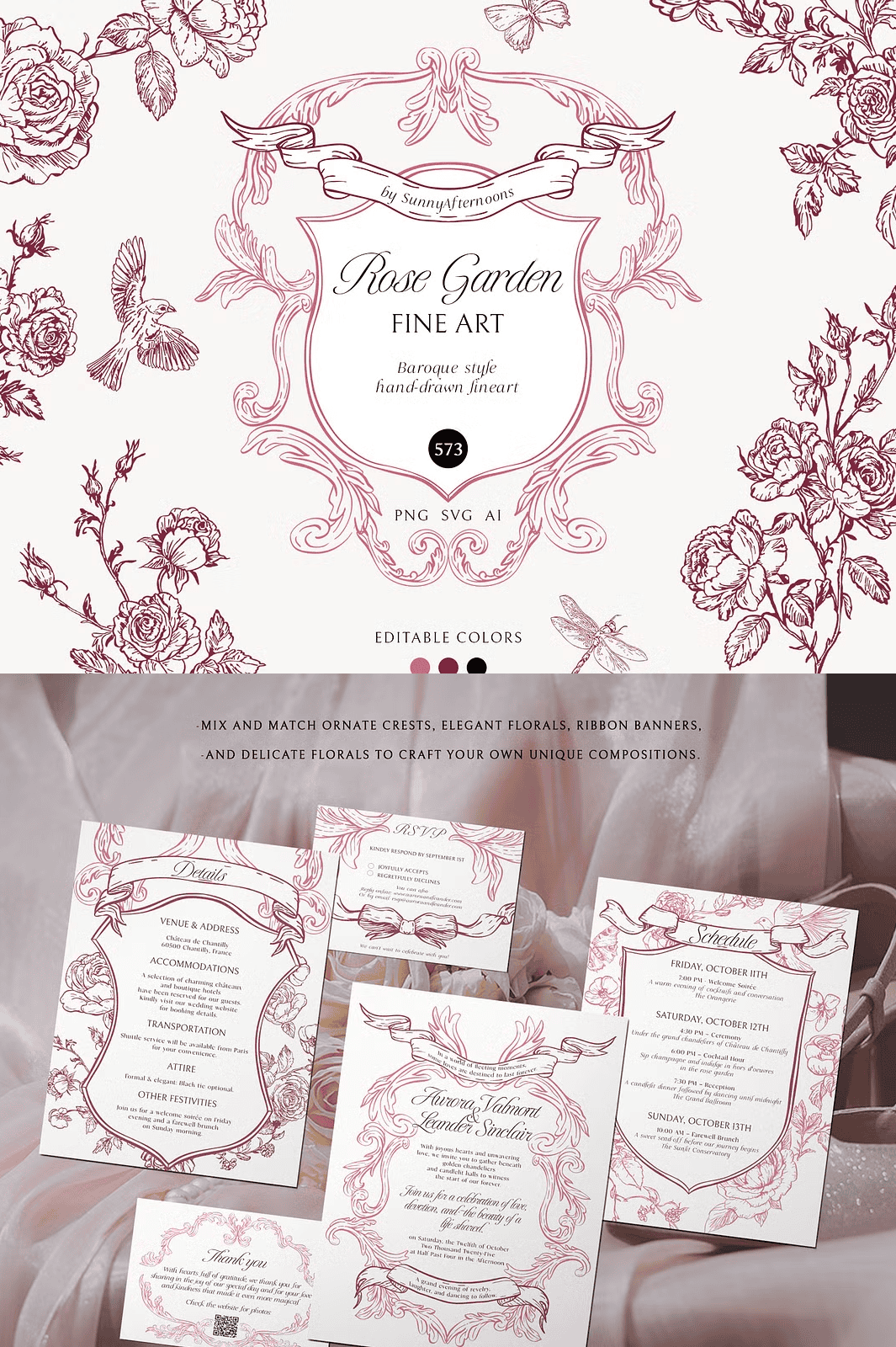 - Ready‑Made Crests, Wreaths, Arrangements, Frames, and Half‑Frames – Curated ensembles that instantly elevate stationery, packaging, and branding layouts.