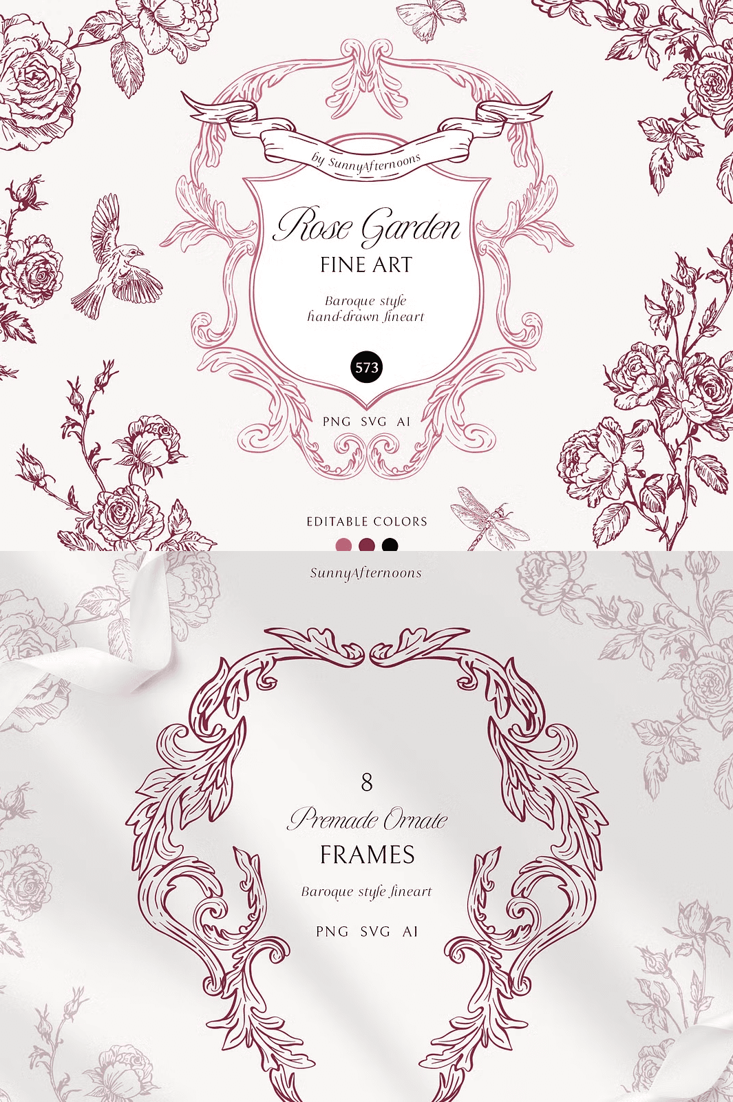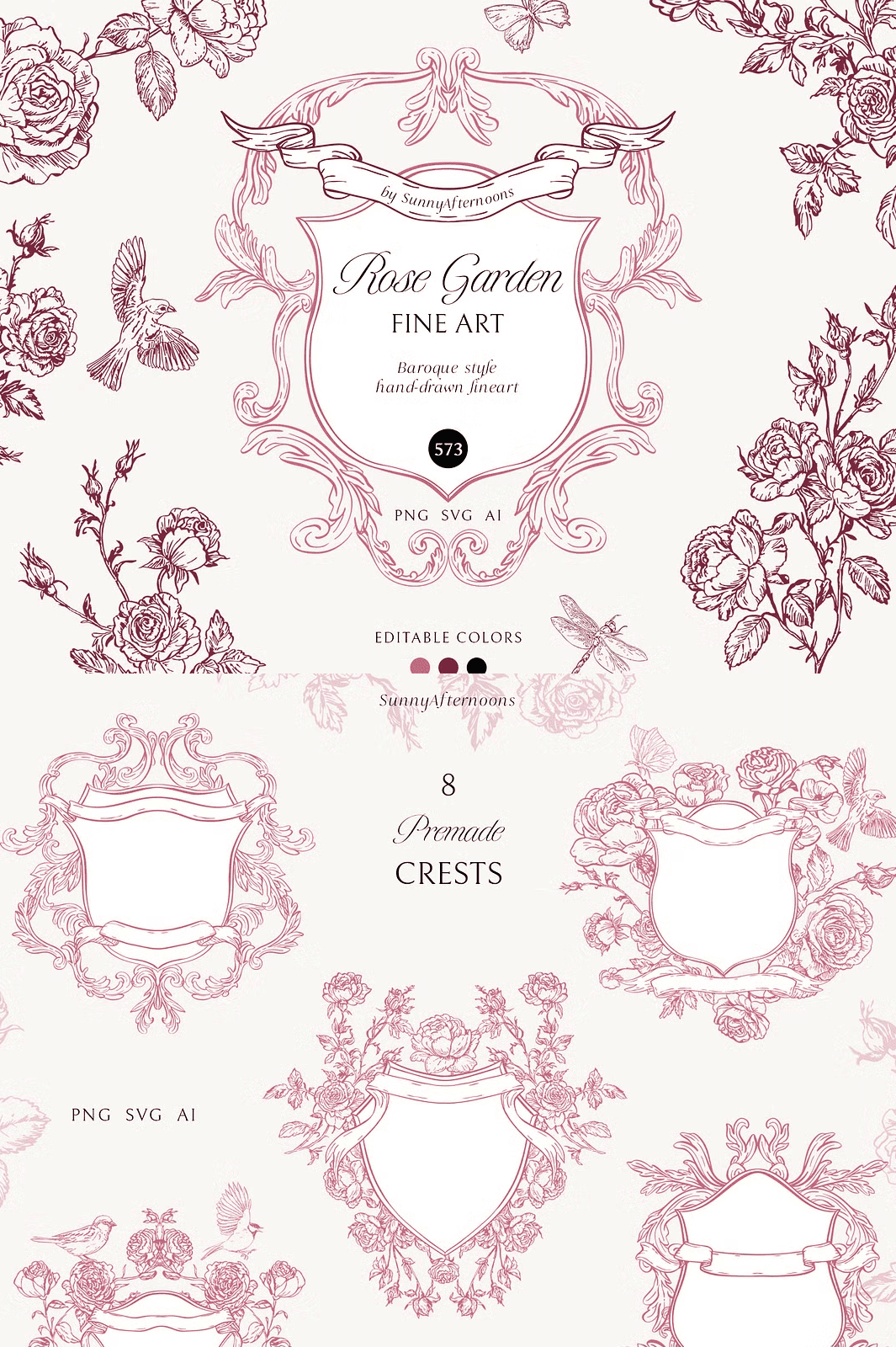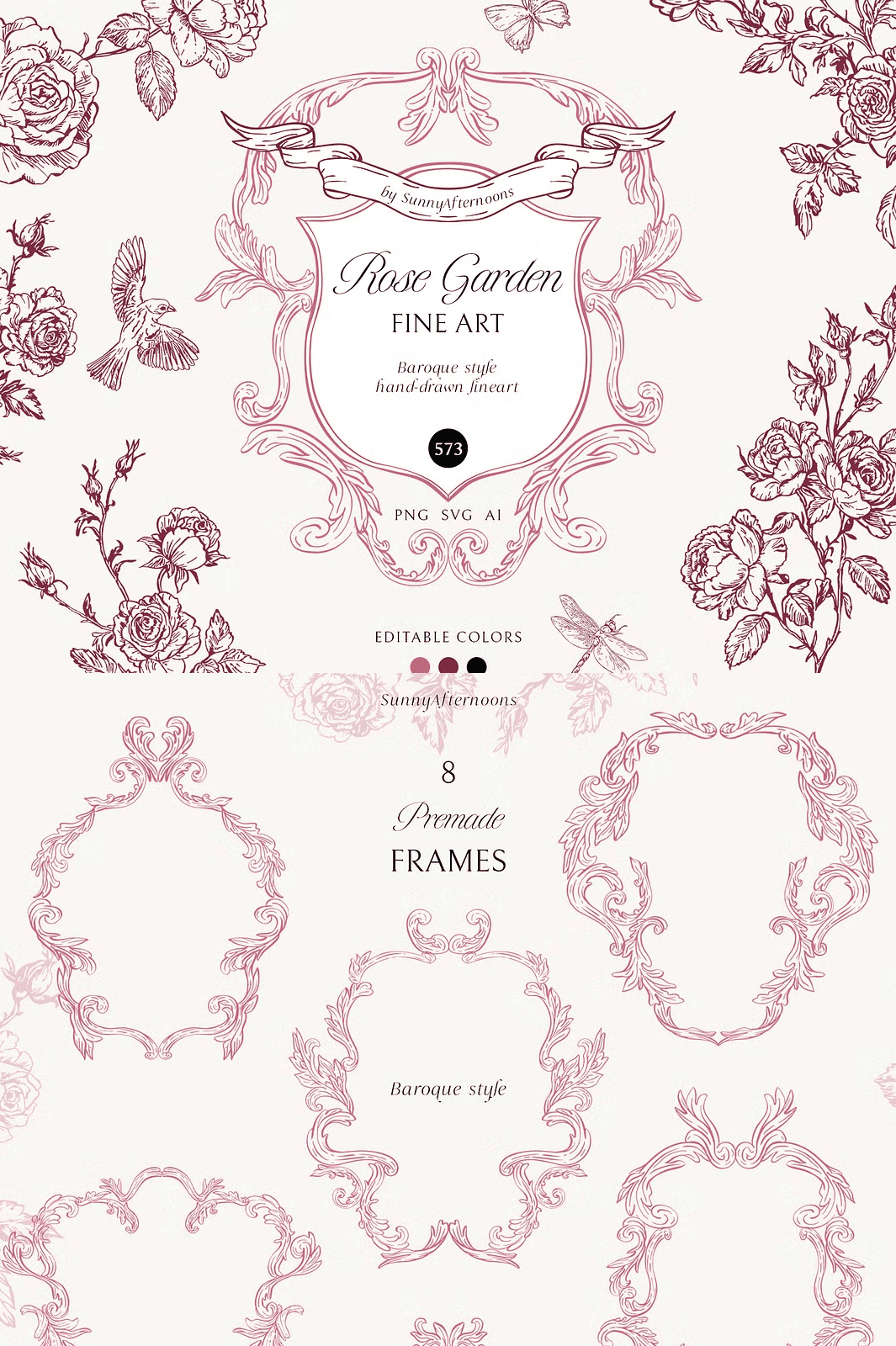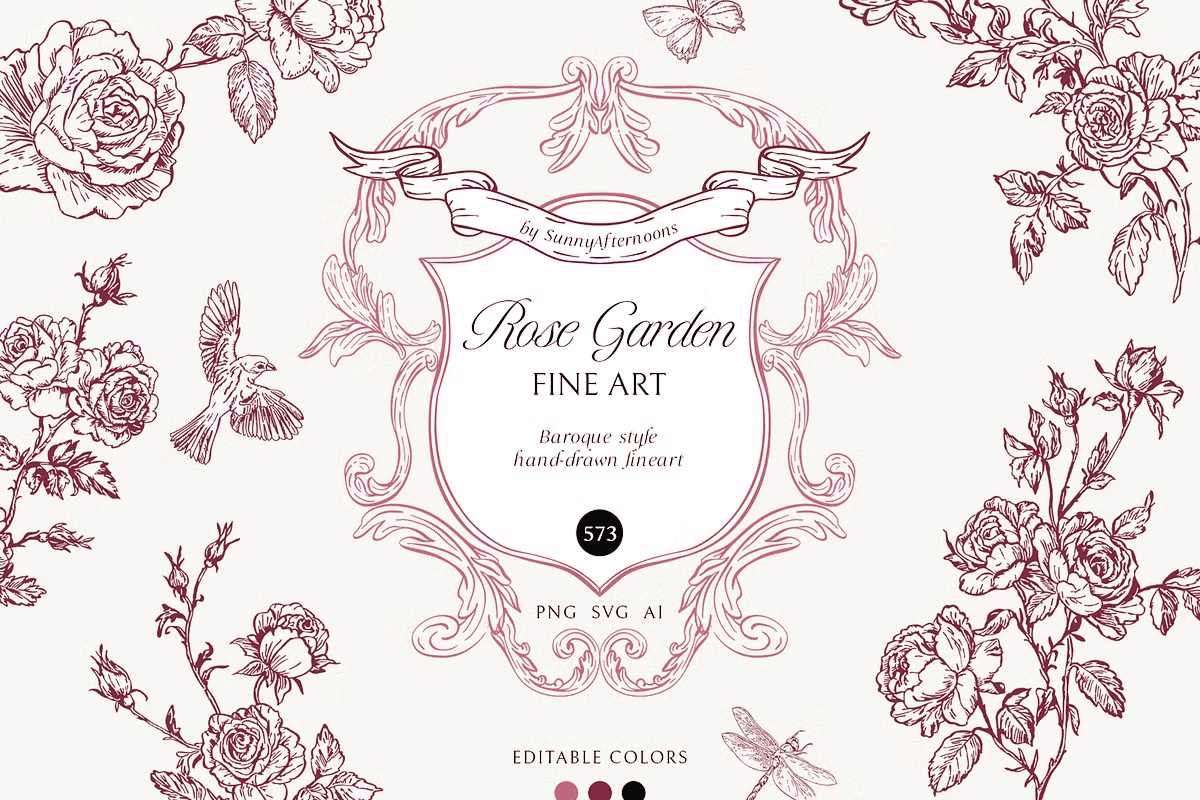 Step into a world where classic romance meets refined craftsmanship. Every element in this collection has been meticulously hand‑drawn with watercolor‑inspired line art, blending the delicate grace of baroque ornamentation with the exotic charm of Chinoiserie motifs. The result is a cohesive visual language that feels both timeless and contemporary, empowering designers to create projects that exude sophistication, nostalgia, and artistic depth.