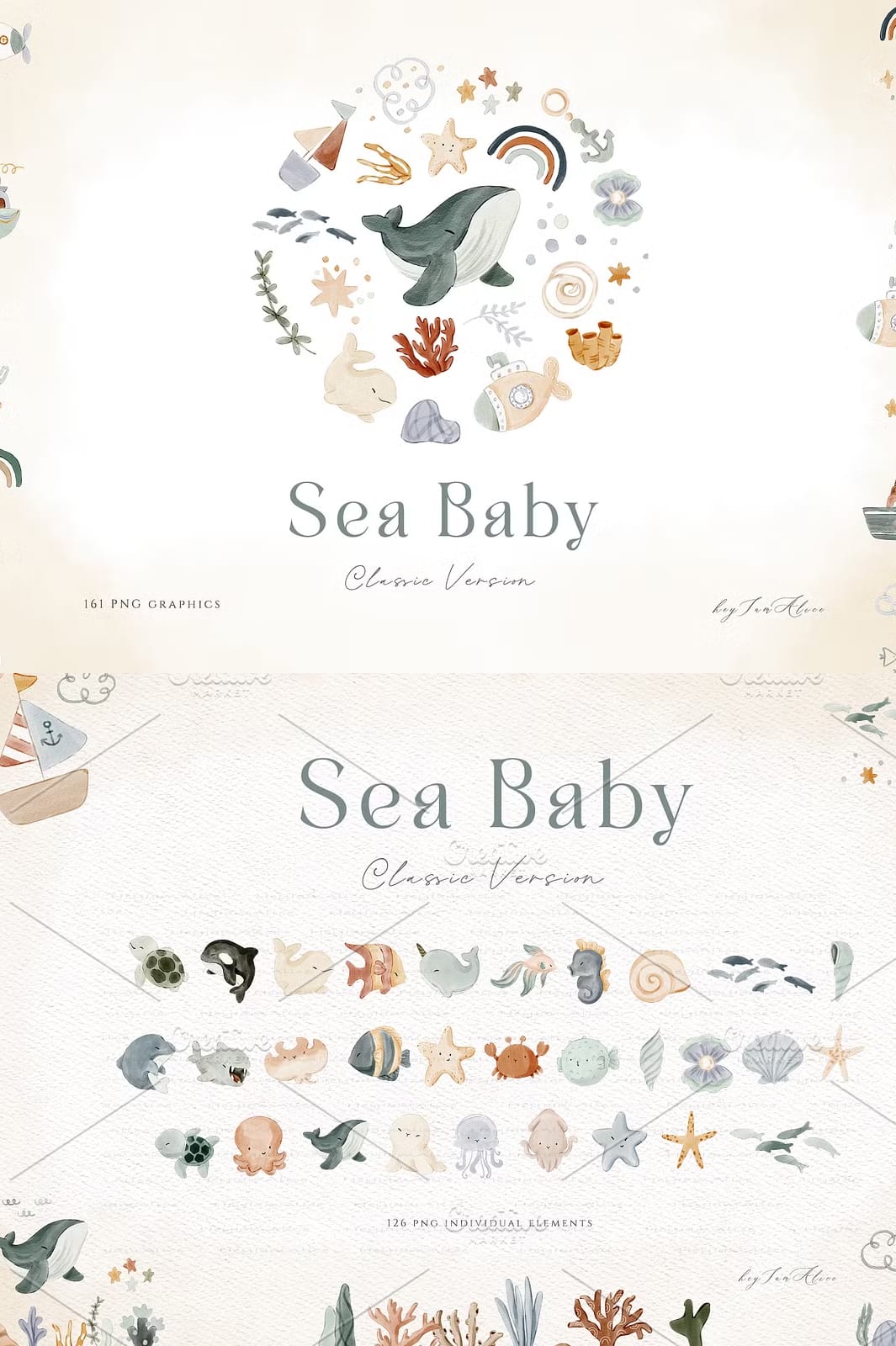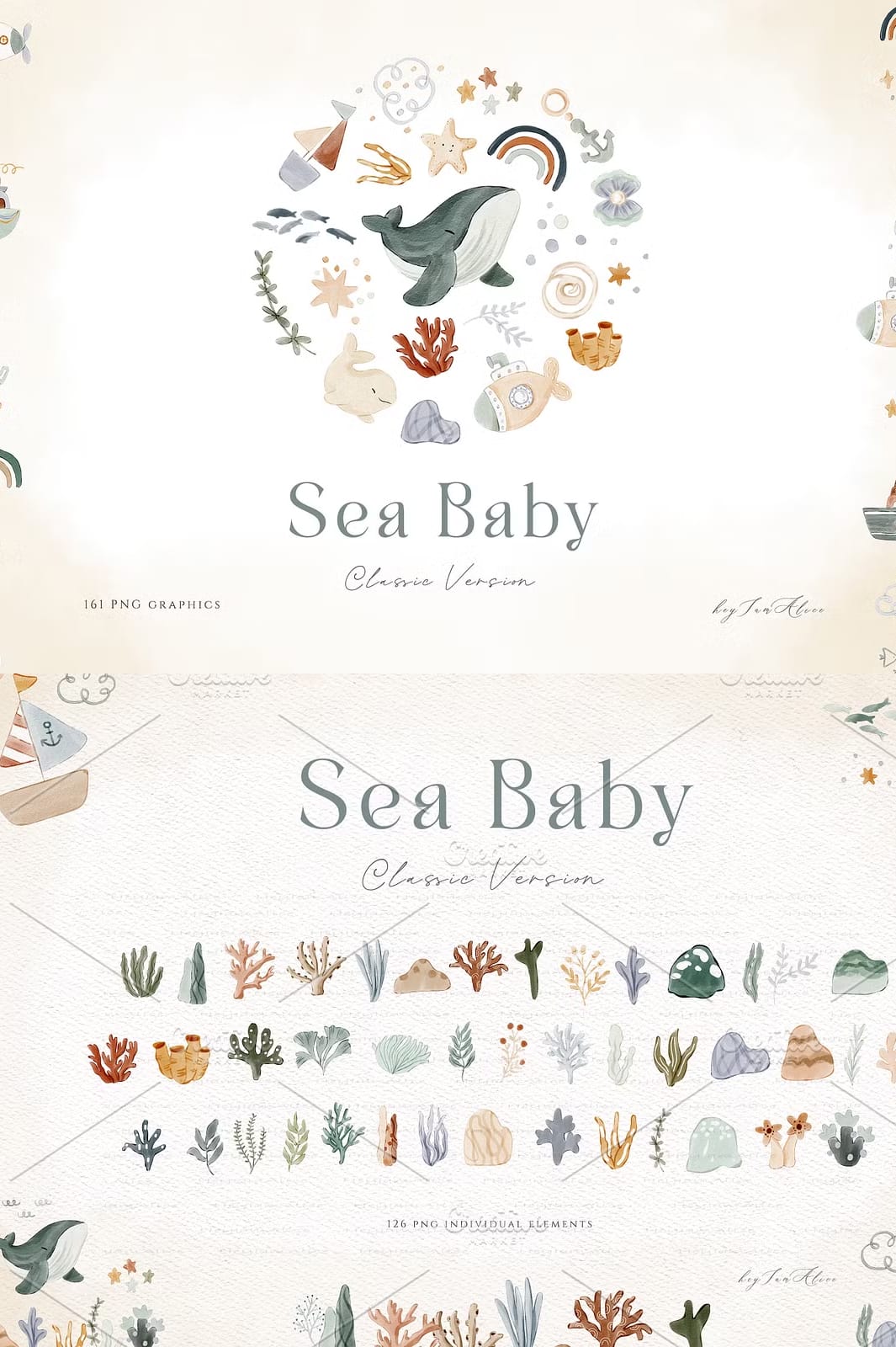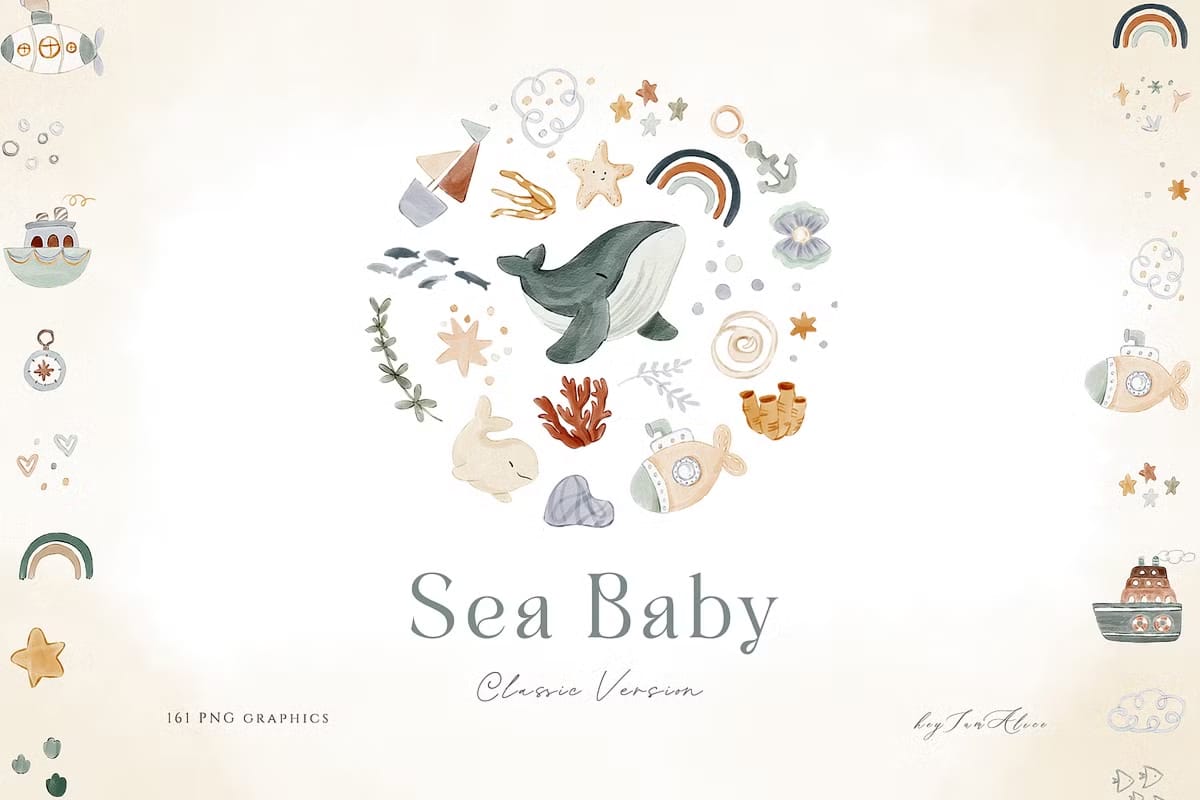 The Sea Baby Watercolor Collection offers a stunning array of 161 hand-painted watercolor elements designed to elevate your invitations, cards, nursery art, and party decorations. Each piece captures the gentle, soothing essence of the sea, making it perfect for baby showers, birthday parties, digital scrapbooking, and a wide variety of other creative applications.