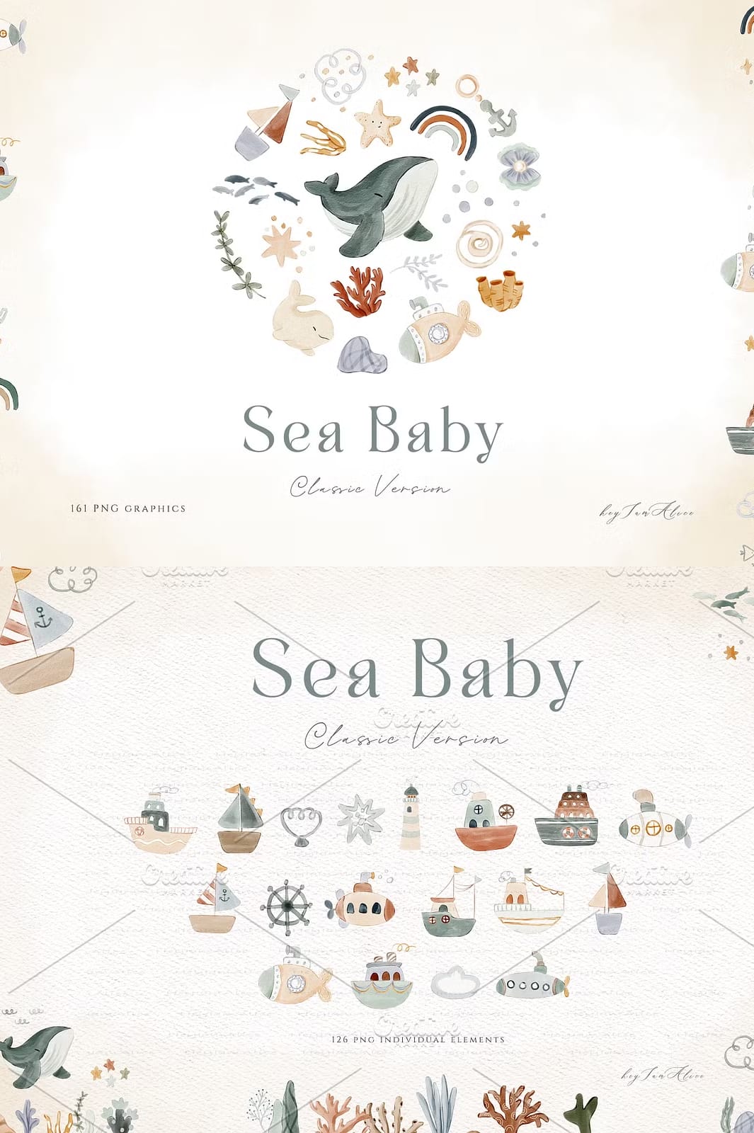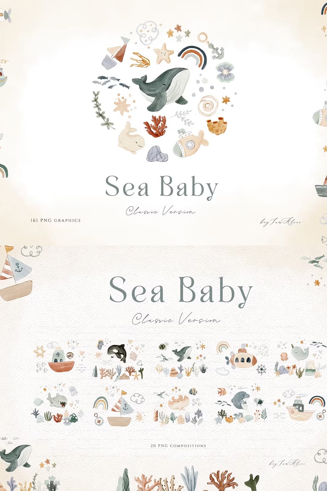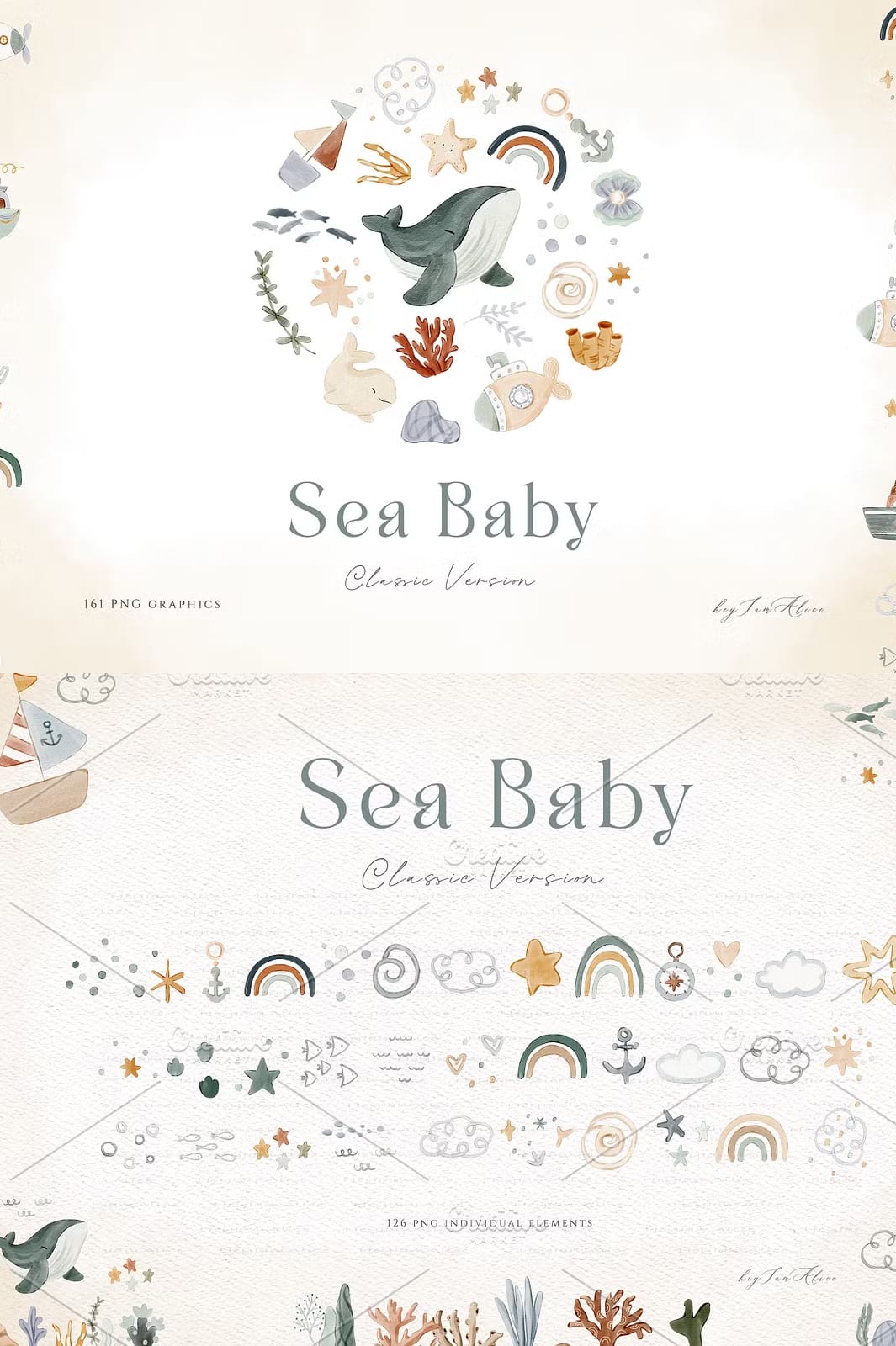 The Sea Baby Watercolor Collection offers a stunning array of 161 hand-painted watercolor elements designed to elevate your invitations, cards, nursery art, and party decorations. Each piece captures the gentle, soothing essence of the sea, making it perfect for baby showers, birthday parties, digital scrapbooking, and a wide variety of other creative applications.