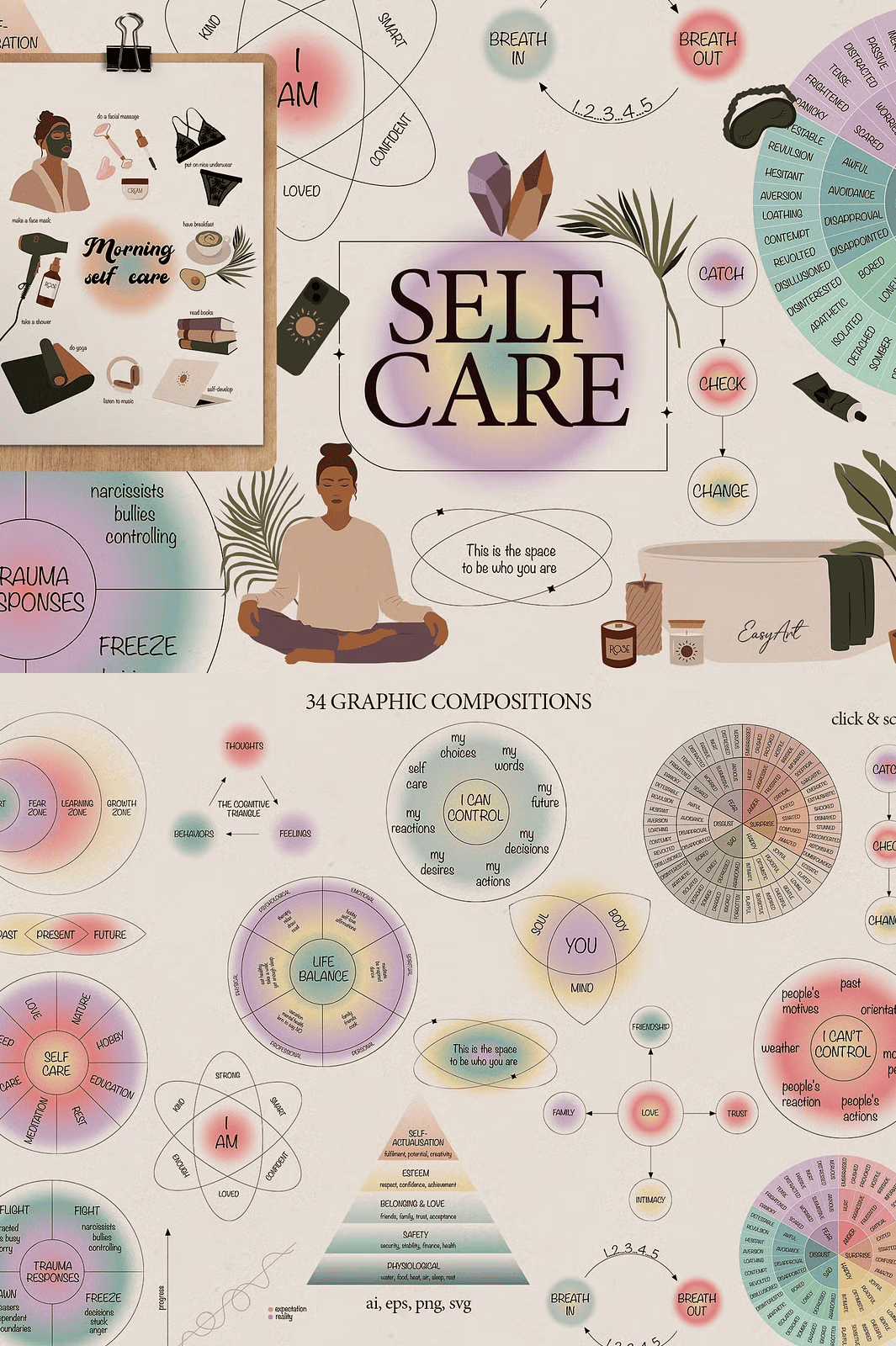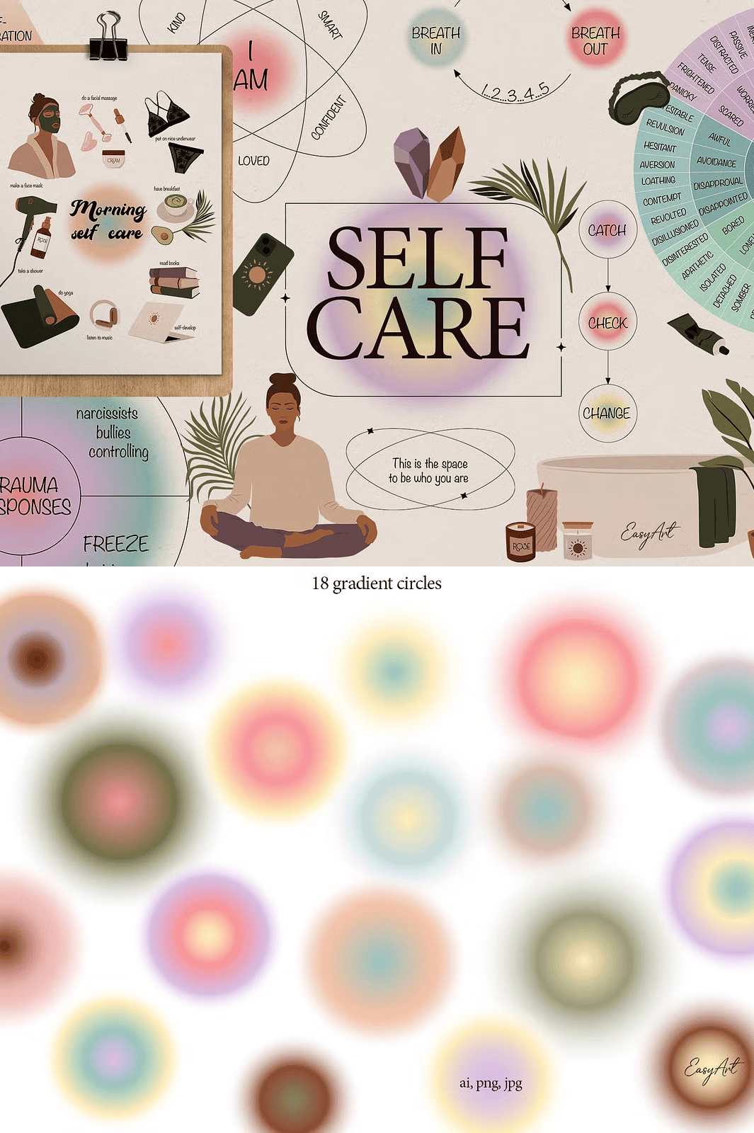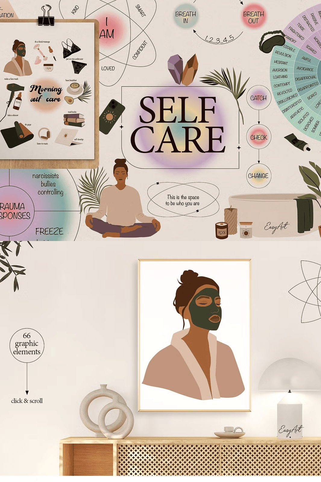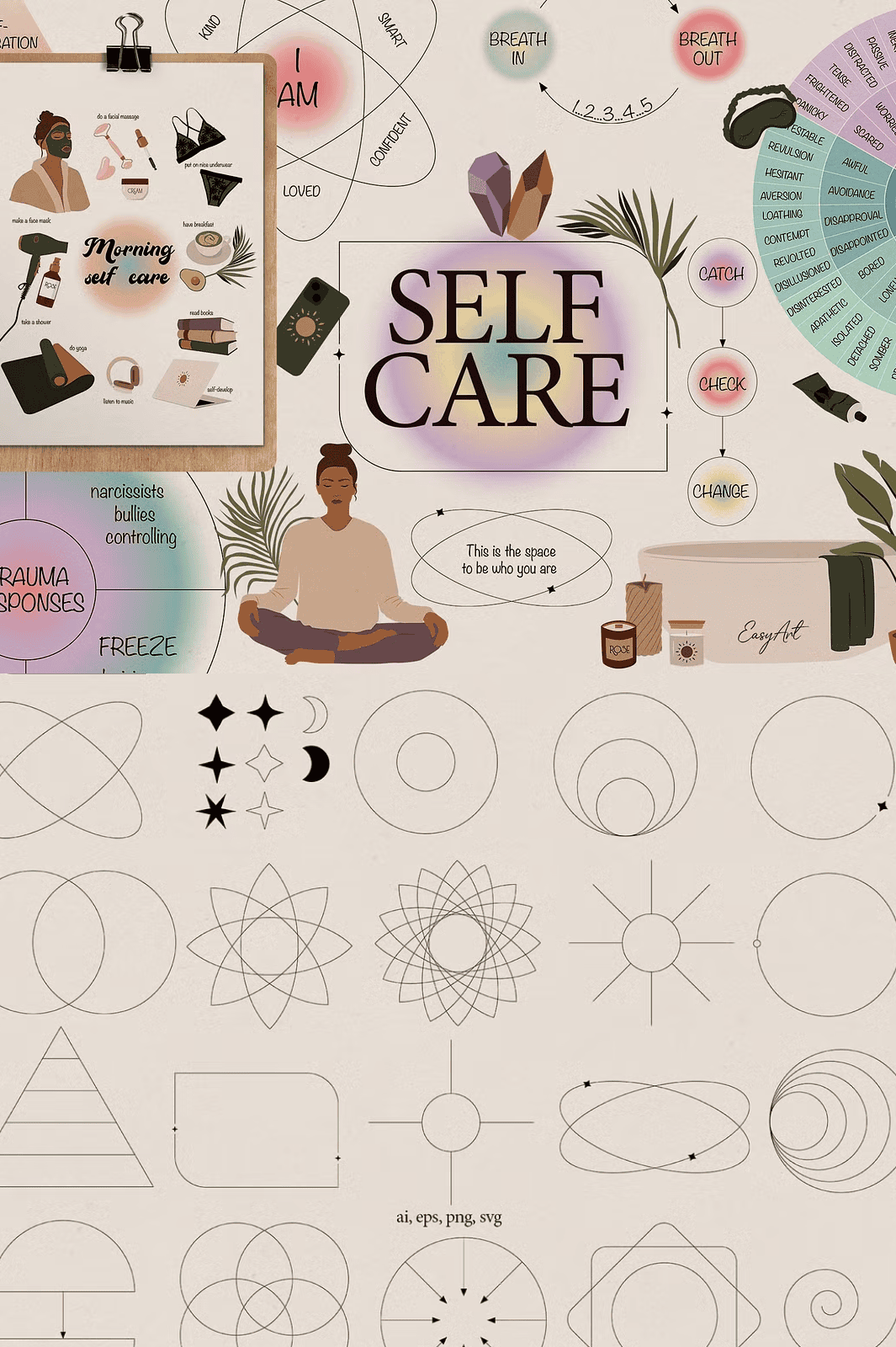 – **66 Self-Care Inspired Elements (AI, EPS, 66 SVG, 66 PNG – 300 DPI)** – Includes affirmations, mindfulness symbols, calming icons, and emotion-based visuals