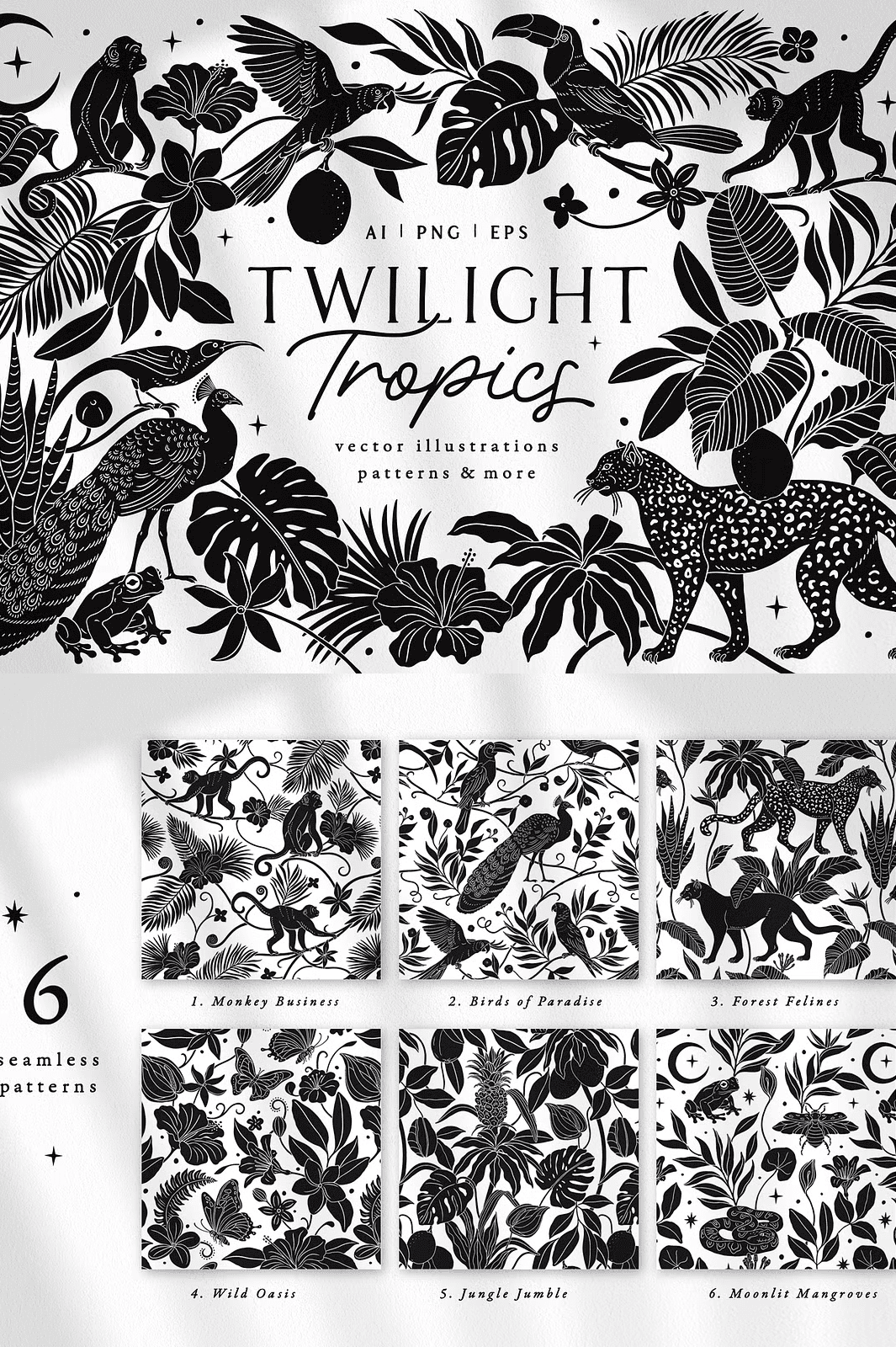 – **6 Seamless Vector Repeat Patterns** — Monochromatic, clean, and ready to use as backgrounds, textiles, or packaging designs. Includes transparent background versions for effortless integration over any color or image.