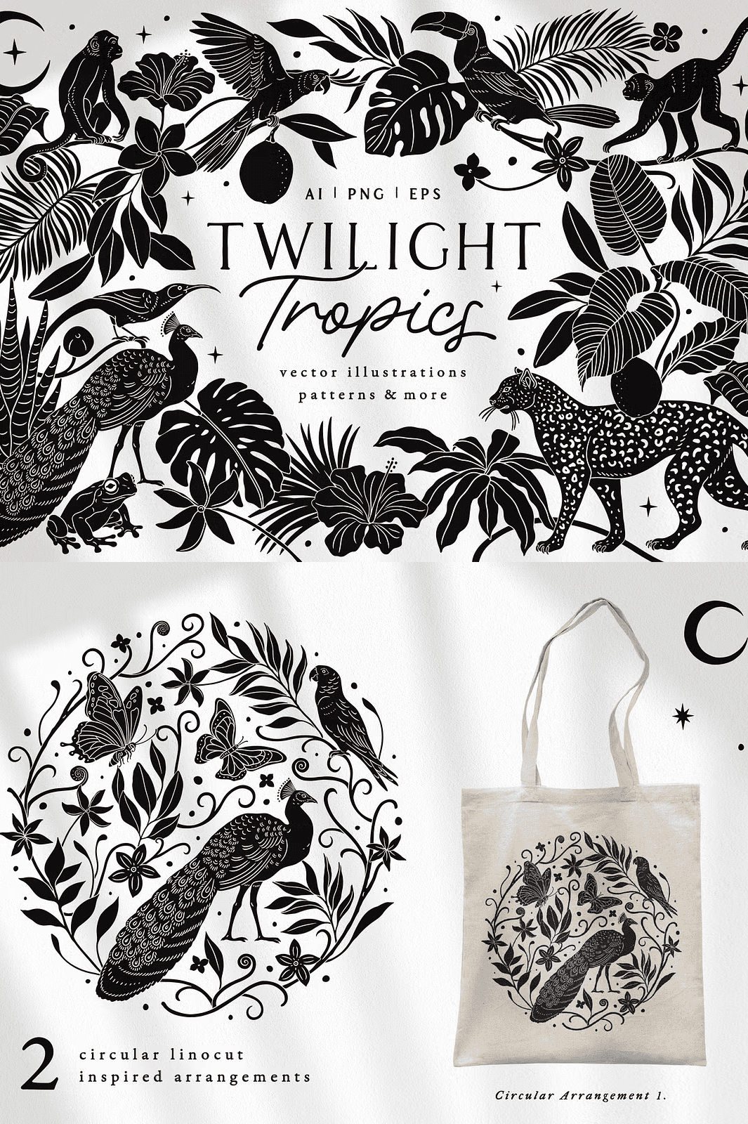 Feel the pulse of the wild with **Twilight Tropics**, a bold and enchanting vector collection inspired by traditional linocut and woodcut aesthetics. This dynamic set brings the untamed elegance of tropical island nights to life through meticulously hand-drawn illustrations that capture the mystery, rhythm, and raw charm of the jungle after dark. From glowing fireflies to silhouetted monstera leaves, every element radiates atmosphere, energy, and storytelling depth.