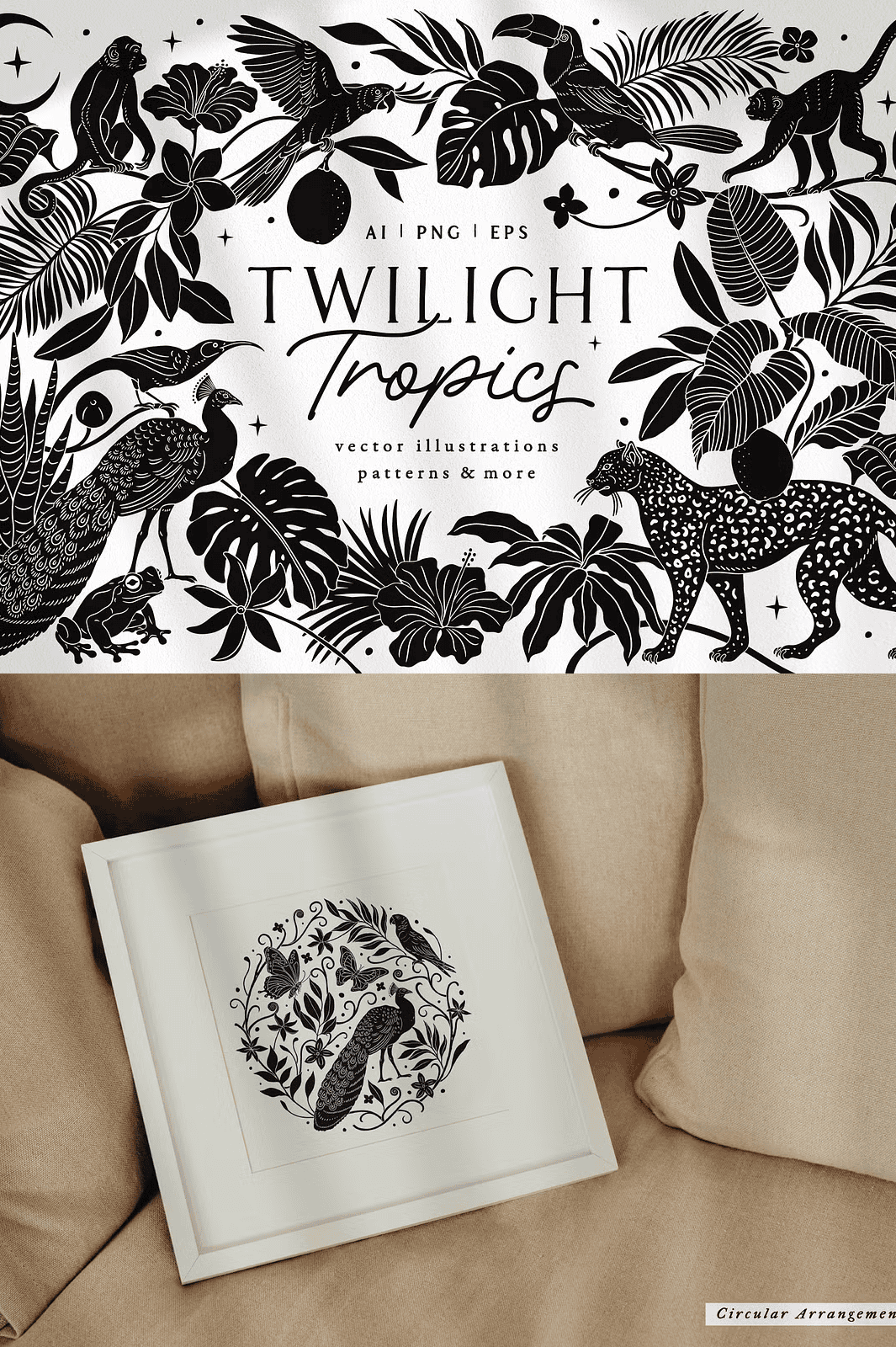Designed for creators who crave authenticity and versatility, Twilight Tropics merges classic printmaking techniques with modern digital precision. Whether you’re crafting event invitations, designing fabric patterns, building brand identities, or producing wall art, this collection delivers a strong visual language that stands out in any creative space.