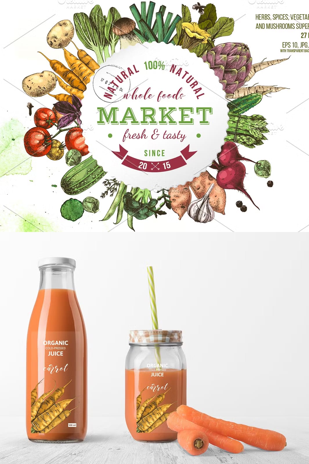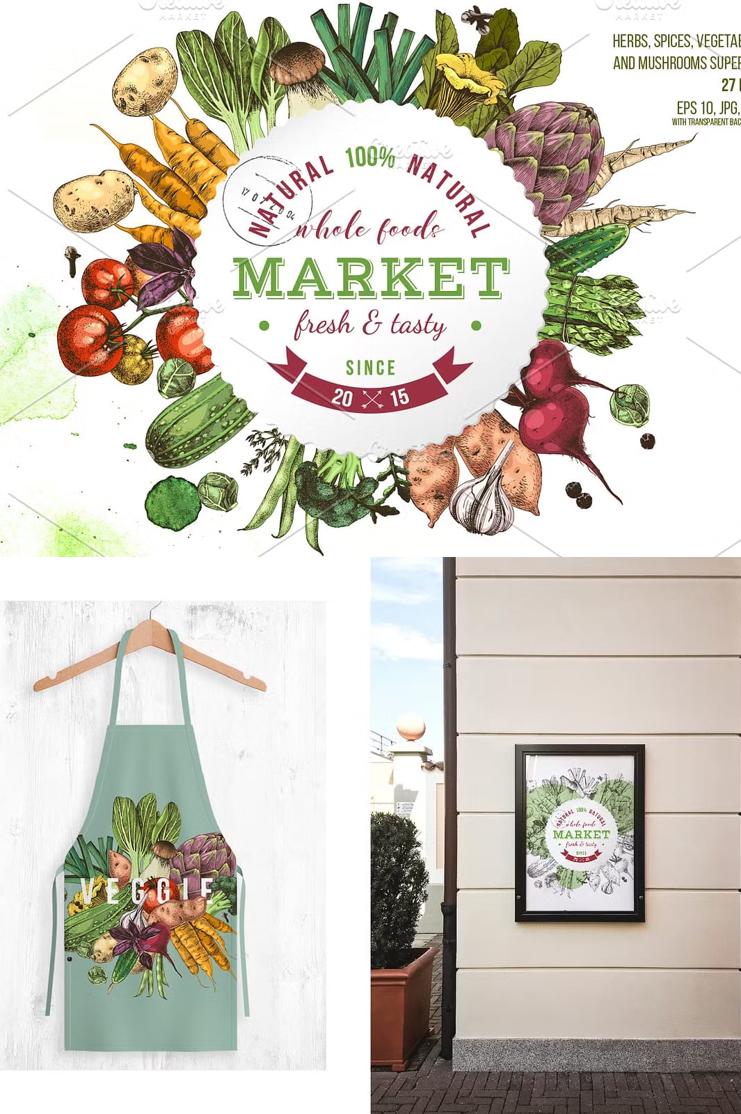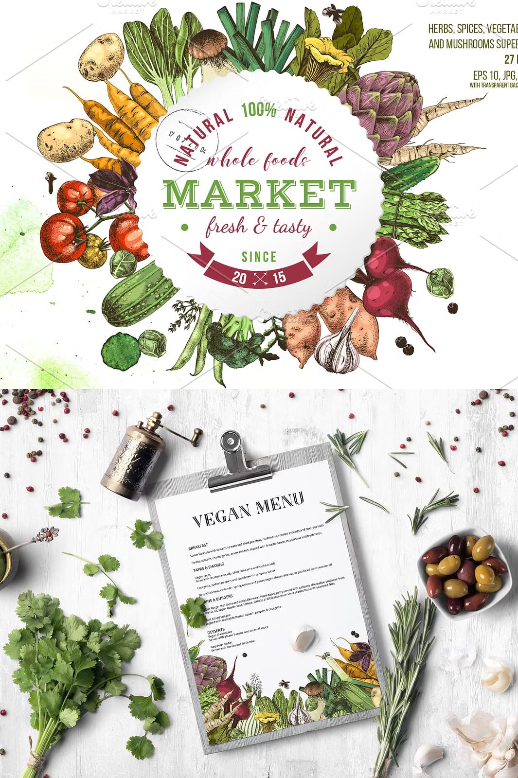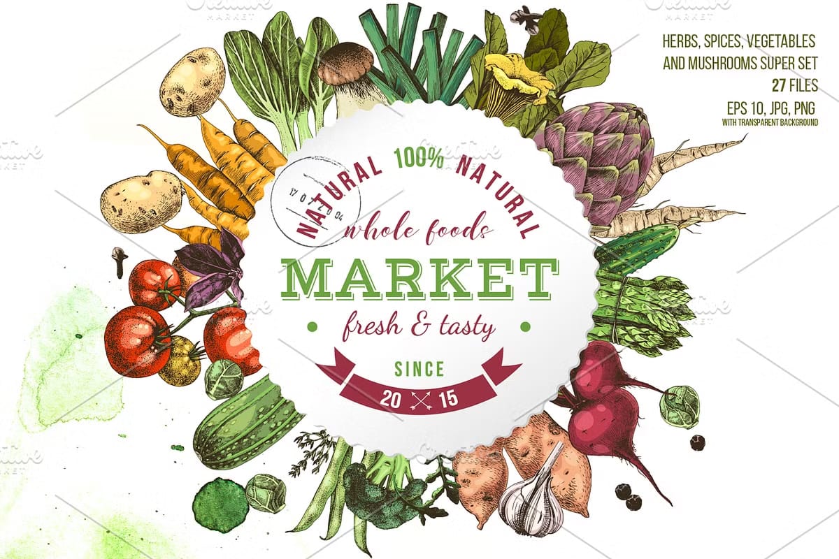 • Two distinctive sets (monochrome and colorful) featuring popular vegetables and herbs such as carrot, potato, onion, thyme, cherry tomatoes, porcini mushrooms, tomatoes branch, and more.