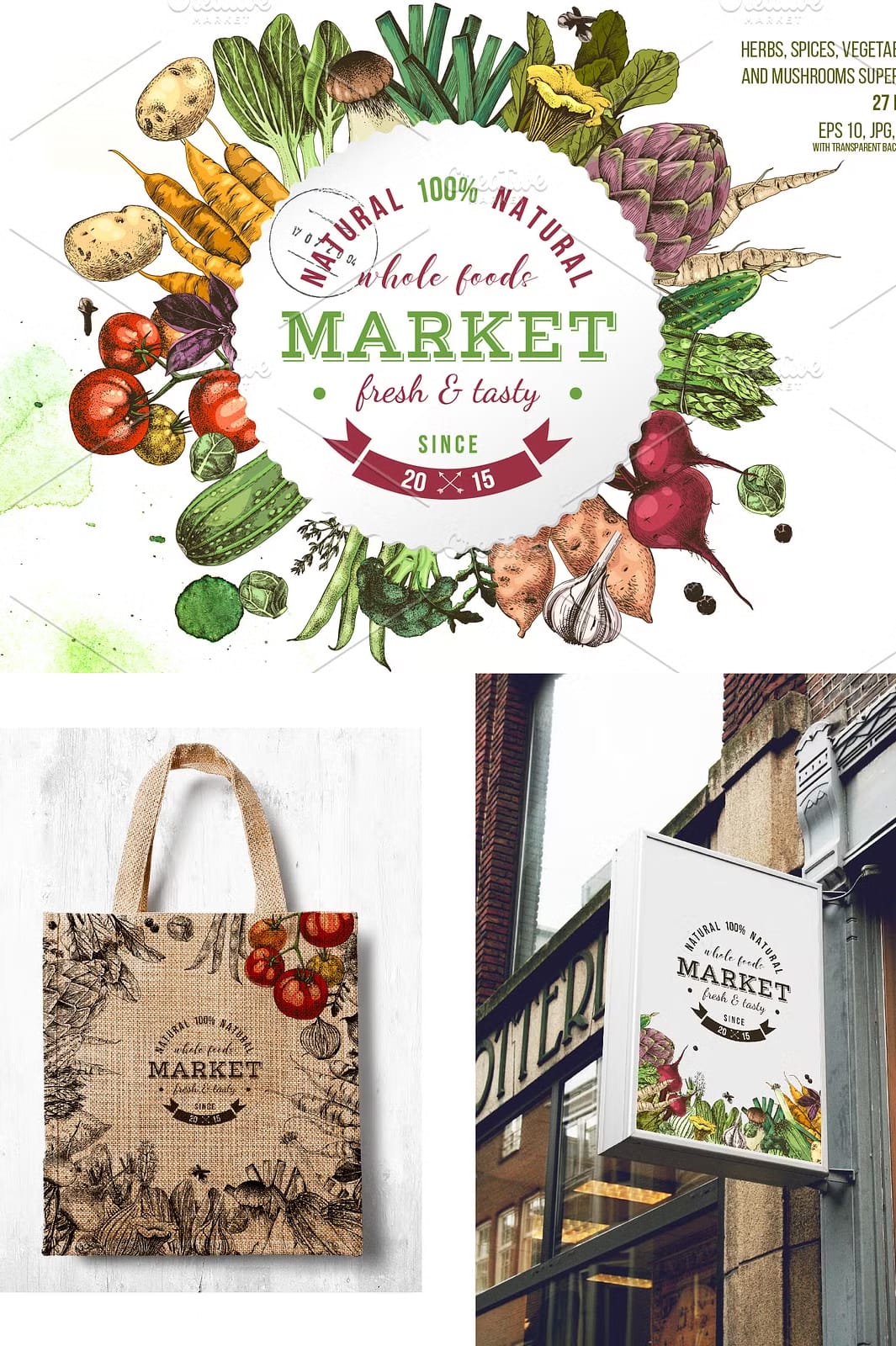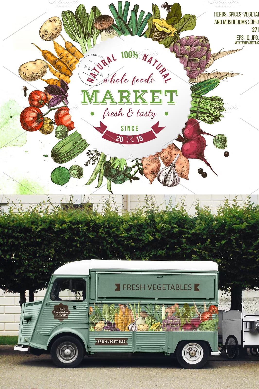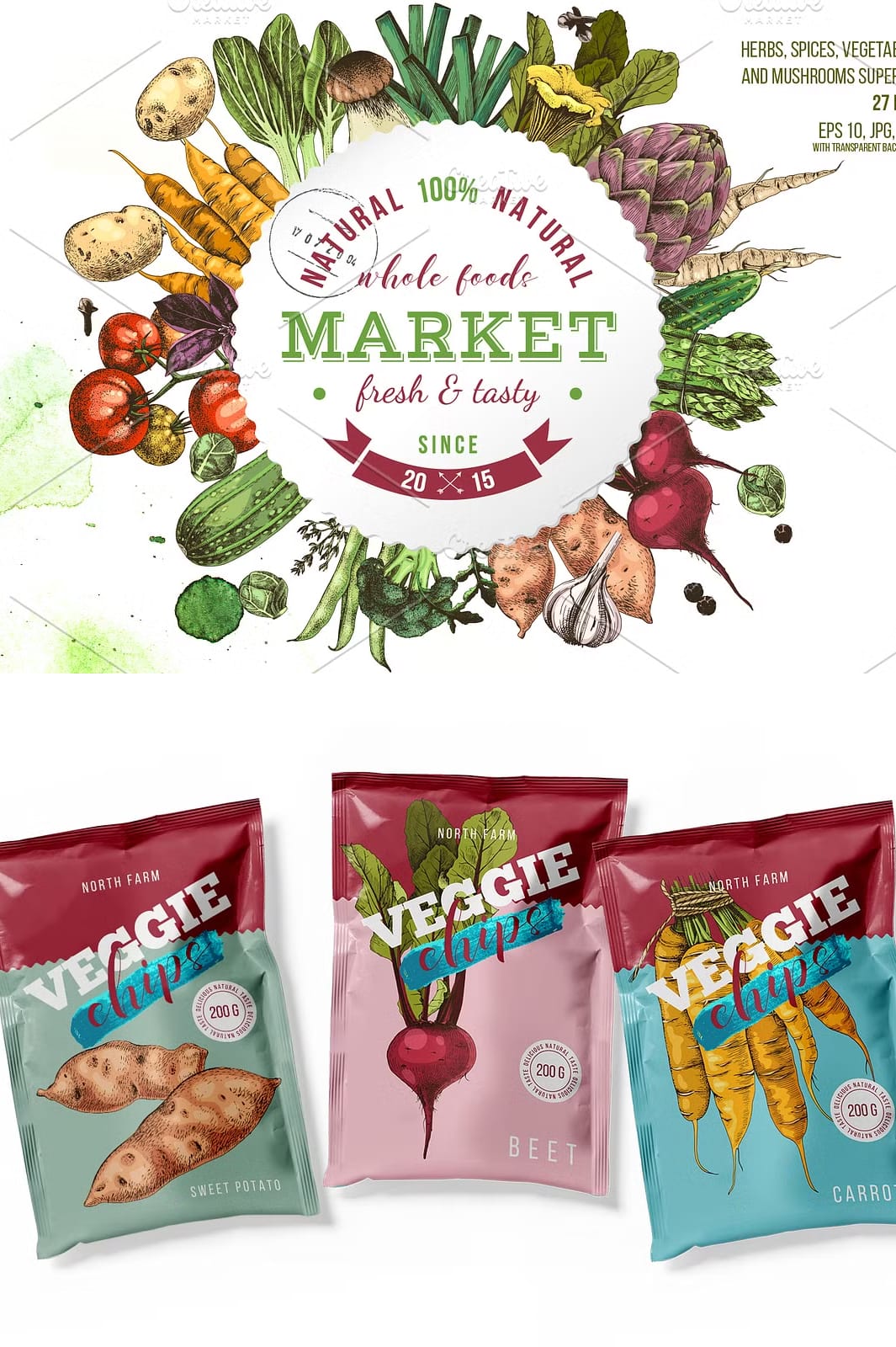• Two distinctive sets (monochrome and colorful) featuring popular vegetables and herbs such as carrot, potato, onion, thyme, cherry tomatoes, porcini mushrooms, tomatoes branch, and more.