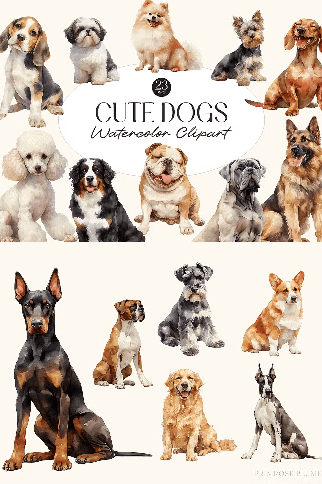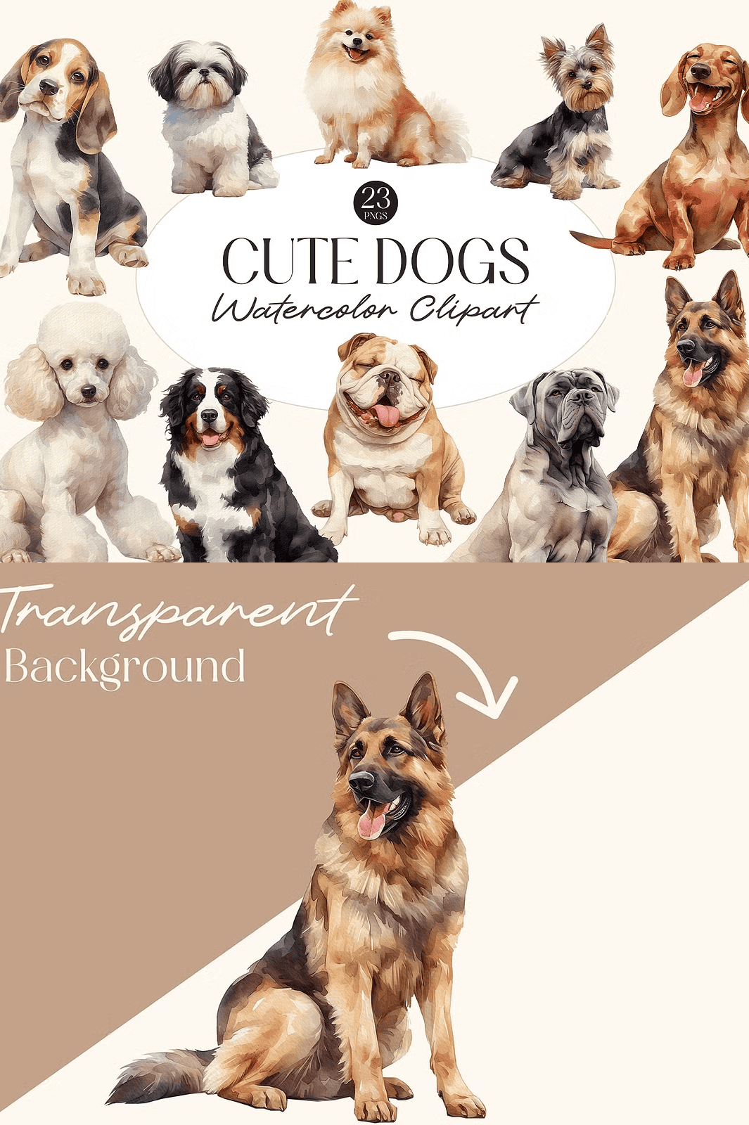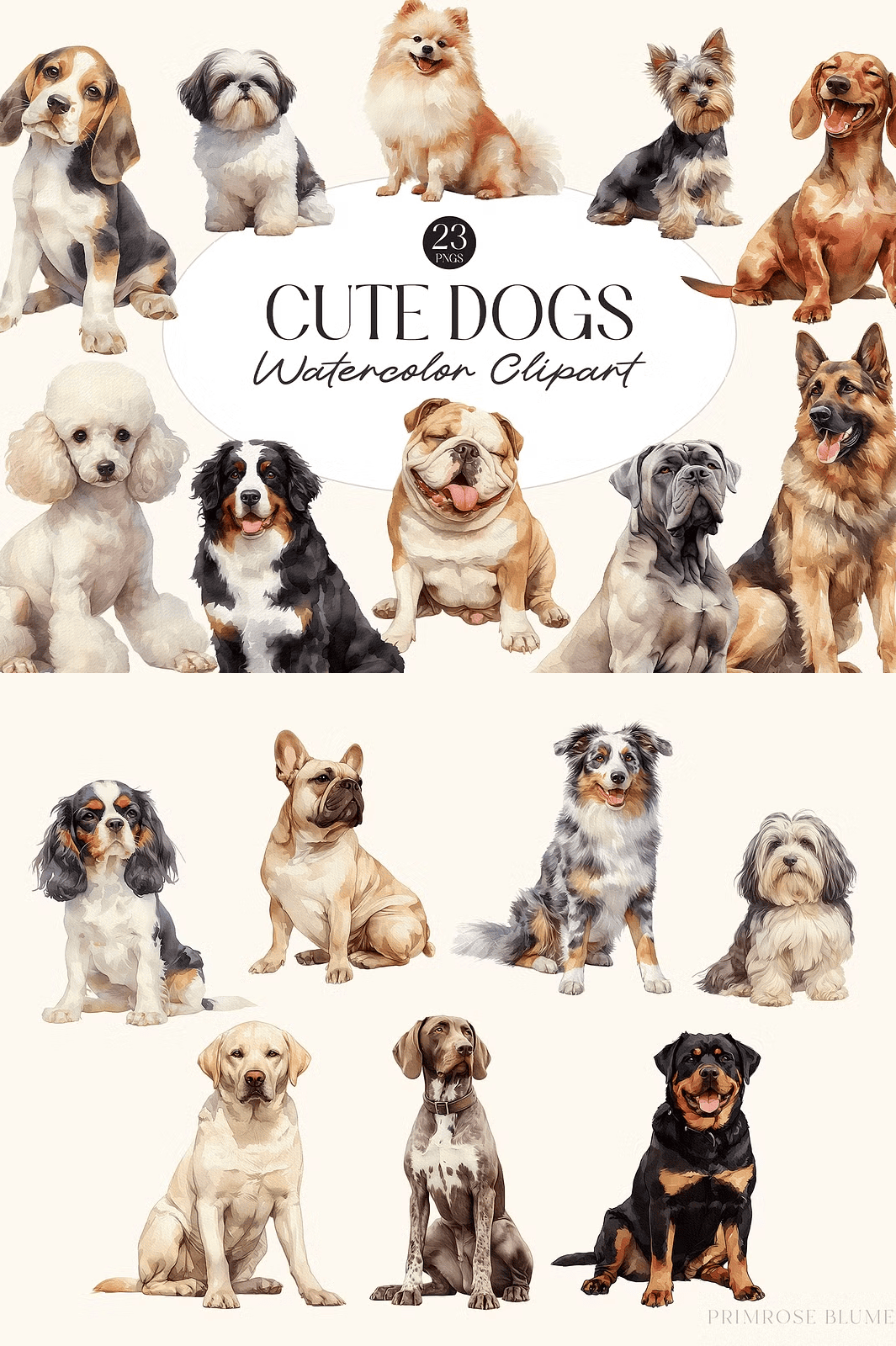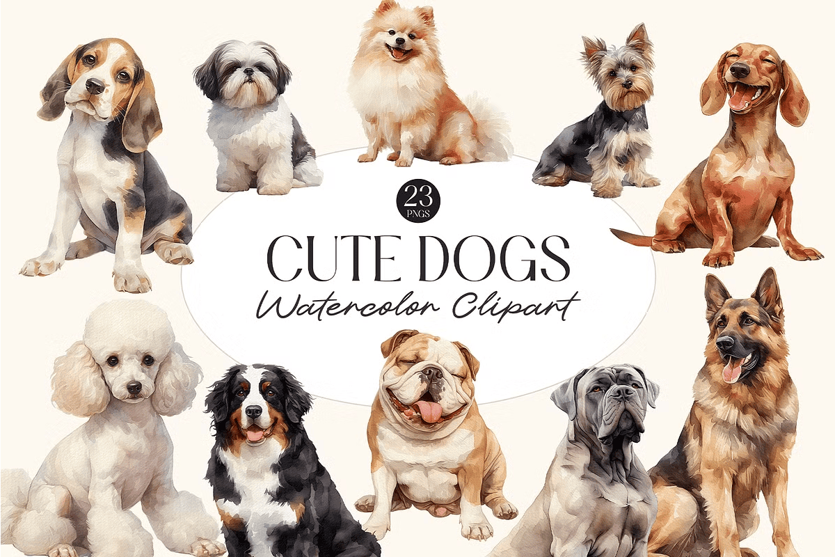 Unleash the heartwarming charm of adorable watercolor dogs with this vibrant digital clip art bundle. Designed for pet lovers, graphic designers, crafters, and DIY enthusiasts, these 23 meticulously crafted illustrations burst with personality and artistic flair. Each dog is painted with soft watercolor textures, delicate brushwork, and warm, inviting tones—bringing joy and character to every project you touch.