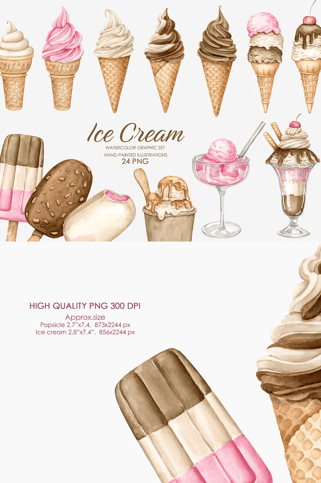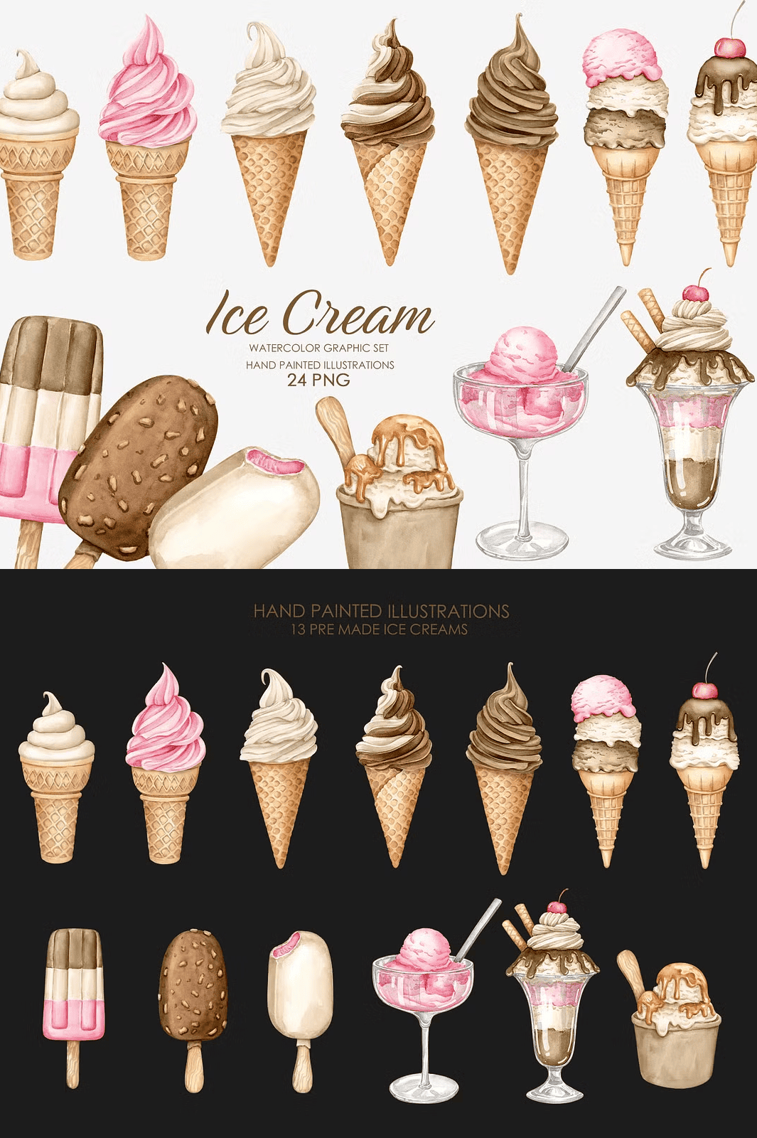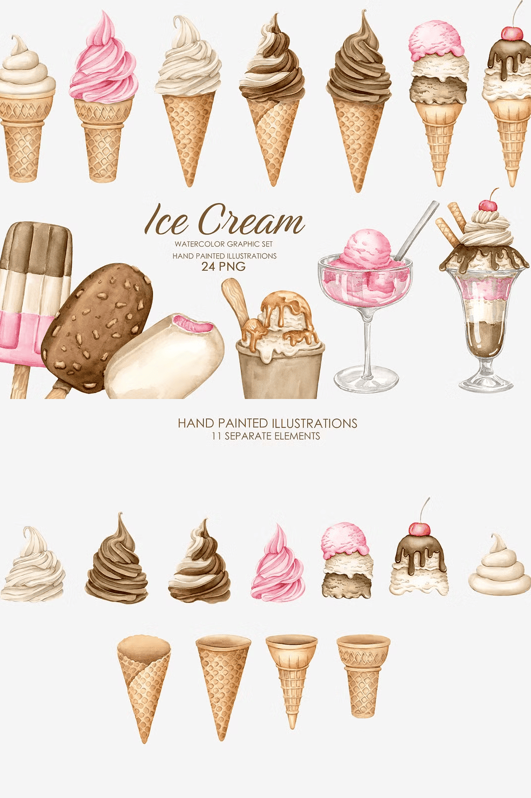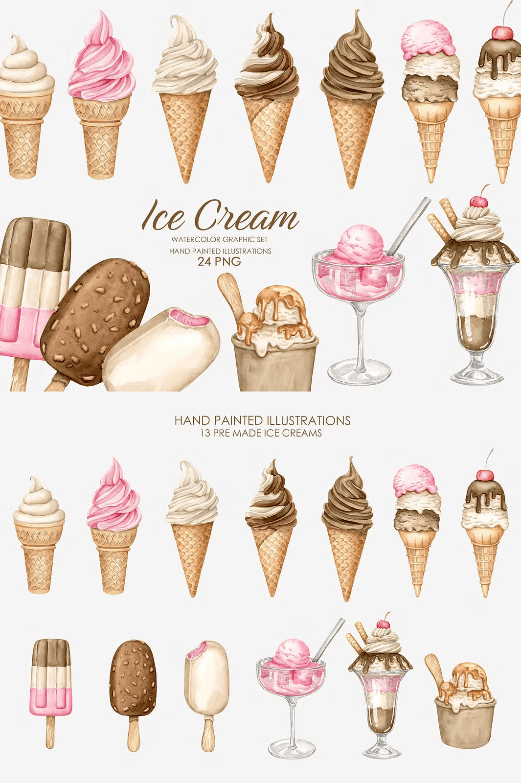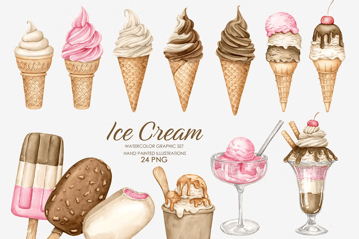 - 25 hand-painted watercolor ice cream illustrations